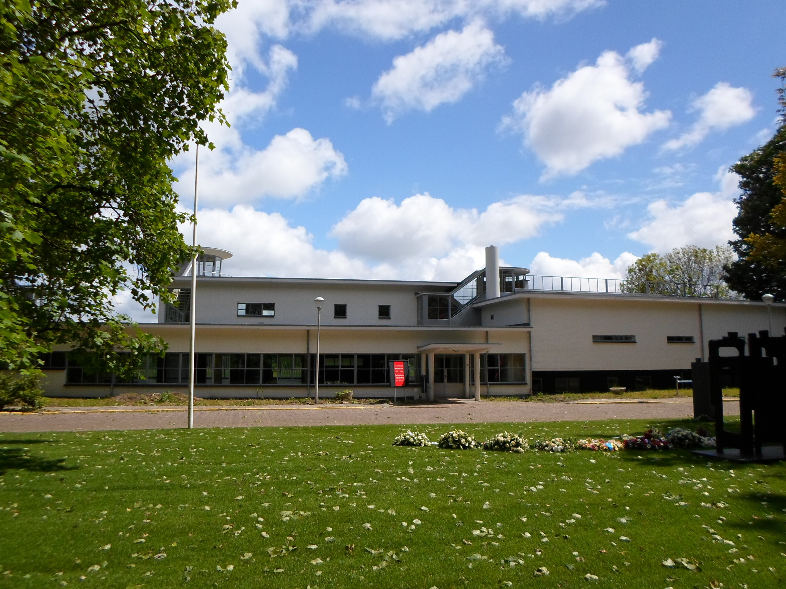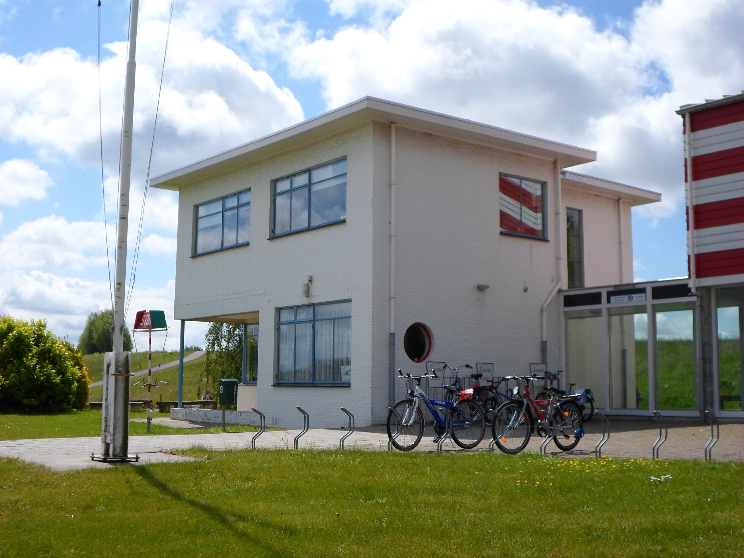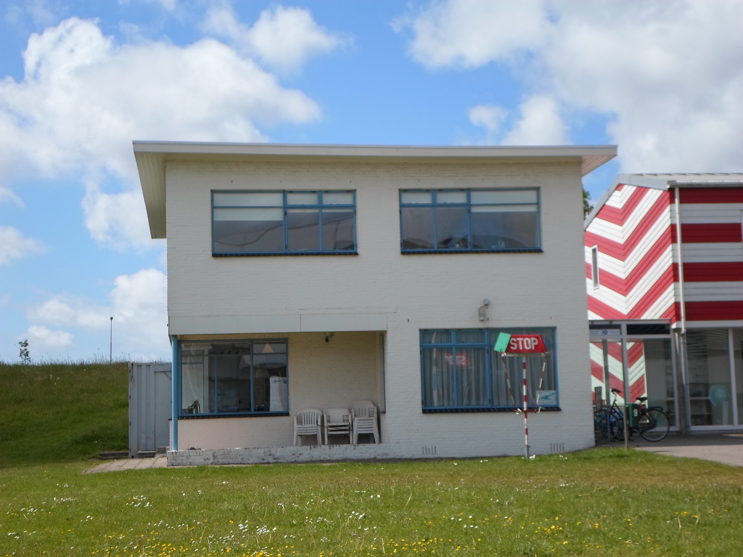 NLS-GEBOUWIn oorsprong als hoofdzetel van de NATIONALE LUCHTVAART SCHOOL (NLS) bestemd gebouw, opgetrokken in 1939 naar nieuw- zakelijk ontwerp van H.F. Mertens op min of meer T-vormige plattegrond met lage, tapse westvleugel onder oplopend, gebogen dak met overstek en de lange, licht concave oostvleugel van twee in- en uitspringende bouwlagen en kelder onder zeer licht geknikt luifeldak. De gemetselde muren zijn witgesausd en bevatten in oorsprong alle stalen kozijnen en buitendeuren. Links in de oostgevel bevindt zich een gedenksteen die blijkens opschrift is geplaatst door de toenmalige minister van Defensie.