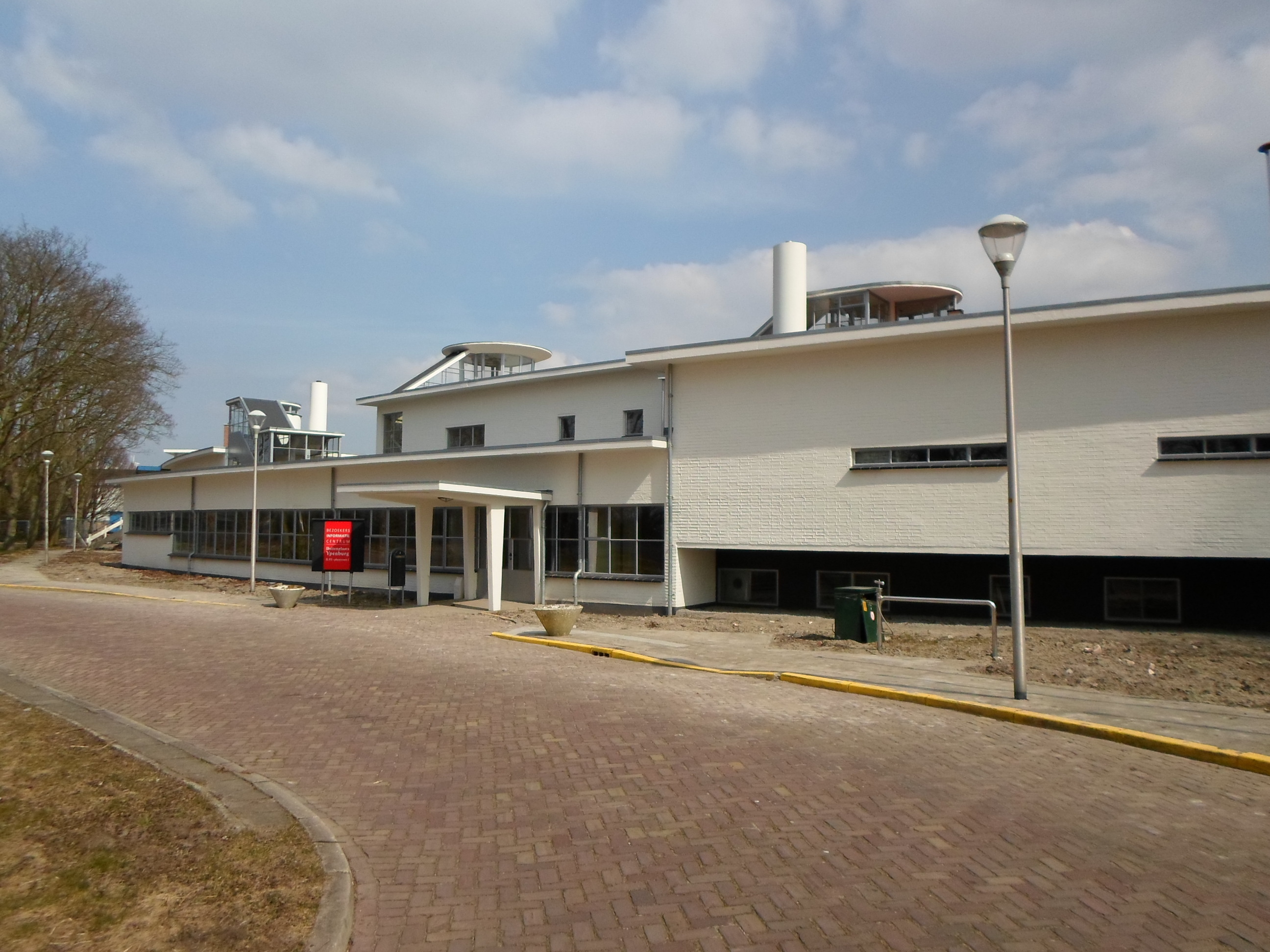 STATIONSGEBOUW YPENBURGNaar functionalistisch ontwerp van J.A. Brinkman en L.C. van der Vlugt op concave plattegrond met in- en uitspringende bouwvolumes uitgevoerd STATIONSGEBOUW, hoofdgebouw van het luchthavencomplex Ypenburg (1935-37), met een uitbreiding aan de noordzijde naar ontwerp van M. Zwanenburg.