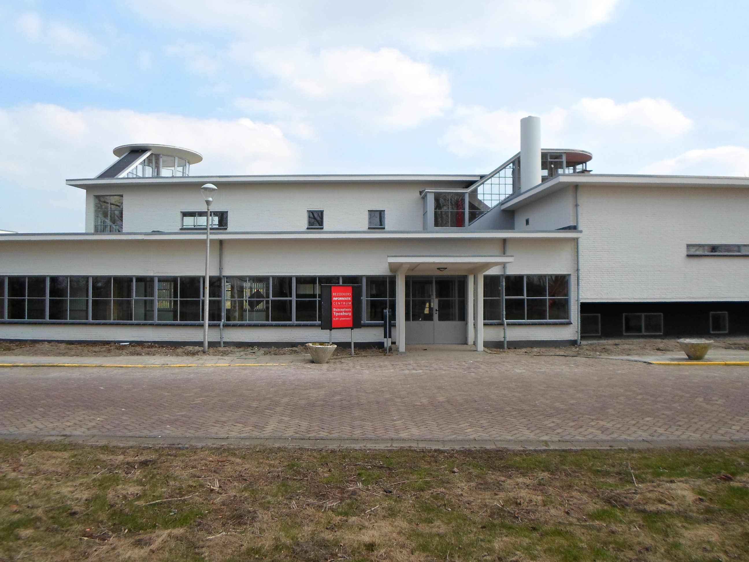 PORTIERSWONING YPENBURGOp onregelmatige grondslag met twee bouwlagen in cubische vormen onder plat, licht overstekend luifeldak gebouwd woonhuis, in oorsprong bestemd als PORTIERSWONING, ontworpen in nieuw-zakelijke trant door M. Zwanenburg (1937). De bakstenen gevels, in oorsprong witgesausd op zwarte plint, zijn boven de vensters - in oorsprong met stalen, zilvergroene kozijnen en zwarte lekdorpels - voorzien van betonnen lateien. Bij de ZO-hoek zijn de van omlopende vensterpartijen en een ronde stalen hoekkolom voorziene gevels op de beganegrond teruggerooid ten behoeve van een overhuifd, betegeld terras; de uitkragende verdieping steunt hier op een stalen I-kolom op de ZO- hoek. De overluifelde ingang, met betegelde stoep en glazen windscherm aan de W-zijde, bevindt zich midden in de N-gevel, waarvan het rechtergedeelte is teruggerooid.
