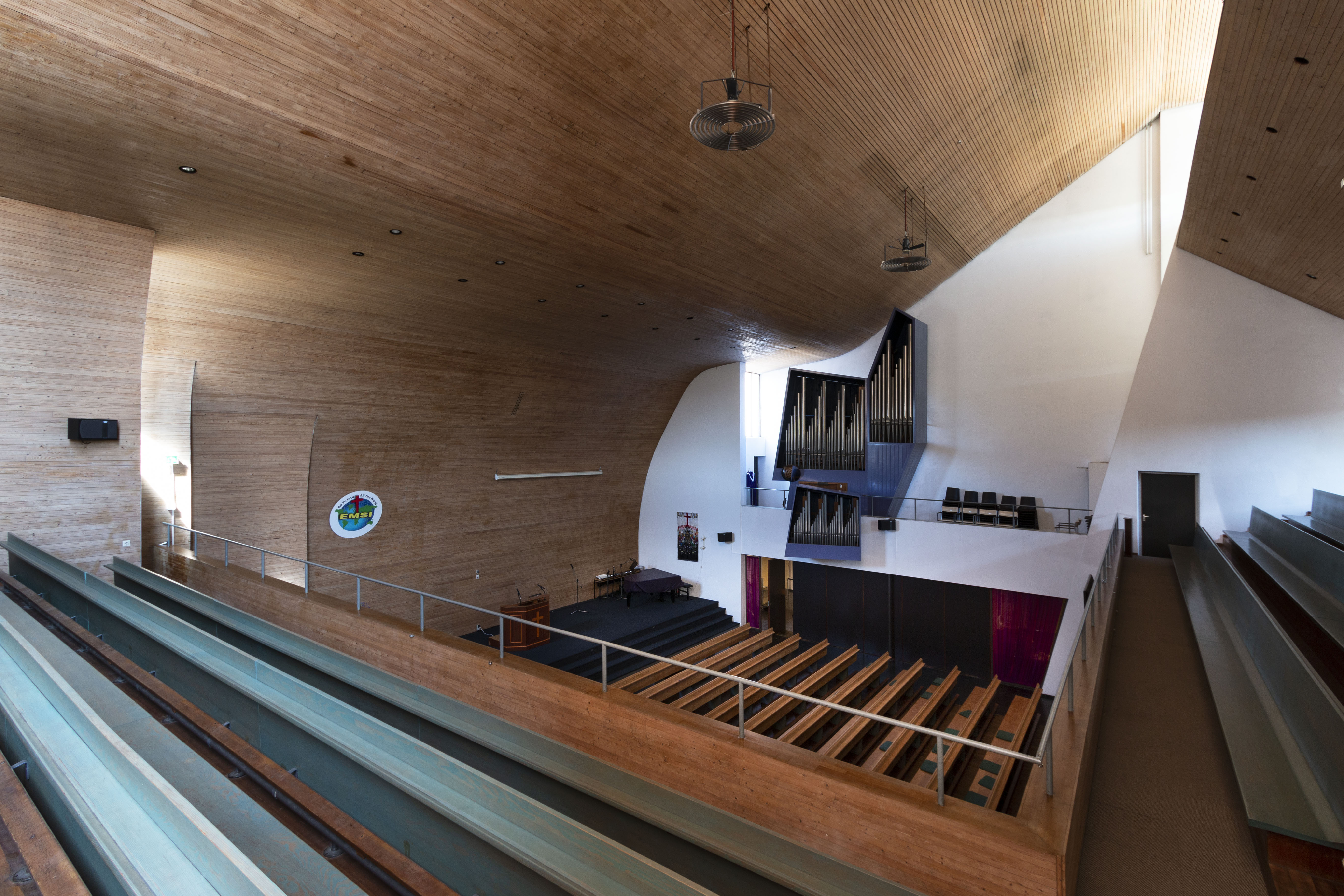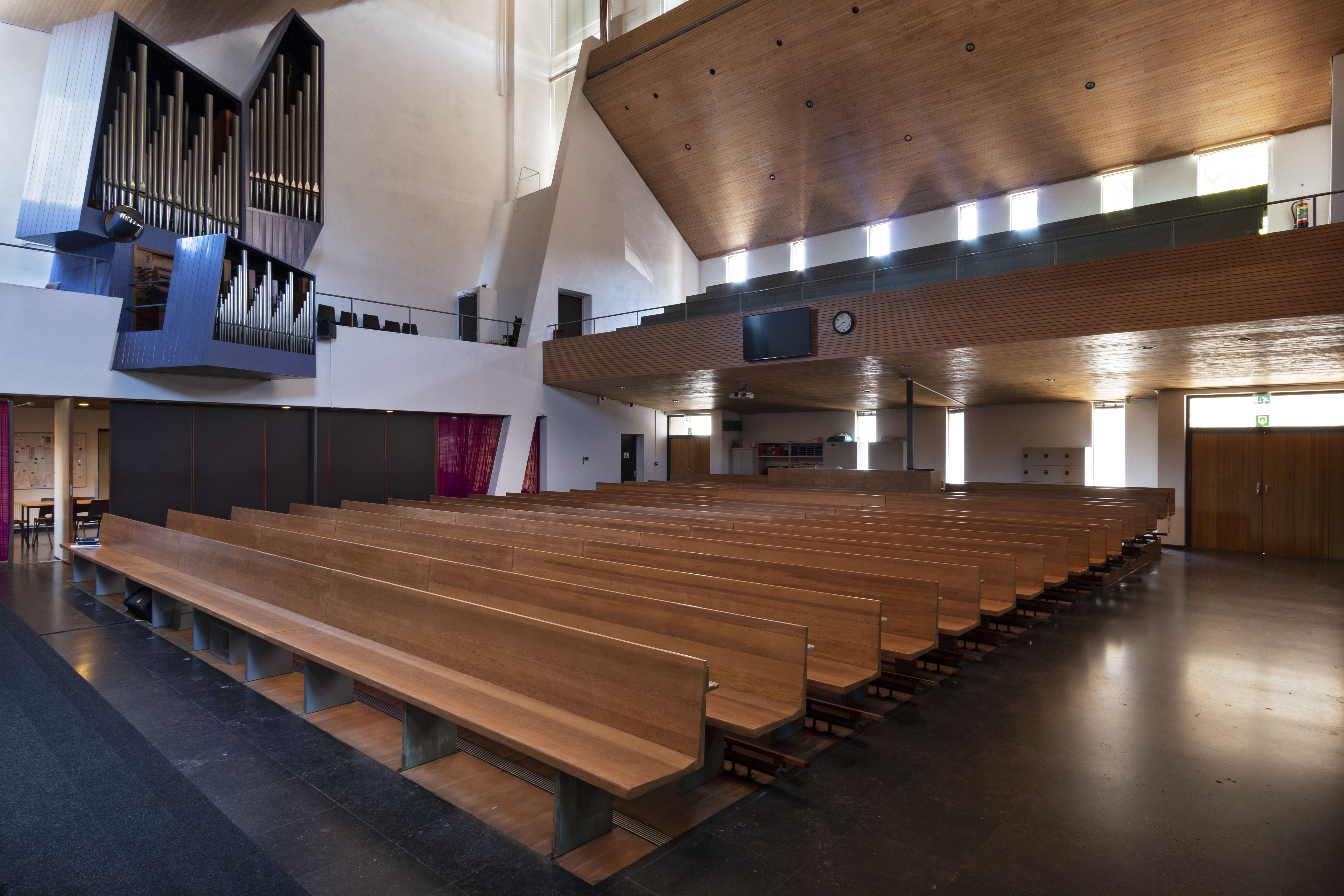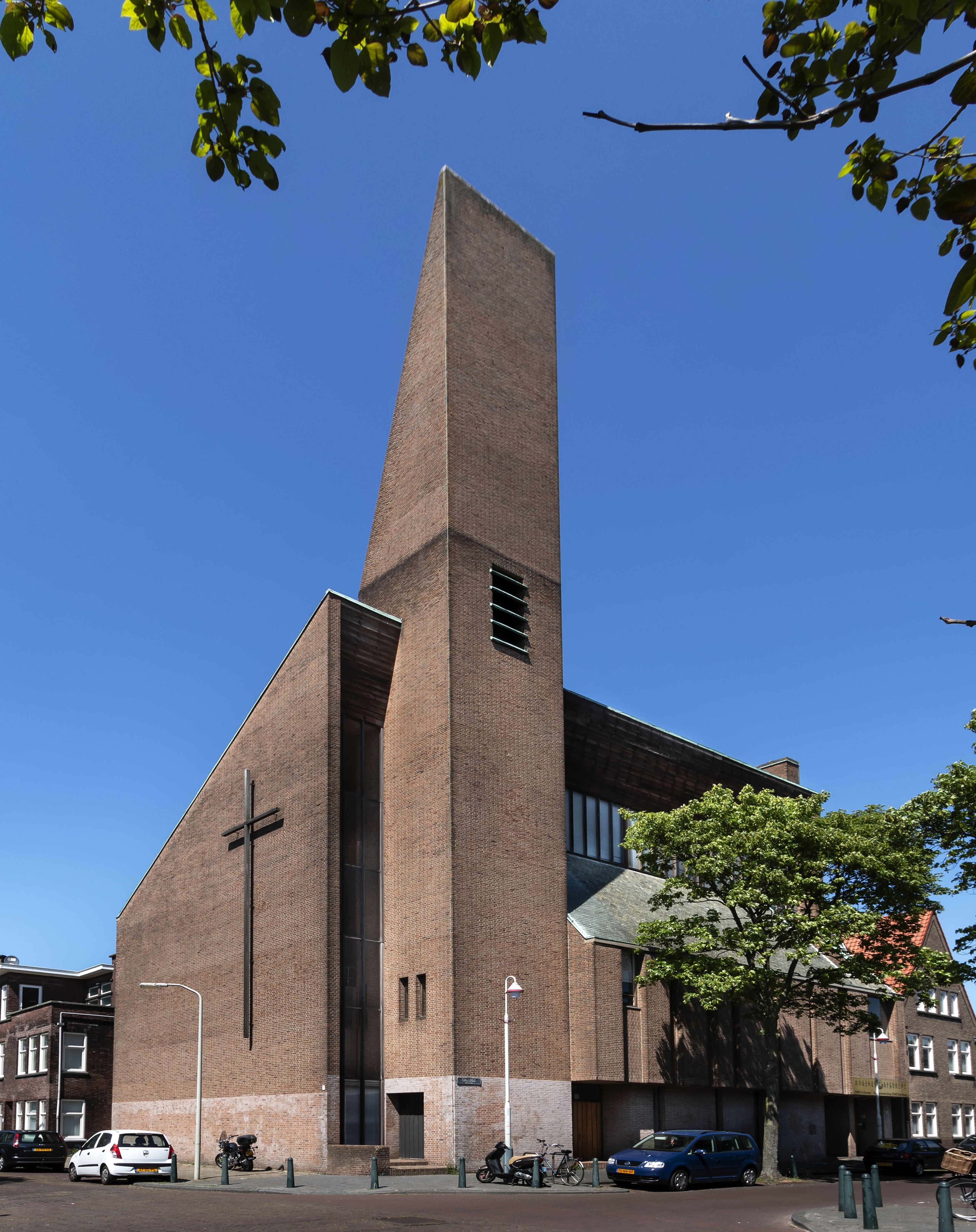 De gevels bestaan voor het grootste deel uit baksteen. De kopgevel aan de Allard Piersonlaan is geheel gesloten. Het lessenaarsdak dat een hoek van 45 graden maakt zorgt voor een groot schuin vlak. Er is een groot kruis tegen deze wand aangebracht. De gevel aan de Isingstraat bestaat uit meerdere delen. De kerkzaal kent een bijzondere ruimtewerking door de schuine lijnen, niveauverschillen, lichtinval en het dak dat in een golvende beweging gemodelleerd is. Het plafond in zowel de kerkzaal als in bijna alle andere ruimtes geheel bedekt met houten latten. De kerkzaal beschikt nog over de oorspronkelijke houten kerkbanken, het orgel en een gedenksteen.