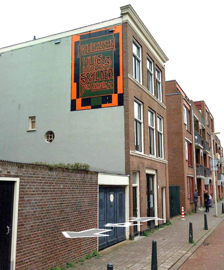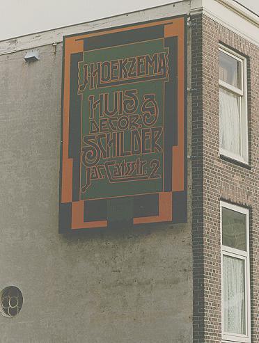 Tegen de linker zijgevel van dit op zichzelf niet beschermde monument bevindt zich een in Art Decostijl geschilderde muurreclame waarop in een rechthoekige omlijsting van afwisselend korte en lange blokken in oranje en zwarte kleur op een groen fond zwarte letters met oranje contouren zijn aangebracht. Het lettertype is een variant op de "Amerikaanse fantasieletter" die destijds veel werd toegepast voor horecabedrijven. De reclame dateert uit omstreeks 1920 en vermeldt de volgende tekst: "J. Hoekzema huis: en decor.schilder Jacob Catsstraat 2". De in 1992 gereconstrueerde muurreclame is op plaatmateriaal aangebracht.