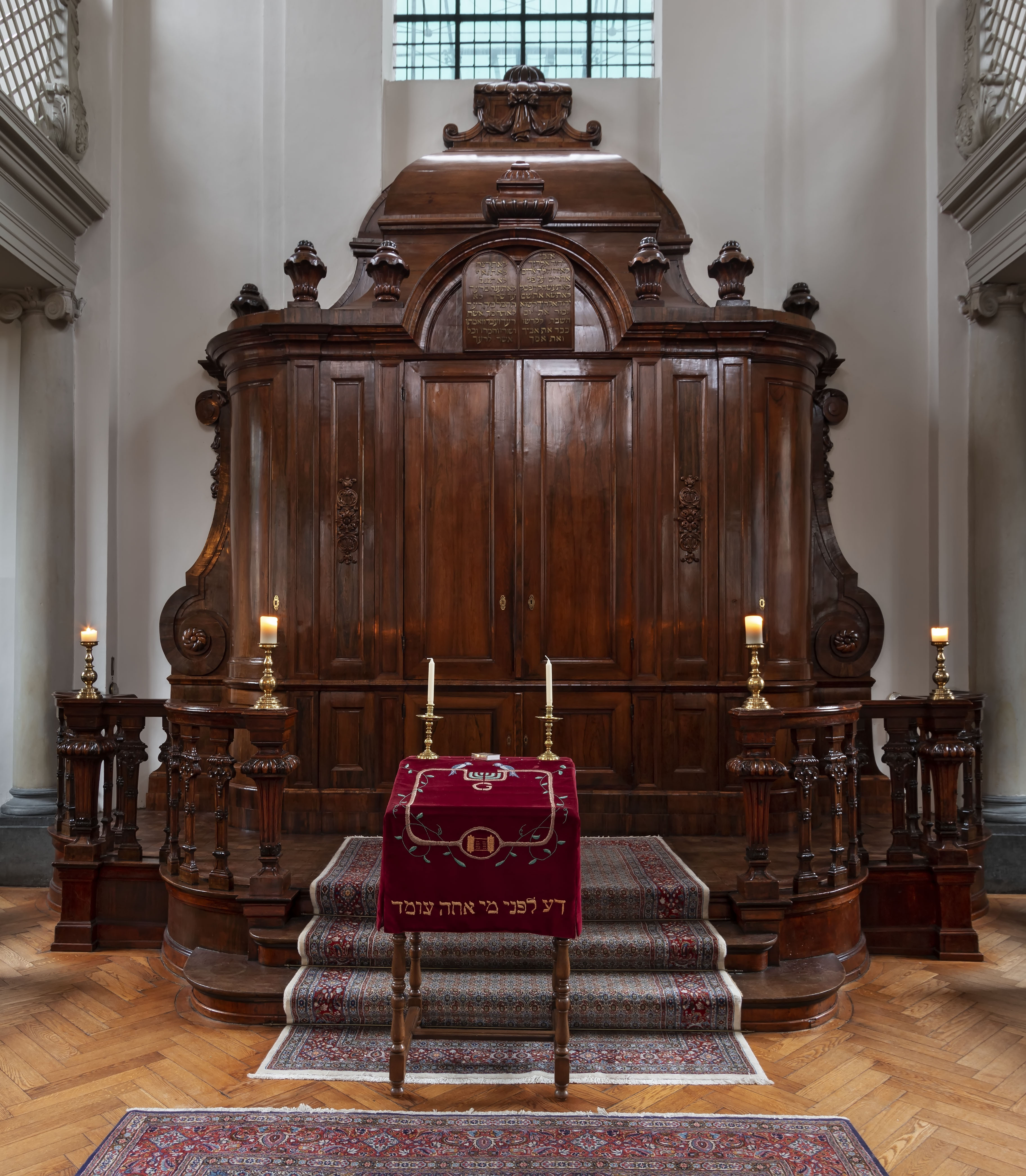 Aan de achterzijde opschrifttafels met jaartal 5486 en Hebreeuwse tekst, ijzeren hek in Lodewijk XIV stijl - gaaf interieur uit de bouwtijd.