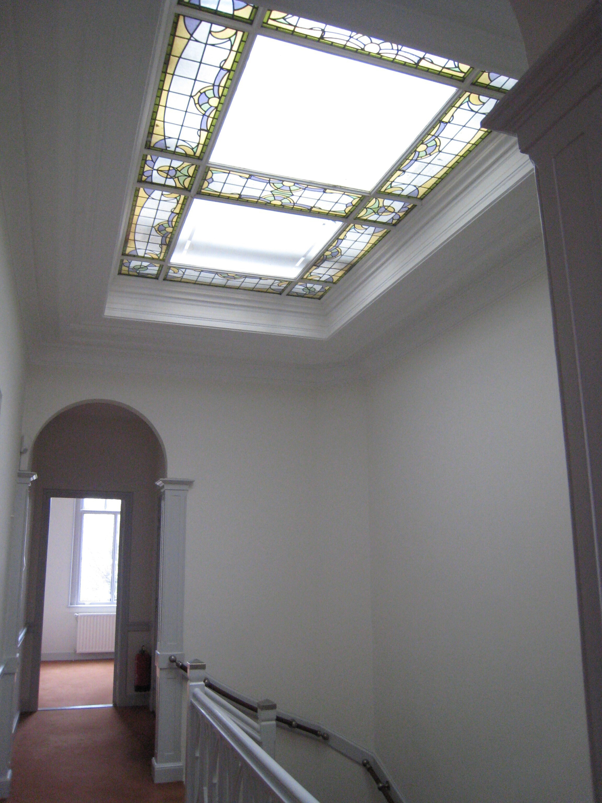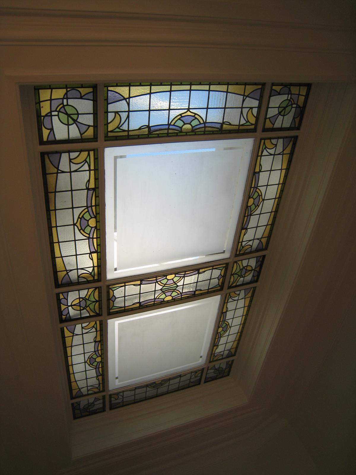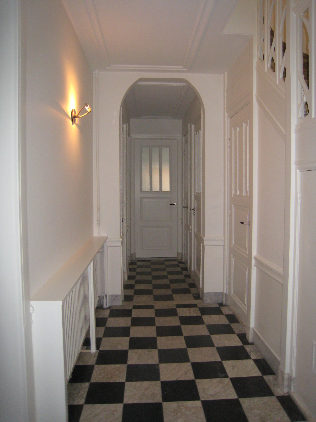 De tweede bouwlaag heeft twee vensters en een travee met twee openslaande deuren naar het balkon, allen met gebogen middenstijlen. De vensters hebben hier ontlastingsbogen met sluitstenen en in de boogvelden driepassen met waaiervormig siermetselwerk. Over de breedte van vensters en balkondeur is een balkon met Art Nouveau siersmeedwerk aangebracht. Op de derde bouwlaag zijn zes vensters in een horizontale lijn. De vensters worden door muurdammen van elkaar gescheiden. De middenstijlen van deze vensterrij zijn eveneens gebogen. Boven de vensters is een natuurstenen fries aangebracht waarin fraai siermetselwerk. De gevel eindigt in een kroonlijst tussen de hoeklisenen. Het brede balkon en de serie van zes hoge ramen met het sierfries erboven zijn afgeleid van Paul Hankars huis in de Rue Defacqz 48 te Brussel uit 1897.