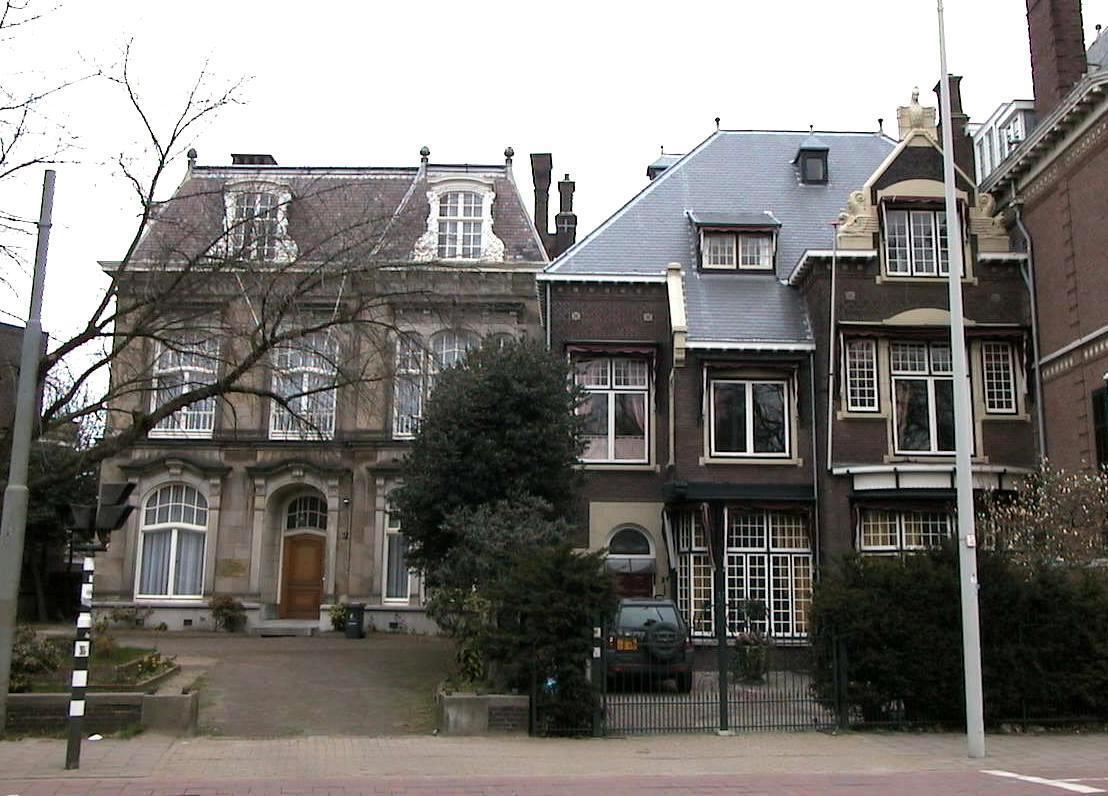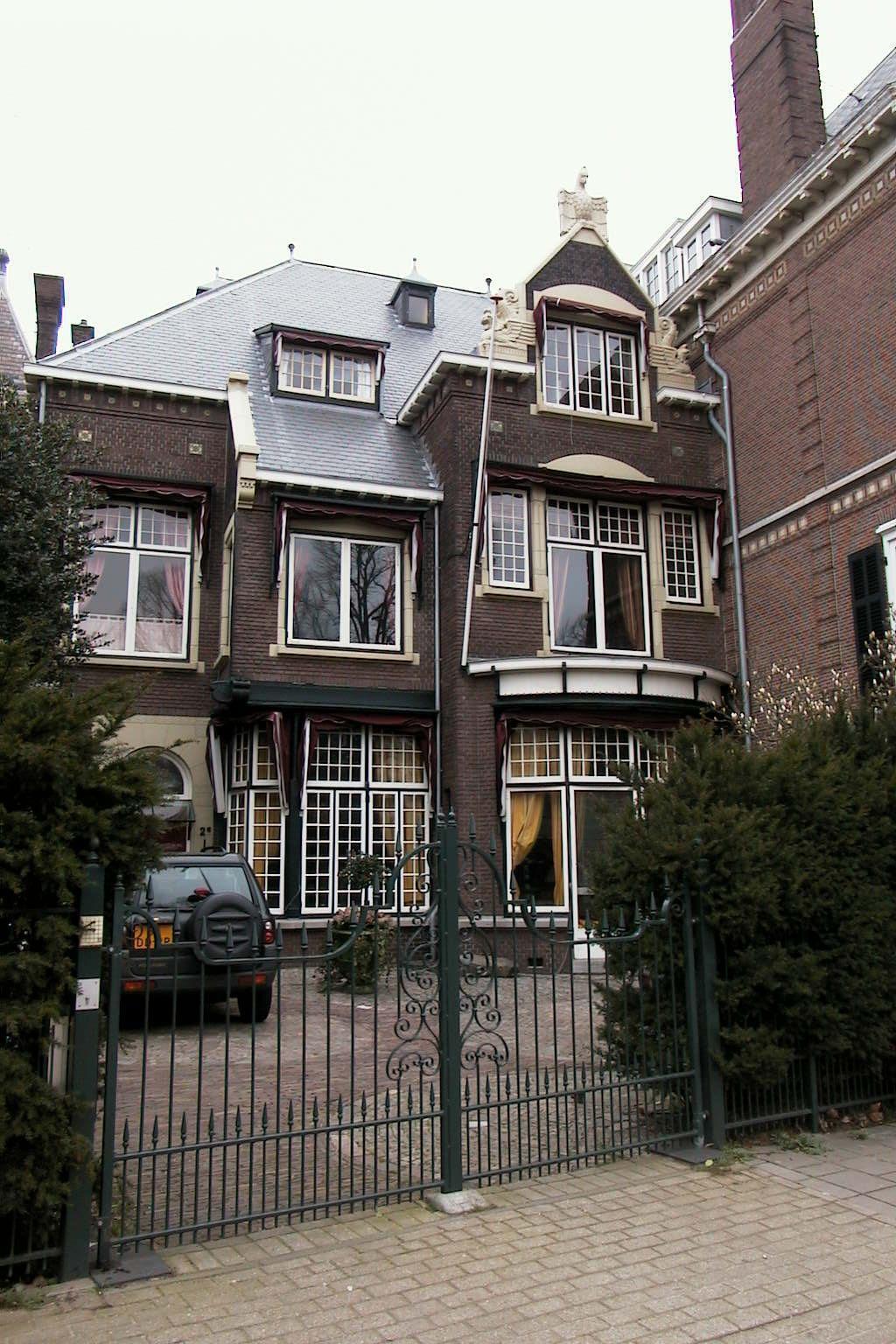 De gevels zijn van baksteen met zandstenen deur- en venster- omlijstingen en rijke sculpturale onderdelen. De vensterassen verspringen ten opzichte van elkaar. De voordeur bevindt zich in de linkeras en bezit panelen en een glas-in-lood rondboog- bovenlicht, alsmede een reliëf met aan de Javaanse kunst ontleende versieringsmotieven. Hierboven is een tweedelig venster. De middelste as heeft een glaspui, waarboven eveneens een tweedelig venster. De rechteras bezit tegen de eerste bouwlaag een segmentvormige erker en in de tweede bouwlaag een driedelige raampartij, bestaande uit openslaande deuren en aan weerszijden vensters tot de halve hoogte (type melkmeisje). De as wordt afgesloten door een puntgevel waarop in zandsteen gebeeldhouwde dierfiguren zijn gesitueerd. Het merendeel van de vensters is in kleine roeden onderverdeeld. De vensters van de eerste bouwlaag worden onderling verbonden door een hardstenen cordonlijst. De kroonlijst rust op houten klossen. Het fries is voorzien van een bakstenen decoratie en kleurige siermotieven. De linkergevel bevat twee geheel in glas-in-lood uitgevoerde vensters, eveneens met zandstenen omlijsting. De tuin wordt van de straat gescheiden door een smeedijzeren tuinhek op een bakstenen voet.