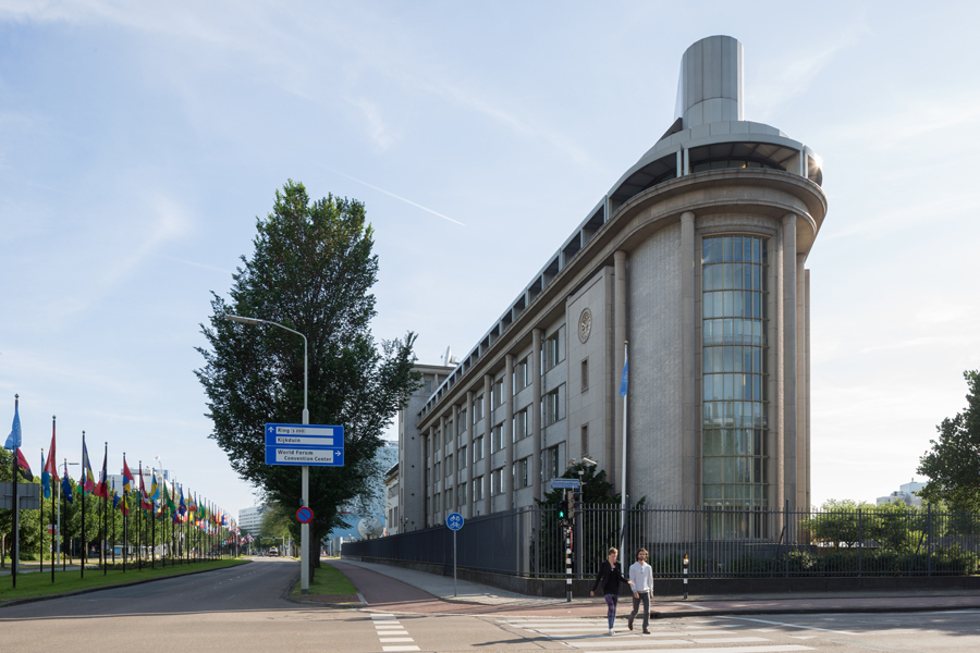 Kantoorgebouw met Vijverpartij (1951-1953) gebouwd voor de verzekeringsbank de Nieuwe Nederlandsche-Nieuwe Eerste Nederlandsche (EN-NEN), ontworpen door A. van der Steur met medewerking van W.A.C. Herman de Groot (die de betonconstructie voor het werk verzorgde), en uitgevoerd door architectenbureau Ir. J.P. van Bruggen, G. Drexhage (B.N.A.), Ir. J.J. Sterkenburg en A. Bodon (B.N.A.). Het uit 1909 daterende hoofdkantoor van de "Nieuwe Nederlandsche"was gedurende de tweede wereldoorlog door een bombardement verloren gegaan. Het nieuwe kantoorgebouw voor de verzekeringsbak werd gebouwd. in de gedurende de oorlogsjaren door de bezetter ontruimde en als Sperrgebiet ingerichte weststrook van Den Haag. Het pand maakt onderdeel uit van het door W.M. Dudok ontworpen wederopbouwplan, al was op de betreffende locatie een woongebouw gepland. De thans ellipsvormige vijverpartij had oorspronkelijk een andere vorm: deze volgde grotendeels de begrenzingen van het voorterrein, gevormd door de voorgevel van het gebouw aan de noordwestelijke zijde en de grens van het bouwterrein aan de zuidoostelijke zijde. De toevoeging van vijverpartijen is iets wat van der Steur vaker deed, mede om het monumentale karakter van zijn gebouwen te vergroten. In de vijver bevonden zich twee bronzen beelden die zijn verplaatst naar de groenstrook ten oosten van het pand. Het kantoorgebouw voor de EN-NEN is rijk afgewerkt met verschillende soorten natuursteen en omvat diverse monumentale kunstwerken. In de jaren zeventig en tachtig van de twintigste eeuw is het gebouw op passende wijze met één verdieping opgehoogd door architect Ploeger van DSBV. Thans (2009) is het International Criminal Tribunal for the former Yugoslavia (ICTY) in het gebouw gehuisvest. Daartoe zijn onder andere drie rechtzalen in het gebouw ondergebracht.
