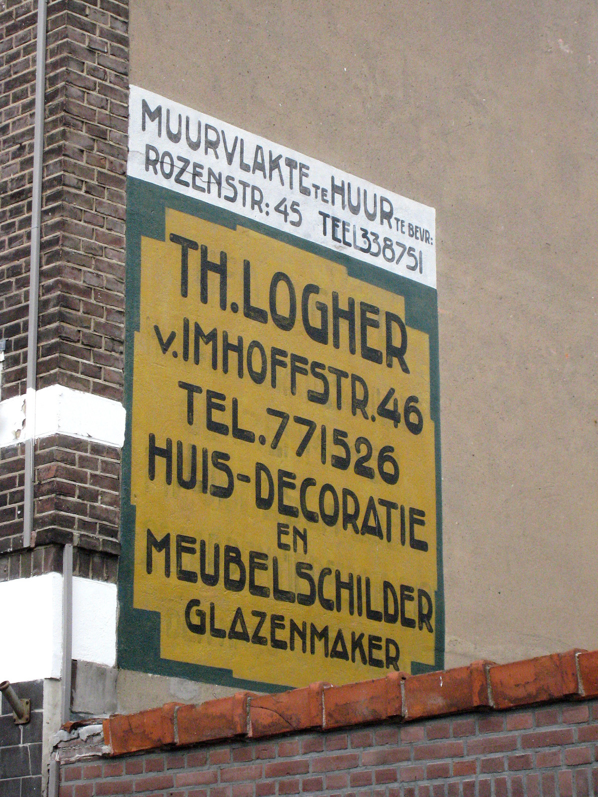 De muurschildering is vermoedelijk door de adverterende schilder zelf aangebracht. De datering van de reclame valt af te leiden uit de gegevens uit adres- en telefoonboeken van Den Haag. De adverterende firma Th. Logher werd in 1926 opgericht en was toen gevestigd aan de De Carpentierstraat 2 10-212. Enige jaren later is de firma verhuisd naar de Van Imhoffstraat 46. De reclameschildering bestaat uit een geel fond met zwarte tekst en een groene, sober gedecoreerde sieromlijsting. De volledige reclametekst luidt: "Th. Logher v.Imhoffstraat 46 Tel. 771526 huis- decoratie en meubelschilder glazenmaker". Aan de bovenkant bevindt zich een smalle reclame, wit fond met zwarte letters, voor een ander bedrijf dat deze muur verhuurde voor reclames. Hier staat te lezen: "Muurvlakte te huur te bevr.: Rozenstr: 45 tel 338751". Door slijtage is ook een oudere onderschildering door de bovenste laag waar te nemen. De schildering is in 2005 gerestaureerd.