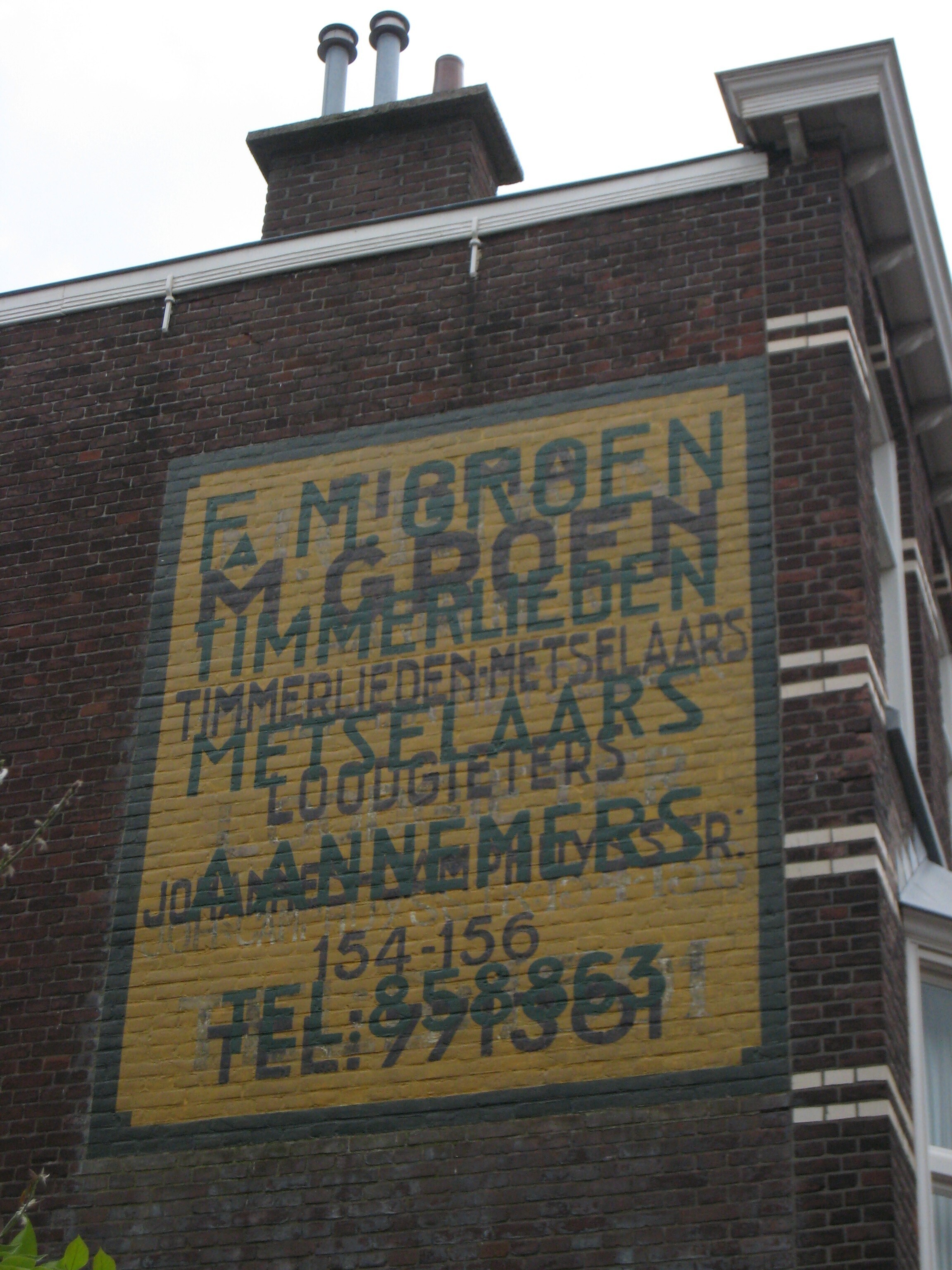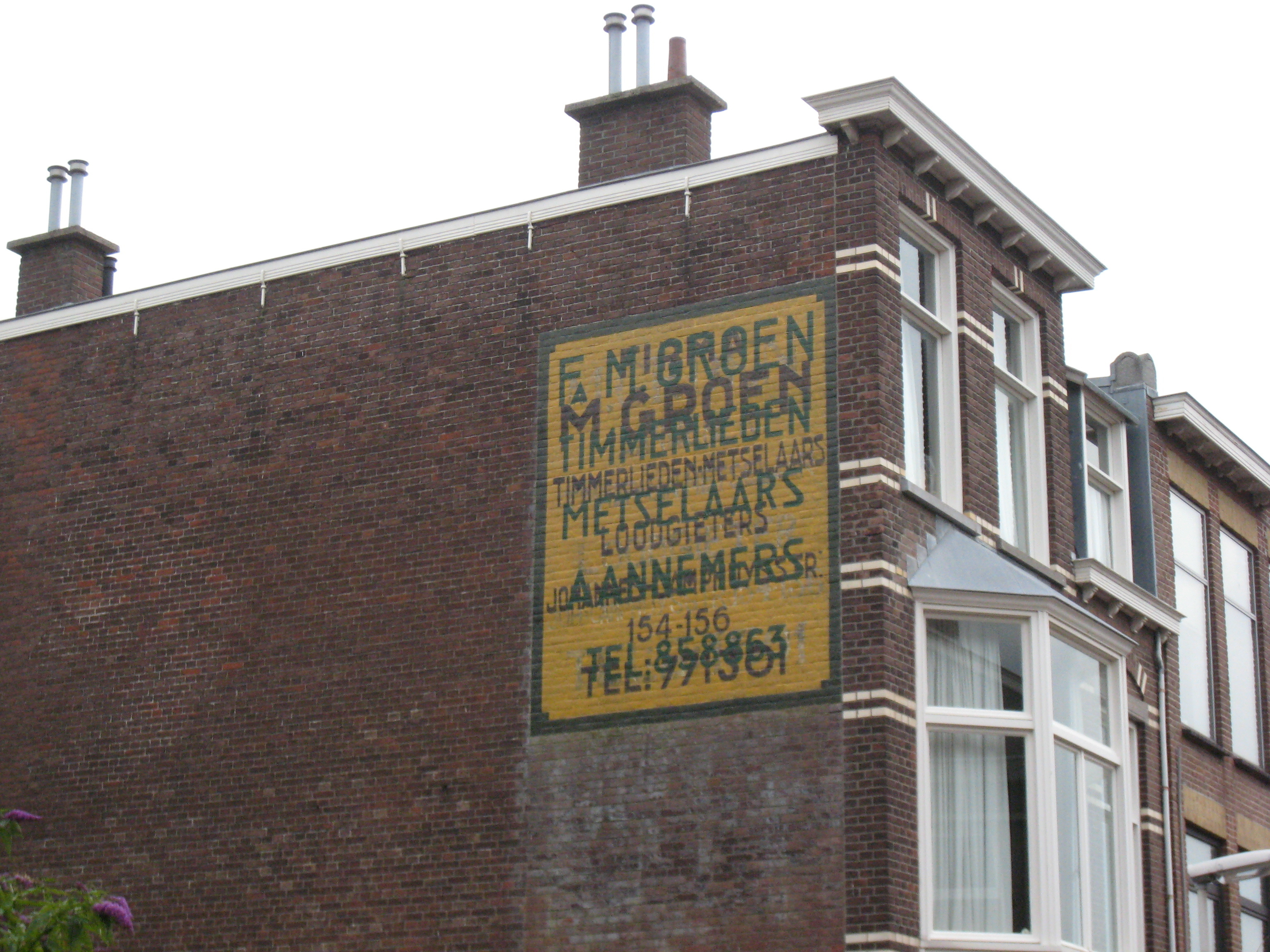 De aannemer M. Groen bouwde het uit 1912-1913 daterende bedrijfspand met bovenwoning aan de Johannes Camphuijsstraat voor zichzelf. De muurreclame op de zijgevel is van deze firma. Zoals wel vaker gebeurde werden muurreclames regelmatig overschilderd. Daar konden meerdere redenen voor zijn. De muurreclame was bijvoorbeeld verweerd of er moest een nieuw telefoonnummer vermeld worden. Dit is goed waarneembaar bij deze muurreclame.