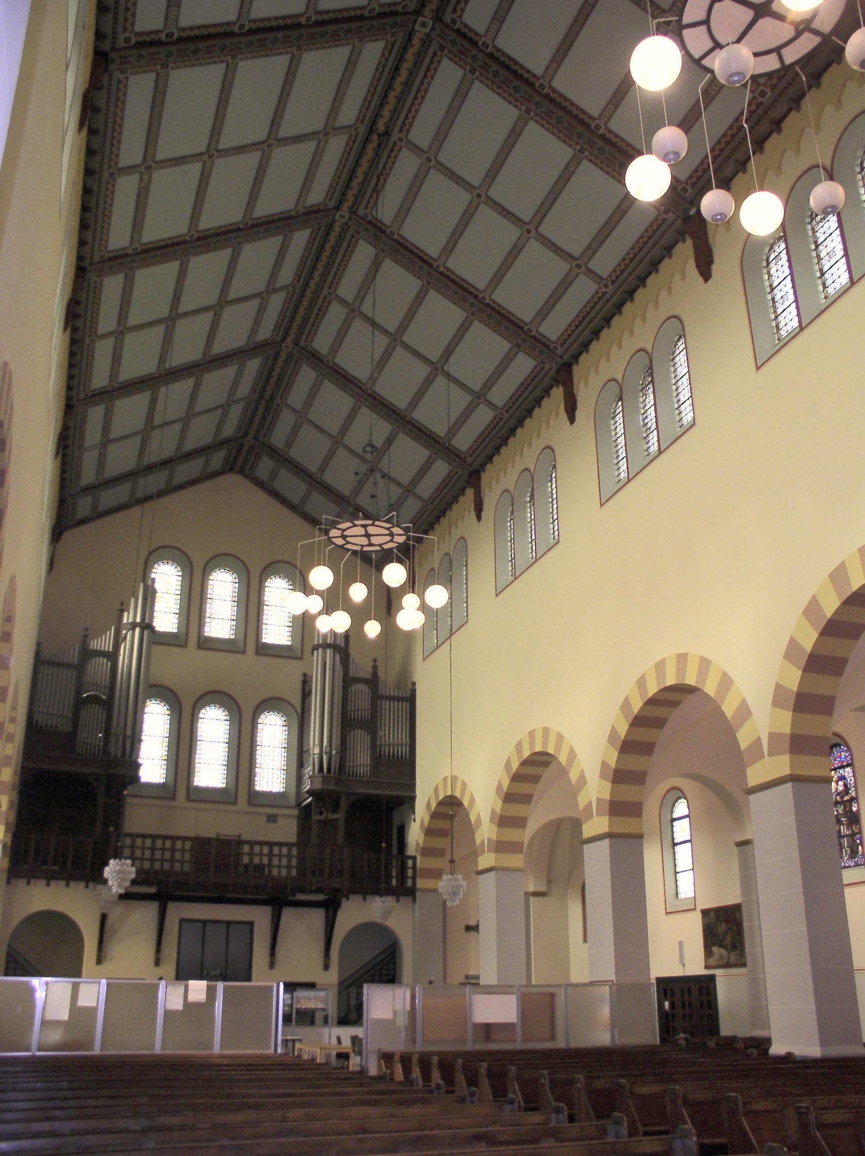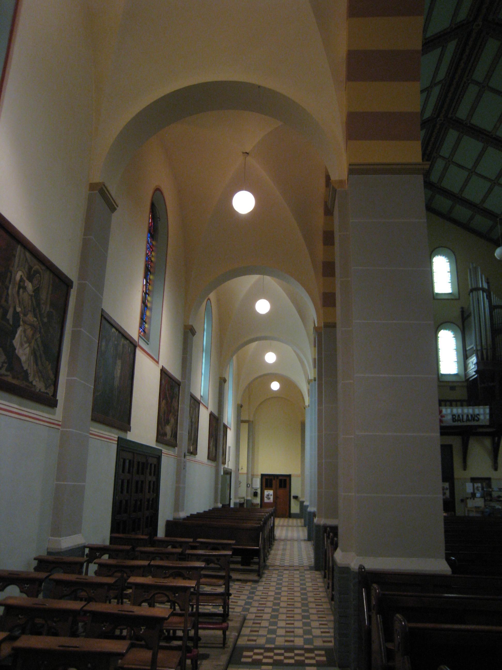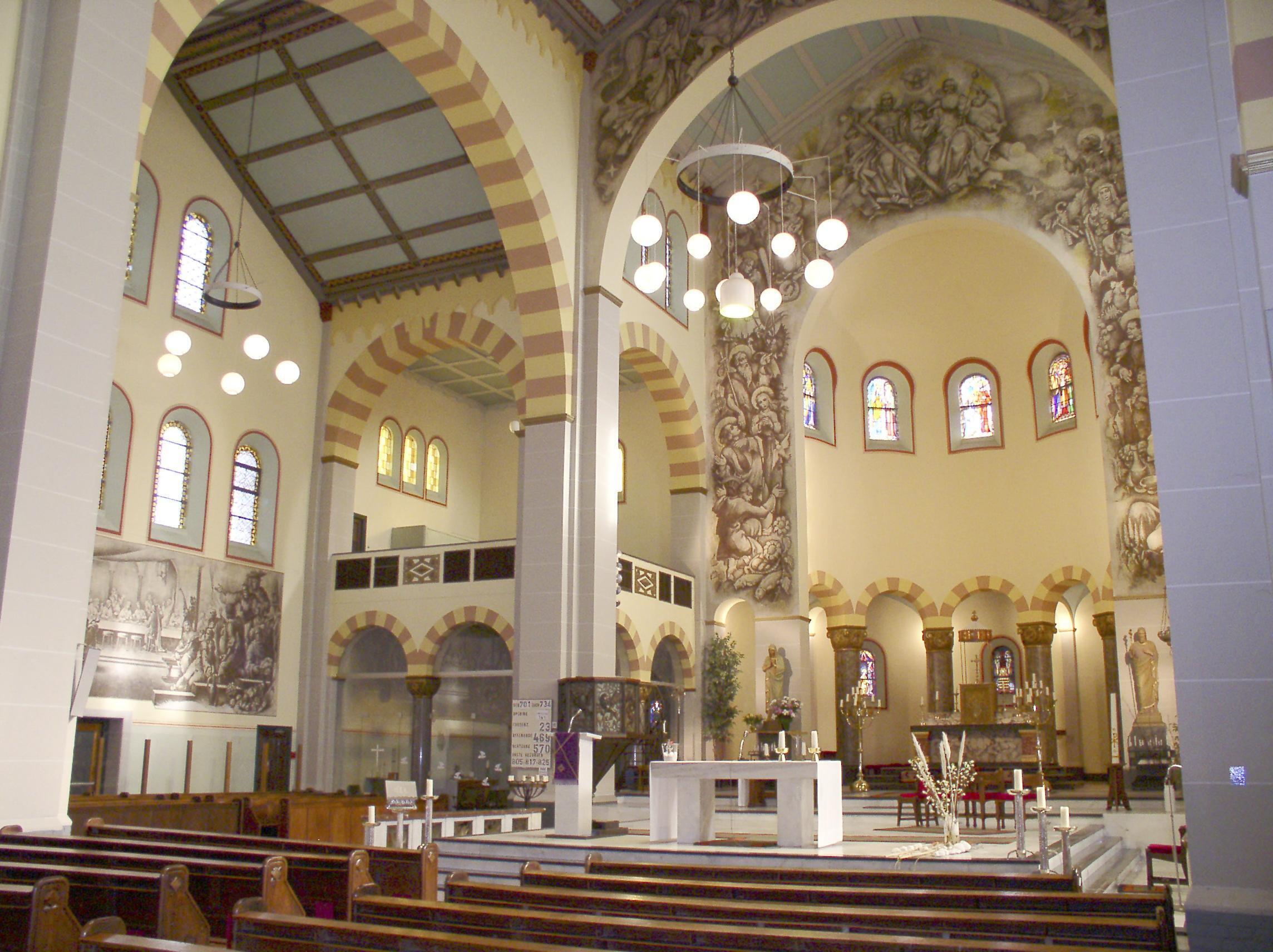Het interieur heeft rondboog-arcaden op vierkante pijlers waarbij de hoofdbeuken worden beëindigd met beschoten kappen en de zijbeuken met ribloze kruisgewelven op gordelbogen. De lagere, halfronde gesloten hoofdapsis is met een stenen kalot overwelfd. De zijkapellen aan weerszijden van het koor hebben galerijen op rondbogen, gedragen door zuilen met gepolijste granieten schachten en teerlingkapitelen. Ook onder de rondbogen waarmee de lage omgang rond de apsis geopend is, zijn gepolijste granieten zuilen met kapitelen aangebracht waarop de evangelistensymbolen zijn gebeeldhouwd. De vloer is gedekt met in patronen gelegde vierkante tegels van diverse kleuren. In de ramen is veelvuldig gebruik gemaakt van glas-in-lood. Tegen de eindwanden van het transept bevinden zich grote muurschilderingen die uit de jaren zestig van de vorige eeuw dateren. Aan de noordzijde is de bruiloft van Canaän te zien en aan de zuidzijde de Wonderbare Broodvermenigvuldiging. Uit dezelfde periode dateert de geschilderde triomfboog naar de apsis met een voorstelling van de Heilige Drieëenheid en heiligen. De huidige kleurstelling en decoraties op de wanden zijn een versoberde reconstructie van de oorspronkelijke afwerking die in de jaren zestig van de vorige eeuw is verdwenen onder een witte afwerklaag. Vermeldenswaard is voorts een tegeltableau in het metselwerk van de westgevel met een voorstelling van de middeleeuwse kapel op Oud Eik en Duinen. Tot het waardevolle kerkinterieur behoren de in metaal uitgevoerde preekstoel tegen de noord-oostelijke pijler van de viering, de uit de bouwtijd daterende kerkbanken en het tegen de westgevel geplaatste orgel.