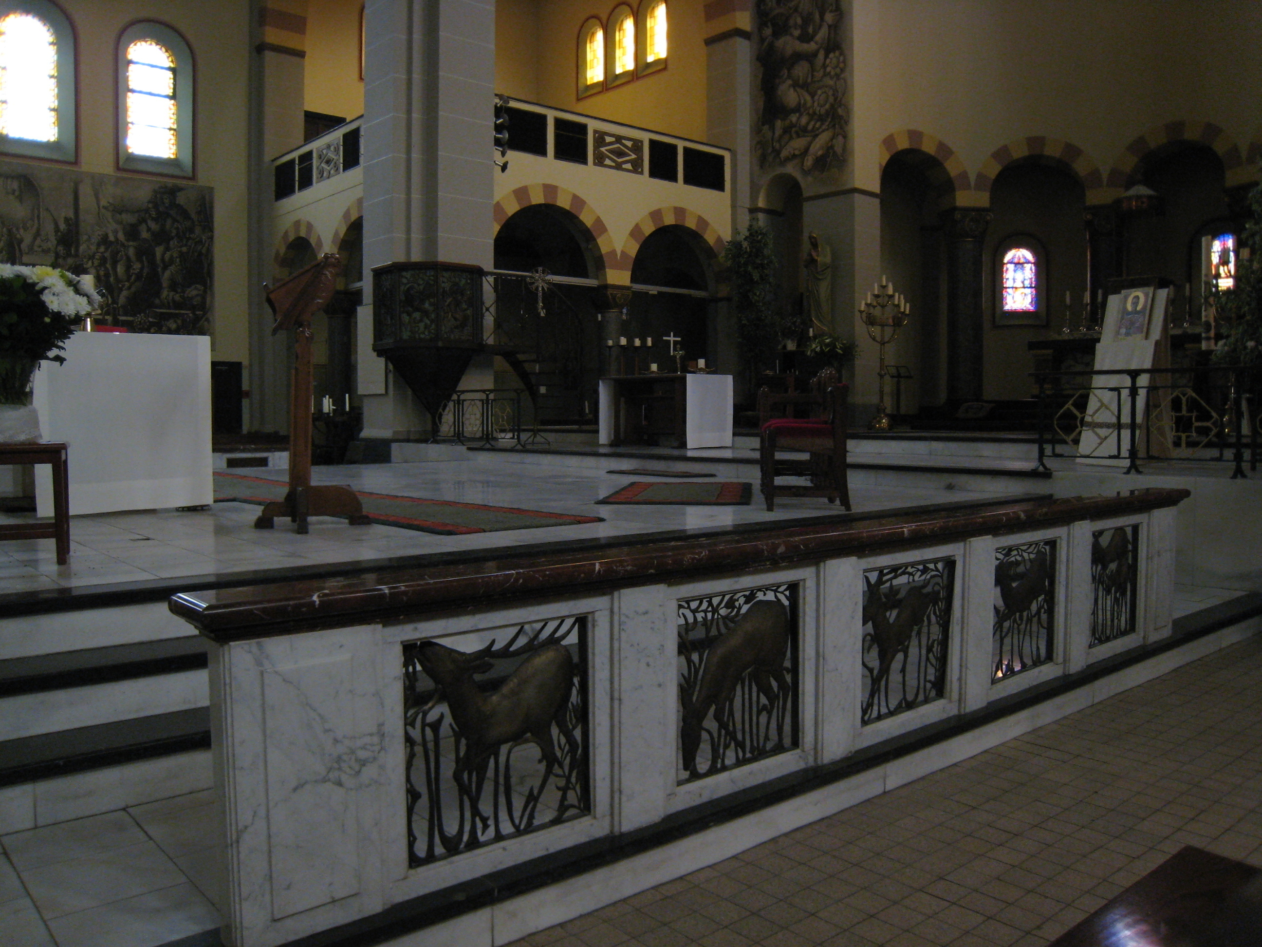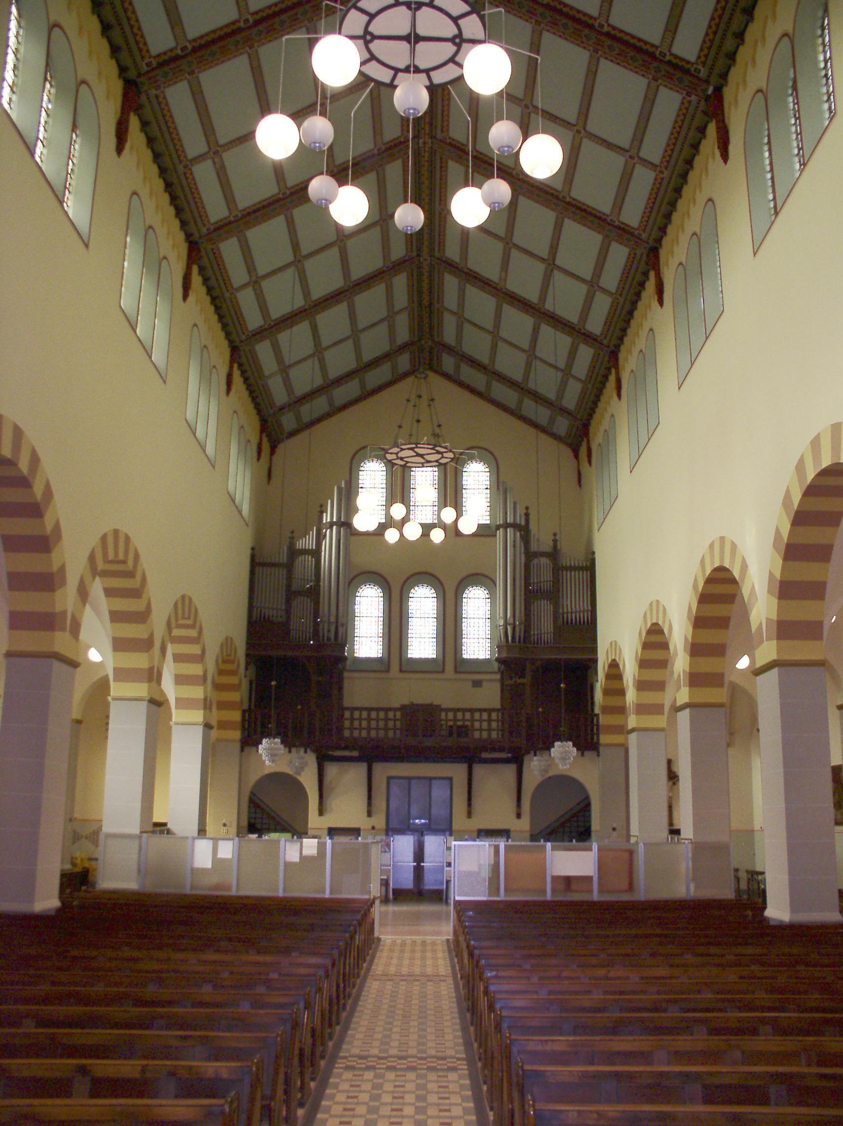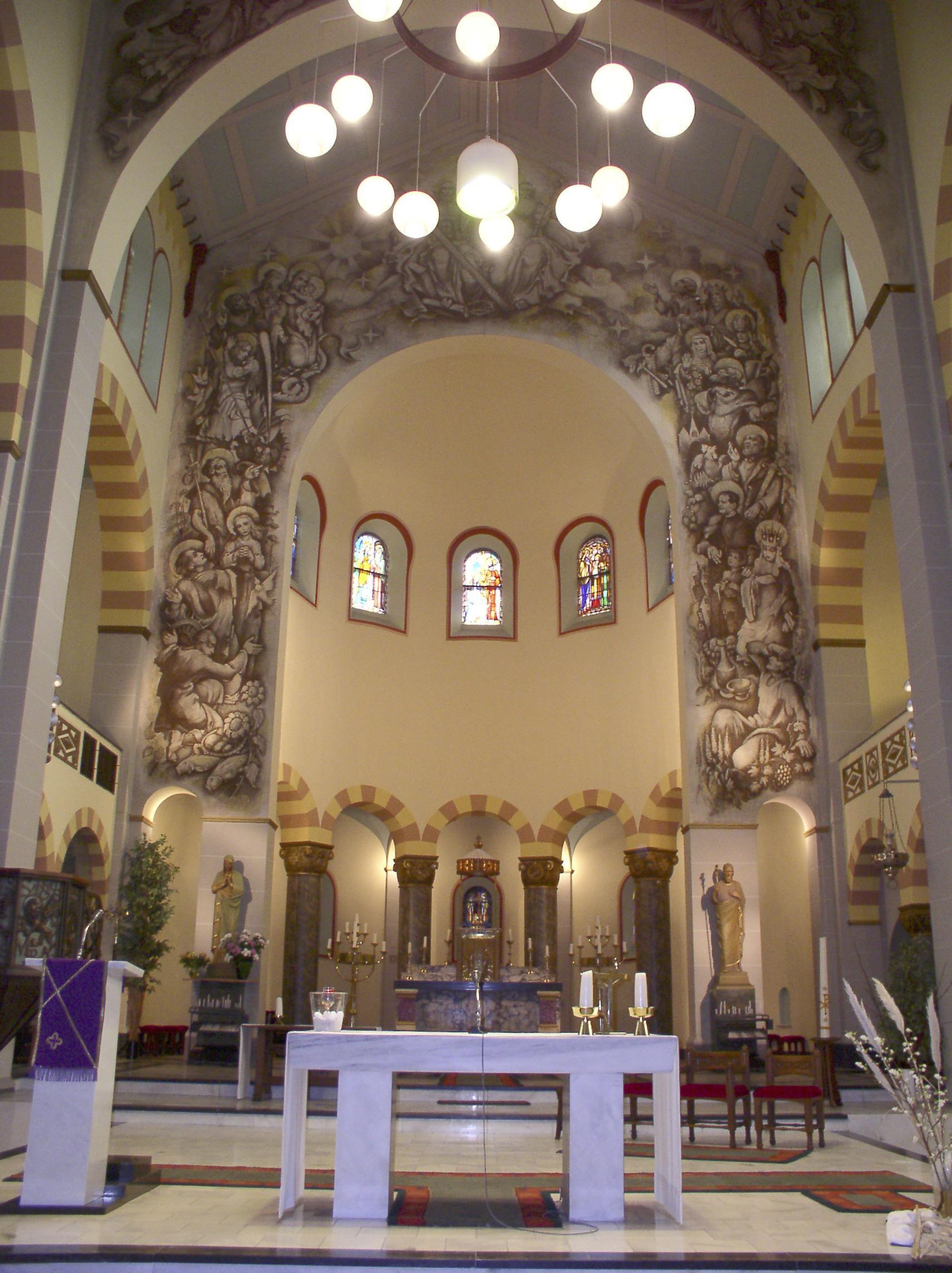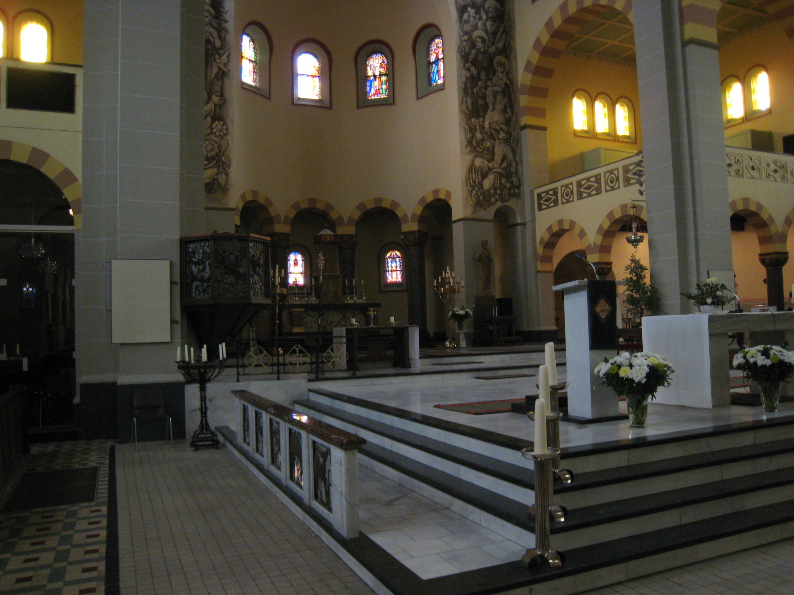 Het interieur heeft rondboog-arcaden op vierkante pijlers waarbij de hoofdbeuken worden beëindigd met beschoten kappen en de zijbeuken met ribloze kruisgewelven op gordelbogen. De lagere, halfronde gesloten hoofdapsis is met een stenen kalot overwelfd. De zijkapellen aan weerszijden van het koor hebben galerijen op rondbogen, gedragen door zuilen met gepolijste granieten schachten en teerlingkapitelen. Ook onder de rondbogen waarmee de lage omgang rond de apsis geopend is, zijn gepolijste granieten zuilen met kapitelen aangebracht waarop de evangelistensymbolen zijn gebeeldhouwd. De vloer is gedekt met in patronen gelegde vierkante tegels van diverse kleuren. In de ramen is veelvuldig gebruik gemaakt van glas-in-lood. Tegen de eindwanden van het transept bevinden zich grote muurschilderingen die uit de jaren zestig van de vorige eeuw dateren. Aan de noordzijde is de bruiloft van Canaän te zien en aan de zuidzijde de Wonderbare Broodvermenigvuldiging. Uit dezelfde periode dateert de geschilderde triomfboog naar de apsis met een voorstelling van de Heilige Drieëenheid en heiligen. De huidige kleurstelling en decoraties op de wanden zijn een versoberde reconstructie van de oorspronkelijke afwerking die in de jaren zestig van de vorige eeuw is verdwenen onder een witte afwerklaag. Vermeldenswaard is voorts een tegeltableau in het metselwerk van de westgevel met een voorstelling van de middeleeuwse kapel op Oud Eik en Duinen. Tot het waardevolle kerkinterieur behoren de in metaal uitgevoerde preekstoel tegen de noord-oostelijke pijler van de viering, de uit de bouwtijd daterende kerkbanken en het tegen de westgevel geplaatste orgel.