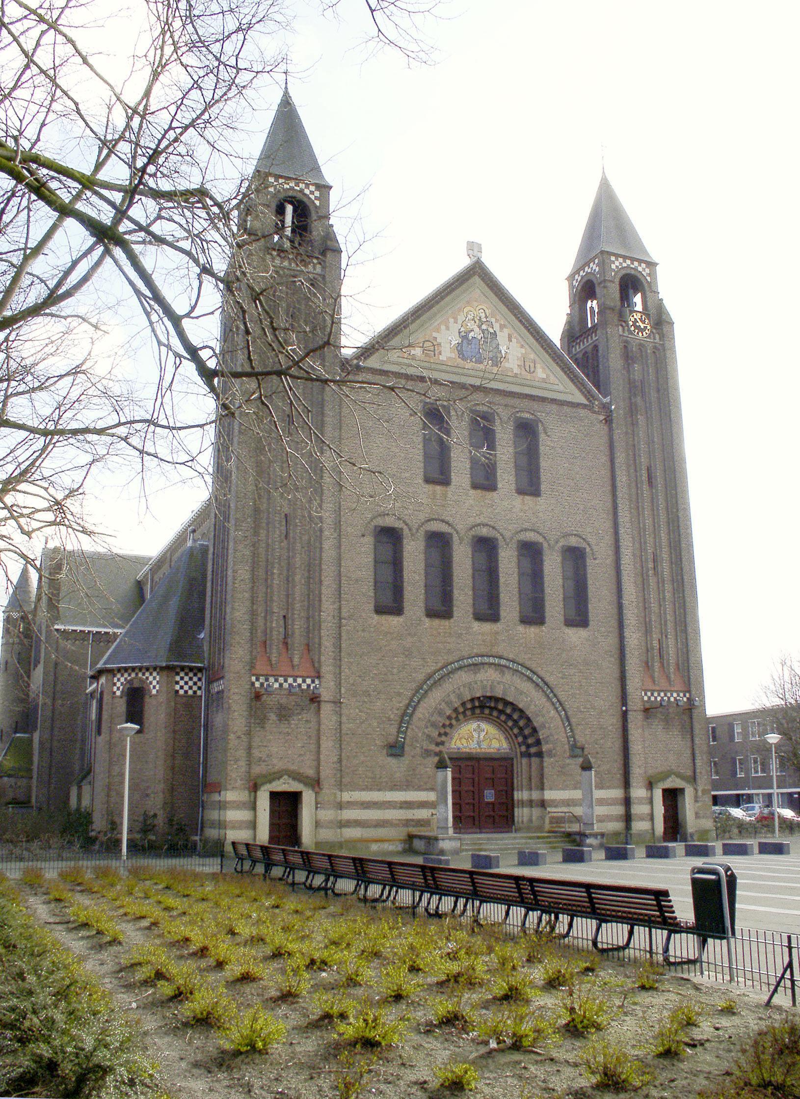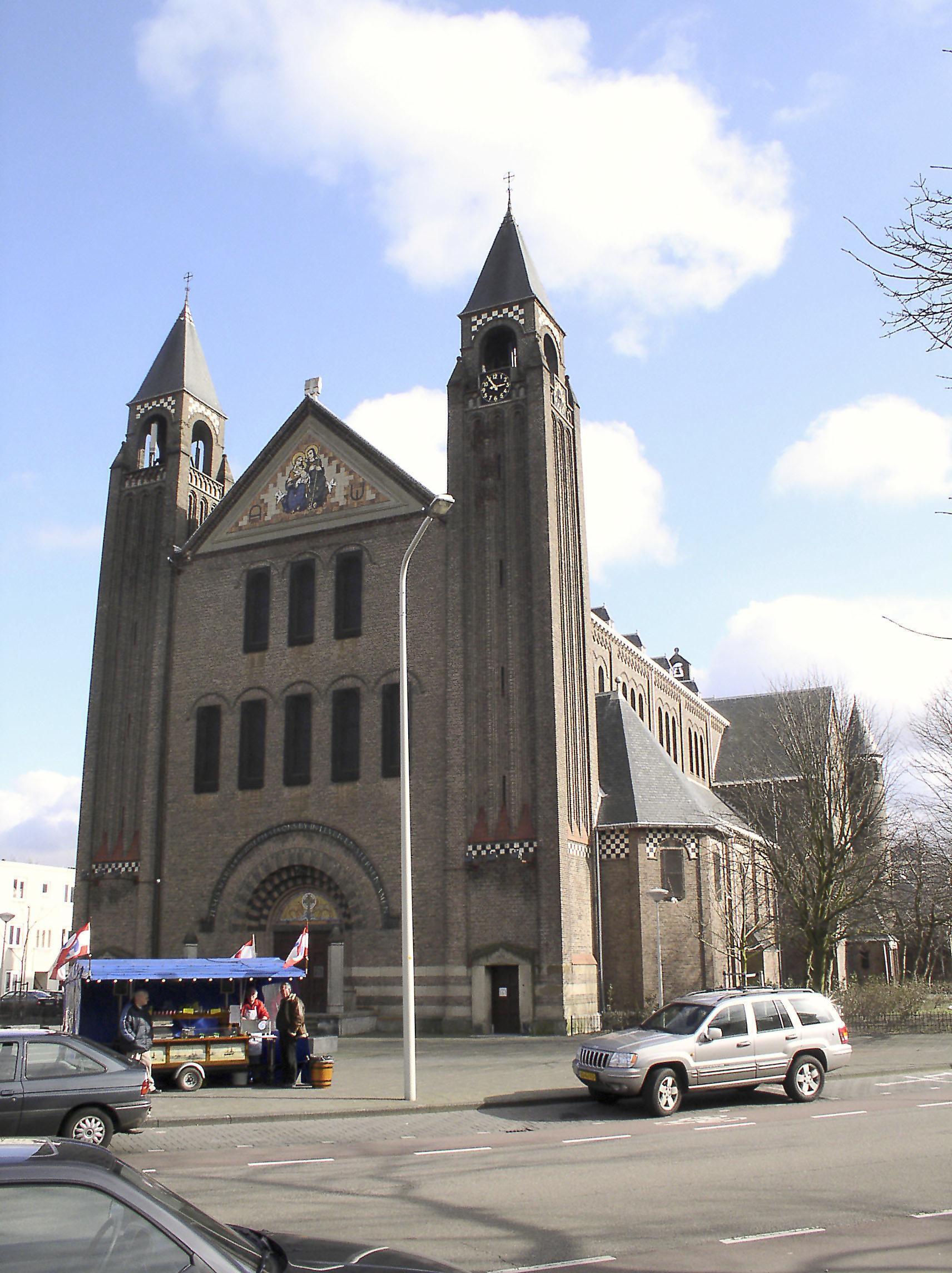 Het in de zichtas van Kamperfoelieplein en Goudenregenstraat gesitueerde kerkgebouw is een kruisbasiliek, geïnspireerd op de vroeg romaanse Duitse kerkarchitectuur vergelijkbaar met de St. Michael in Hildesheim. De architect Jan Stuyt, een leerling van P.J.H. Cuypers bouwde in Den Haag twee grote parochiekerken. De andere, gewijd aan de H. Gerardus Majella in de Wenckebachstraat is in 1982 afgebroken.