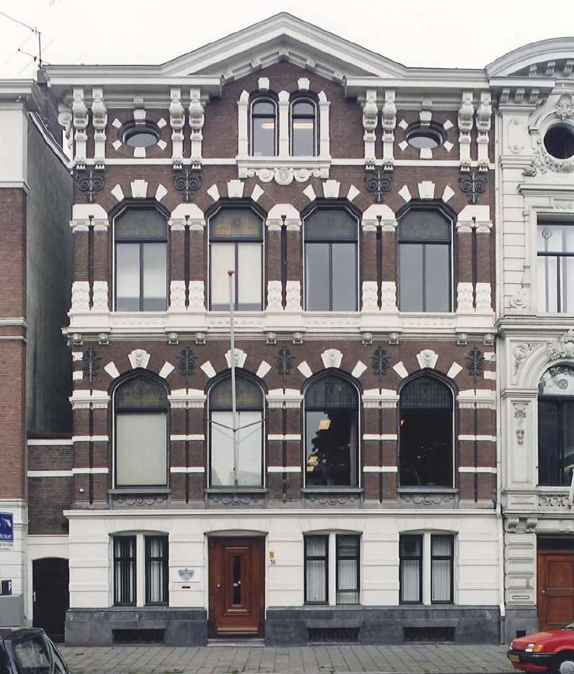 Herenhuis op rechthoekige plattegrond, bestaande uit een souterrain, drie bouwlagen en een mezzanino onder een zinken roevendak, vier vensterassen breed. De gevel is van baksteen met gepleisterde banden, negblokken en consoles, en voorzien van sierankers. Tegen de eerste bouwlaag is een gebosseerde bepleistering met rustica aangebracht op een hardstenen plint. De souterrainvensters zijn voorzien van een hekwerk met cirkelvormig smeedijzer. De vensters van de eerste bouwlaag zijn gekoppeld. De ingang, bestaande uit een paneeldeur (niet uit de bouwtijd), is in een portiek gesitueerd. De schuifvensters van de tweede bouwlaag bezitten glas-in-lood bovenlichten en spitsboogvormige omlijstingen, gescheiden door gekoppelde pilasters met Toscaanse kapitelen. Onder de hardstenen vensterbanken is voluutvormig beeldhouwwerk aangebracht. De schuifvensters van de derde bouwlaag bezitten T-kozijnen en glas-in-lood bovenlichten. Voorts bezitten zij geknikte omlijstingen, gescheiden door gekoppelde pilasters met Ionische kapitelen en deels van decoratief pleisterwerk voorziene schachten. De pilasters rusten op kleine leeuwekopjes en zijn onderling verbonden door een kraallijst. Onder de vensterbanken zijn diamantkoppen aangebracht. In de mezzanino bevinden zich twee ovaalvormige vensters en in het midden twee gekoppelde rondboogvensters, gescheiden door gecanneleerde pilasters met Toscaanse kapitelen. Onder de vensterbanken van de gekoppelde vensters is voluutvormig pleisterwerk aangebracht, waarin een maskerkop is opgenomen. De kroonlijst rust op zwaar versierde, gekoppelde triglyfconsoles met guirlandes en is in het midden opgetrokken tot een driehoekig fronton op klossen.