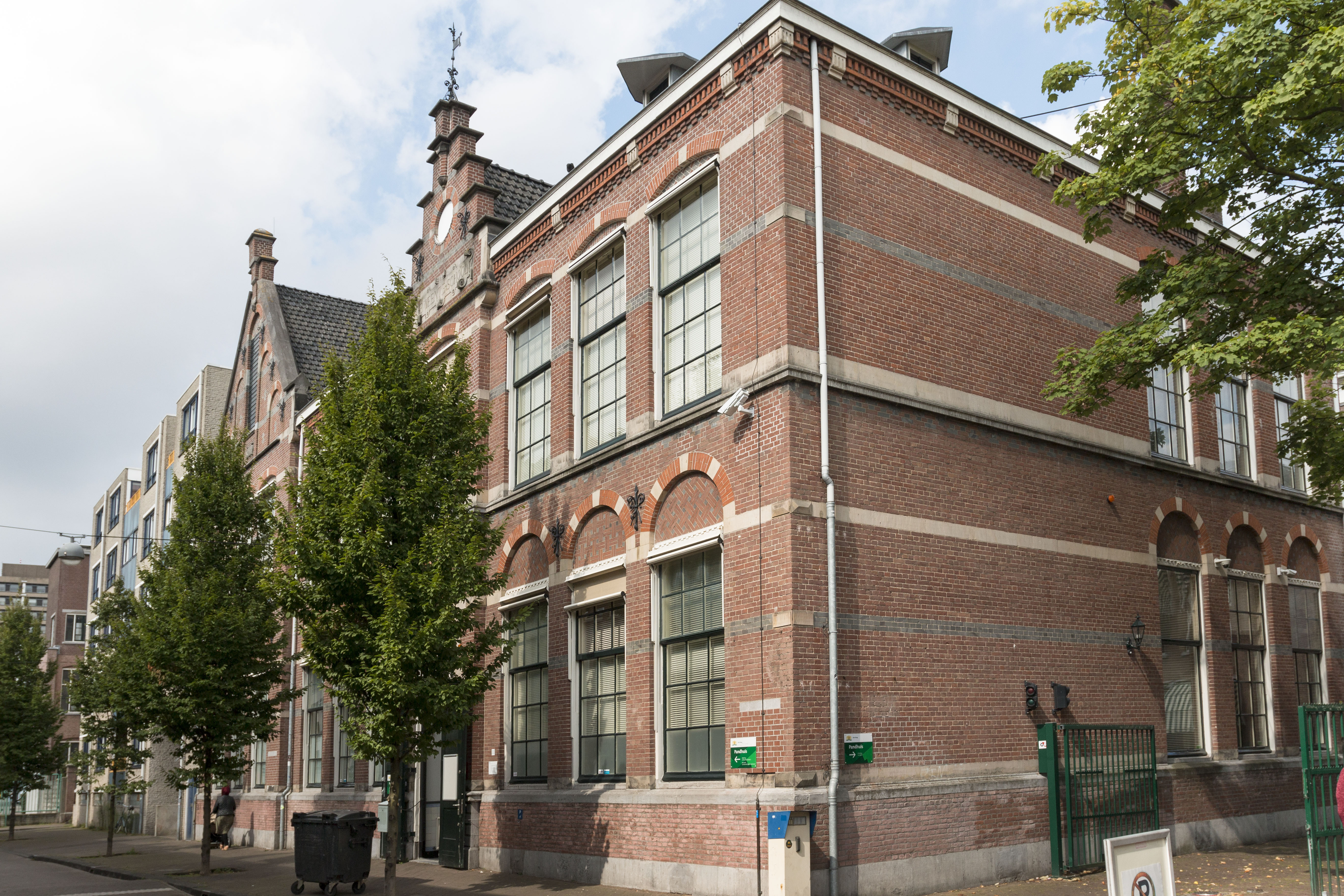 De gemeente bouwde deze school voor lager onderwijs in het hart van de levendige volkswijk Kortenbos, in één van de smalle straatjes rondom het Westeinde. De dienst Gemeentewerken realiseerde hier een statig pand in neorenaissance met mooie ronde bogen boven de ramen en siermetselwerk onder de rand van de goot. De gevel is zo ingedeeld dat de school uit twee gebouwen lijkt te bestaan: het linker springt iets naar voren en heeft een topgevel, het bredere rechterdeel met de ingang heeft een rechte gootlijst.
