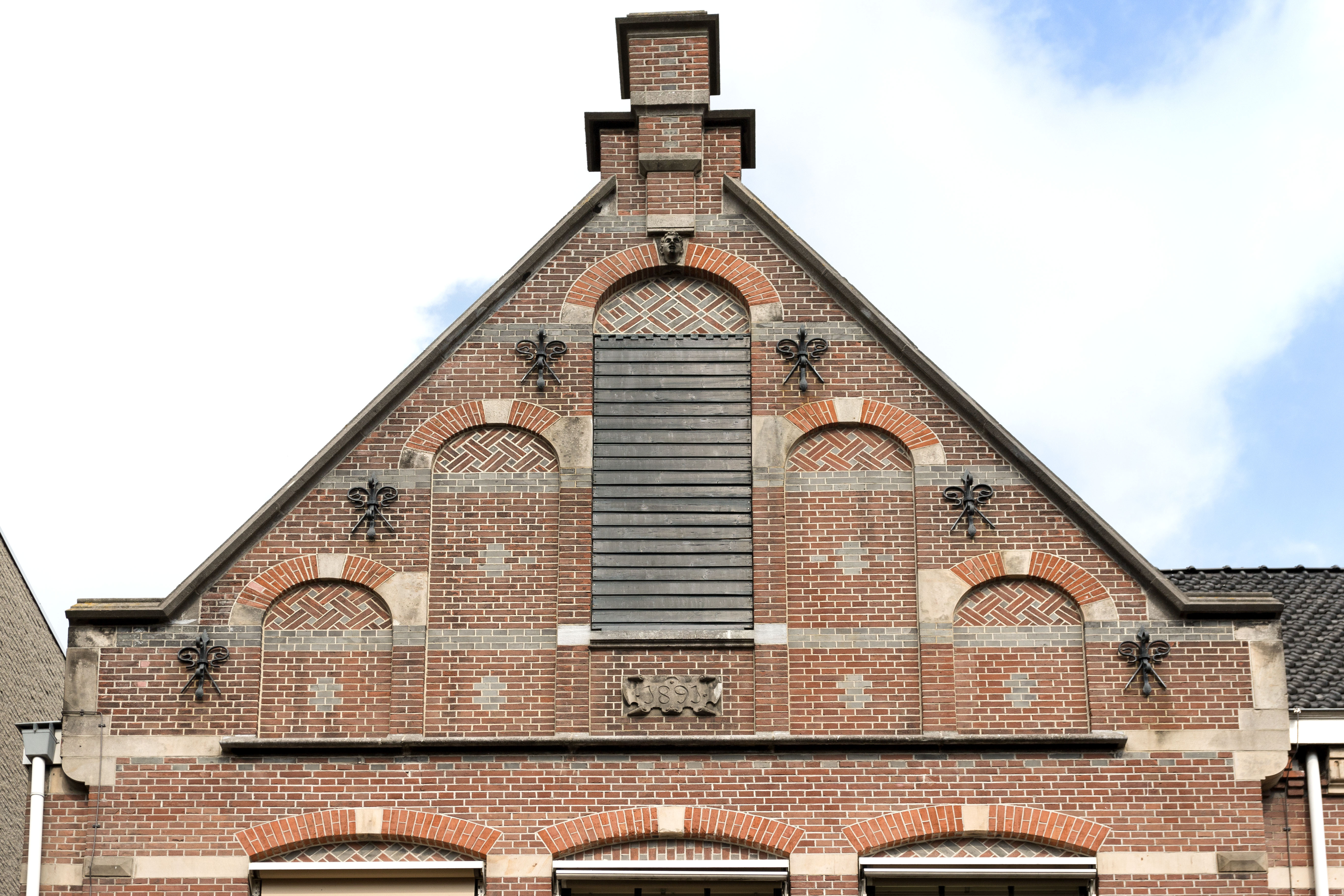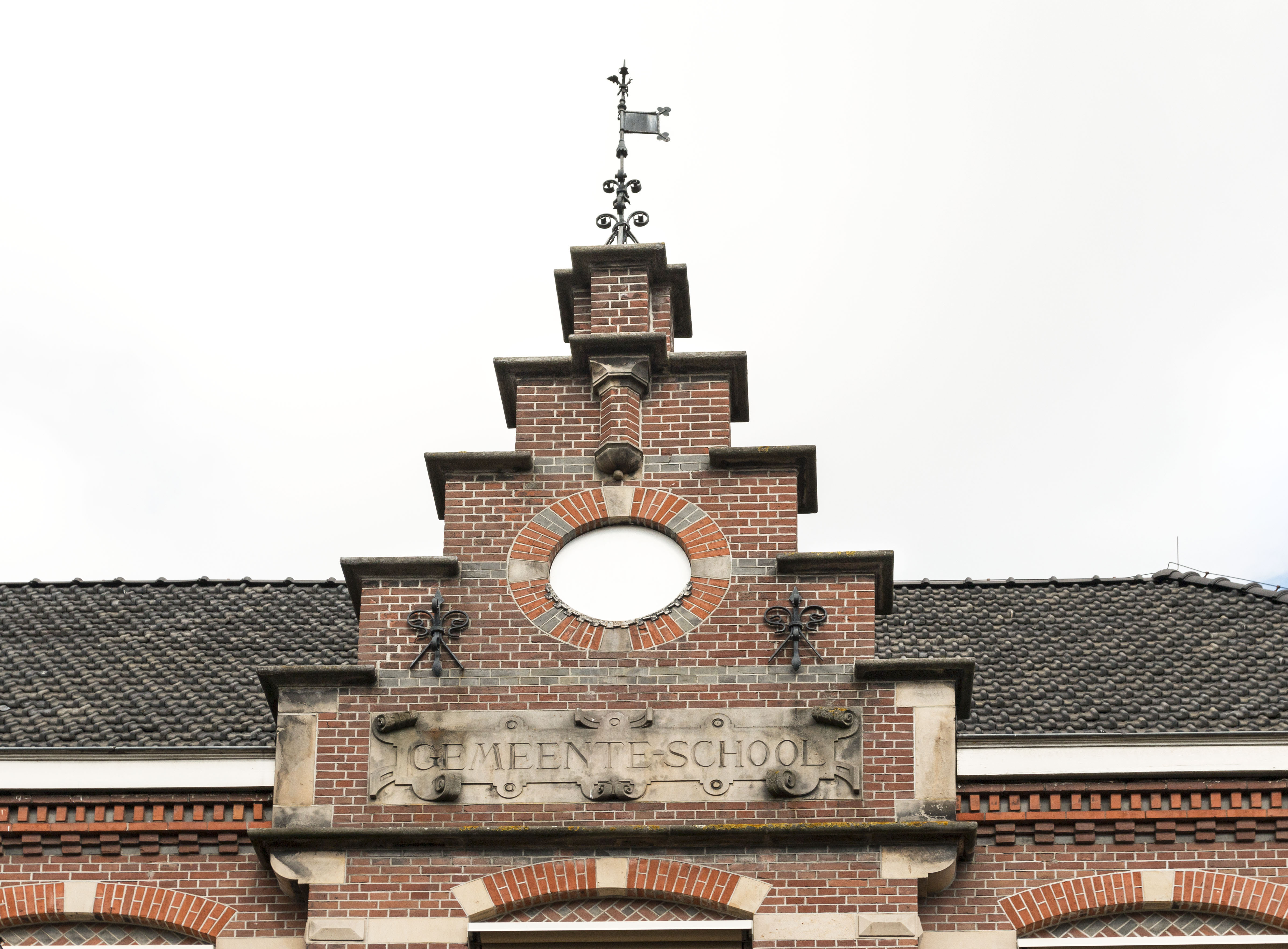 De naam Gemeente-School staat geschreven in een stenen cartouche met gekrulde randen in de onderste strook van een klein trapgeveltje in het midden van de gevel. Een tweede cartouche vermeldt het bouwjaar: 1891.