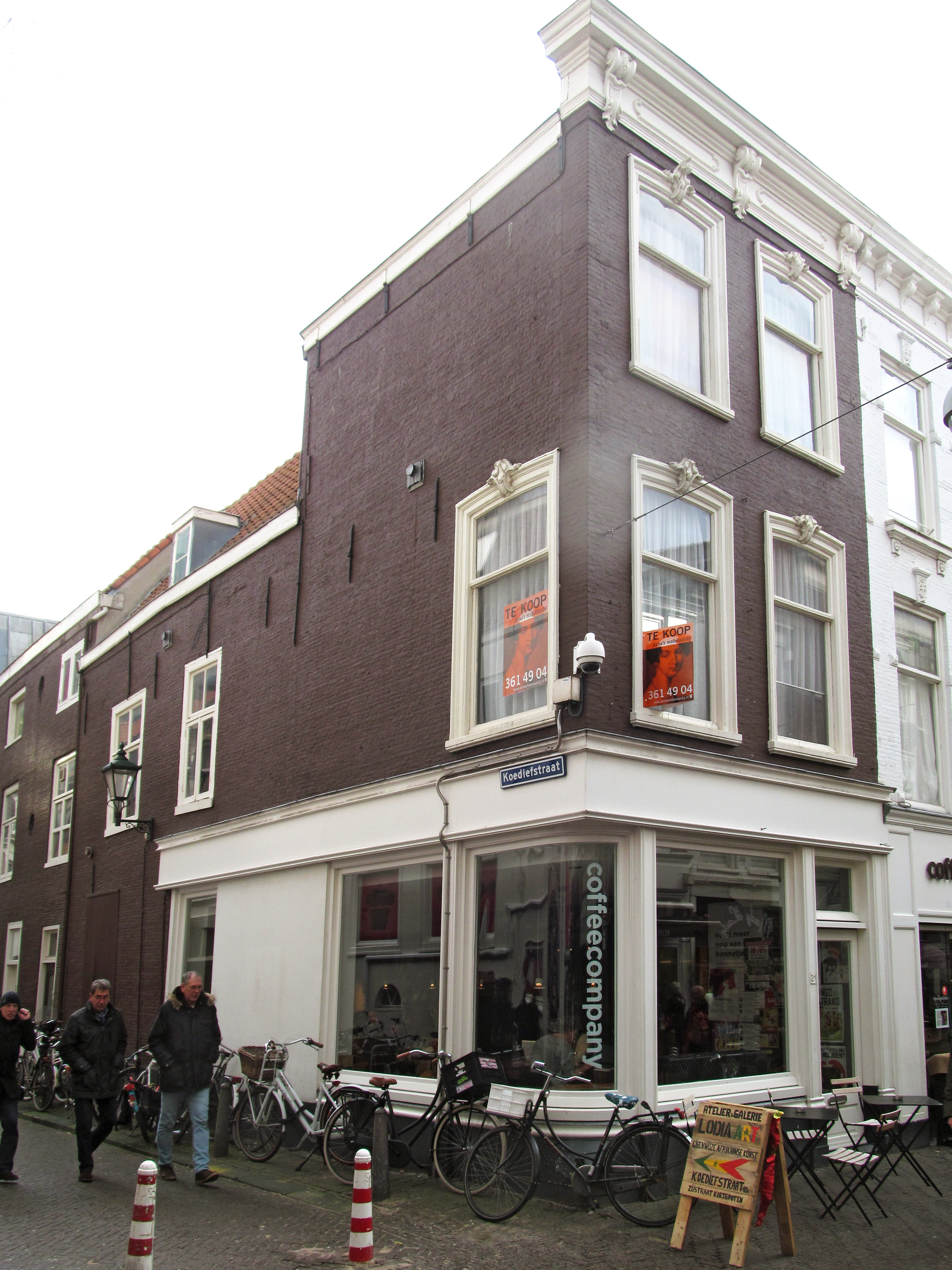 Van oorsprong zeventiende eeuws pand op de hoek van de Koediefstraat en de Korte Poten op langgerekte plattegrond bestaande uit een twee laags achterdeel onder een met pannen gedekte kap en een hoger opgetrokken voorbouw van drie bouwlagen. Vermoedelijk dateert de ophoging uit 1866. In ieder geval is toen de huidige twee assen brede voorgevel opgetrokken in eclectische stijl.