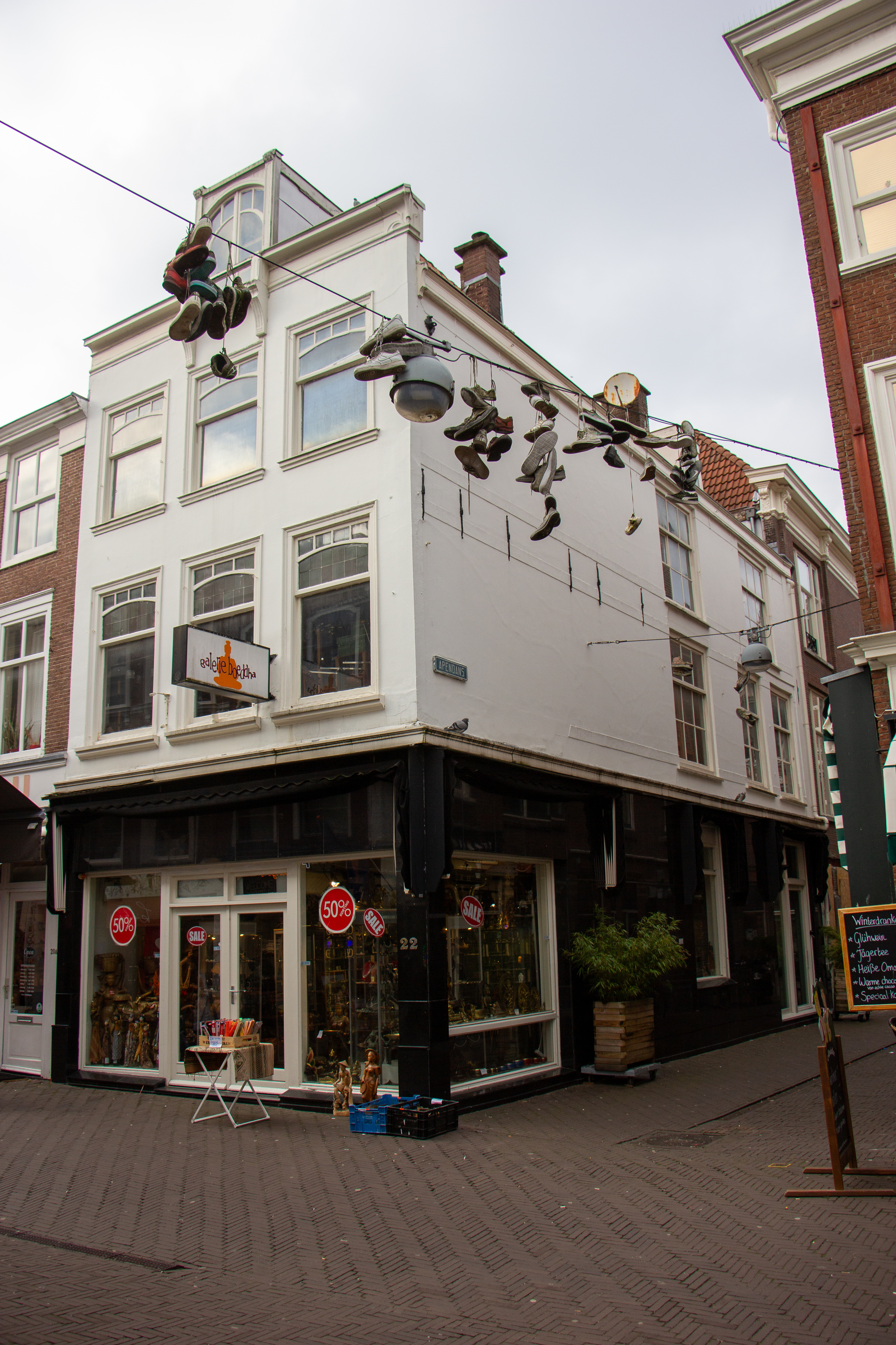 De Korte Poten is als sinds de zestiende eeuw een straat waar bedrijvigheid en handel waren geconcentreerd. Rond 1850 doet het winkelconcept zoals wij dat nu kennen haar intrede en worden veel woonhuis- en bedrijfspuien in de bestaande bebouwing vervangen door winkelpuien. De voortschrijdende cityvorming van de binnenstad en daarmee het alsmaar belangrijker worden van de winkelfunctie voor de Korte Poten zorgt ervoor dat vanaf 1875 veel van de oude panden wordt gesloopt of zodanig verbouwd dat er sprake is van een ware metamorfose. Het pand korte Poten 20a is een goede representant van de nog bewaard gebleven oudere bebouwing van voor 1875 dat voor de nieuwe winkelfunctie in 1902 ingrijpend werd verbouwd. Het hoekpand bezit wit gepleisterde lijstgevels, zowel langs de Korte Poten als in de Apendans. Tussen begane grond en eerste verdieping bevindt zich in de zijgevel (Apendans) een tweetal muurankers, die waarschijnlijk 18de eeuws zijn. Niet uitgesloten is dat deze ankers nog ouder zijn en samenhangen met een samengestelde balklaag. Tussen eerste verdieping en tweede verdieping bevindt zich een reeks muurankers, waarschijnlijk ook 18de eeuws. In de achterste helft van de zijgevel bevinden zich op eerste en tweede verdieping vensters die dateren uit de tweede helft van de 19e eeuw. De voorgevel (Korte Poten) is een drielaags lijstgevel met een sober geprofileerde kroonlijst. Deze gevel dateert uit 1902. De vormgeving van de dakkapel en detaillering van de bovenlichten van de verdiepingsvensters vertonen de kenmerkende vormgeving van de Art Nouveau. De winkelpui is in loop der decennia meerdere malen vernieuwd.