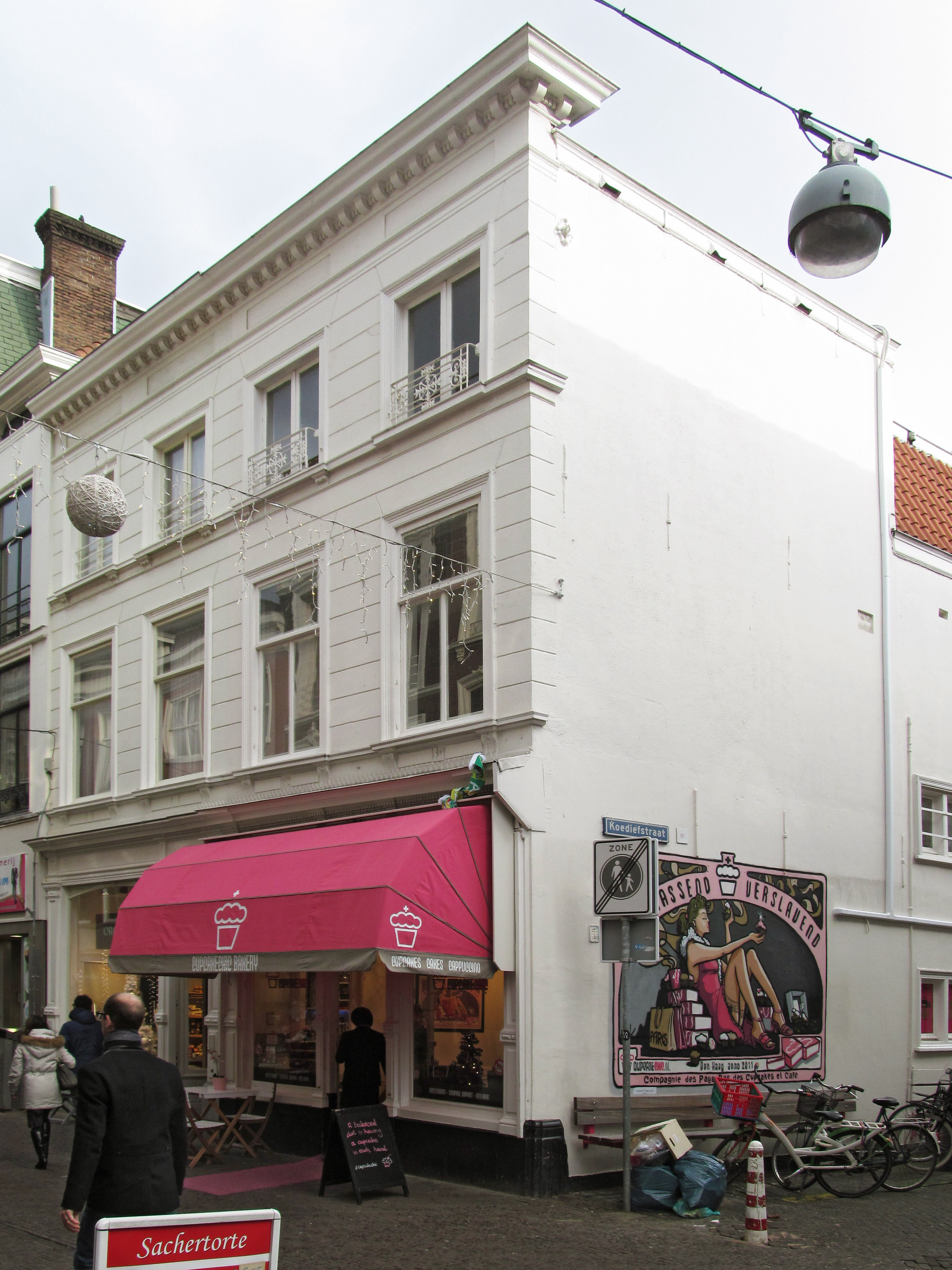 De Korte Poten is als sinds de zestiende eeuw een straat waar bedrijvigheid en handel waren geconcentreerd. Rond 1850 doet het winkelconcept zoals wij dat nu kennen haar intrede en worden veel woonhuis- en bedrijfspuien in de bestaande bebouwing vervangen door winkelpuien. De voortschrijdende cityvorming van de binnenstad en daarmee het alsmaar belangrijker worden van de winkelfunctie voor de Korte Poten zorgt ervoor dat vanaf 1875 veel van de oude panden wordt gesloopt of zodanig verbouwd dat er sprake is van een ware metamorfose. Het pand Korte Poten 23 op de hoek met de Koediefstraat is hiervan een goede representant. De voorgevel is een drielaags in schijnlagen witgepleisterde vroeg negentiende eeuwse lijstgevel. De verdiepingshoogte neemt naar boven toe af. In het gevelvlak zijn tussen begane grond en eerste verdieping, en tussen eerste en tweede verdieping geprofileerde waterlijsten aangebracht. De gevel wordt aan de bovenzijde afgesloten door een geprofileerd hoofdgestel met onder de kroonlijst een tandlijst, die bovendien voorzien is van een reeks kleine consoles. De houten klassieke winkelpui met hardsteen borstwering, rijk gesneden pilasters en hoofdgestel met eierlijst dateert uit het laatste kwart van de 19de eeuw.