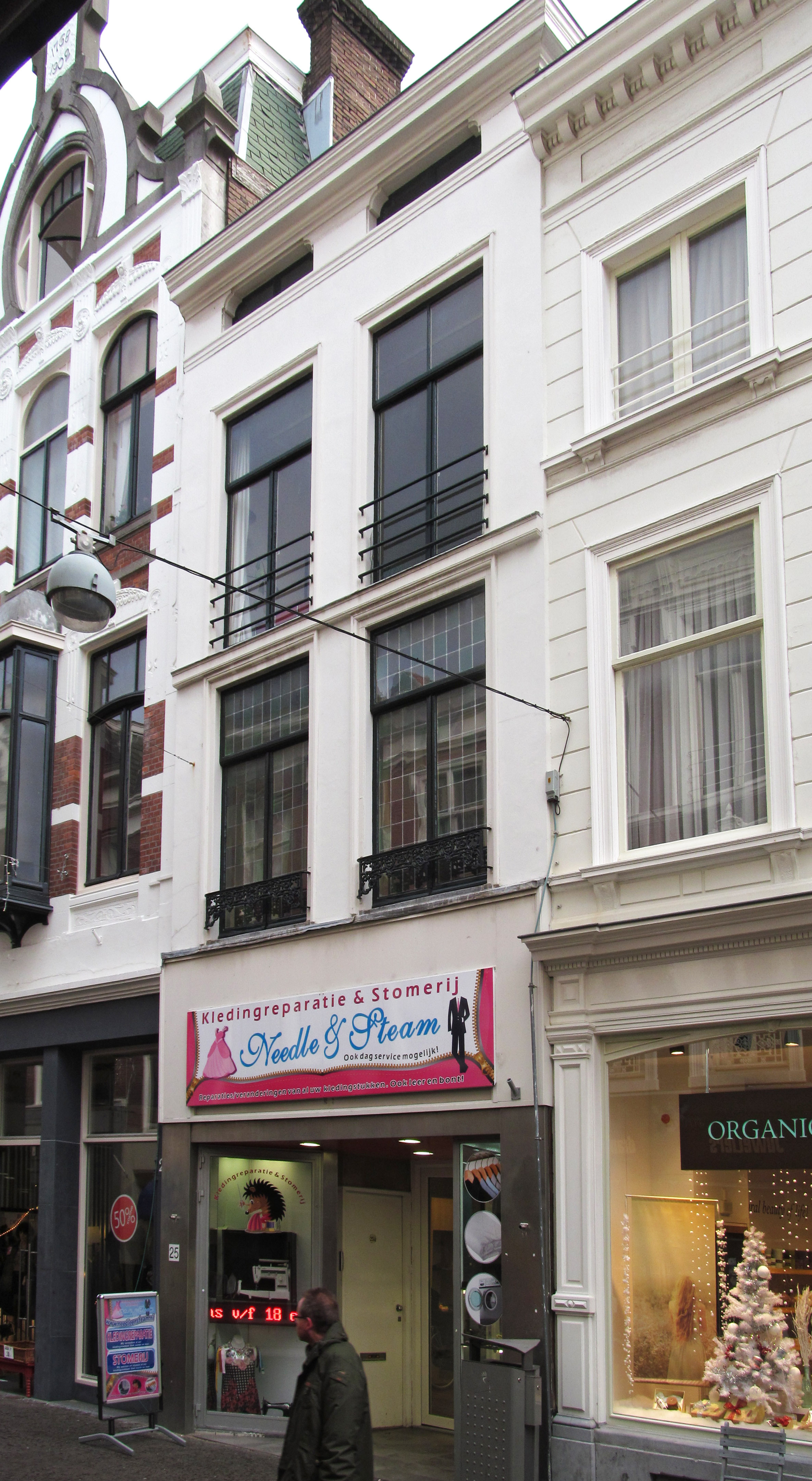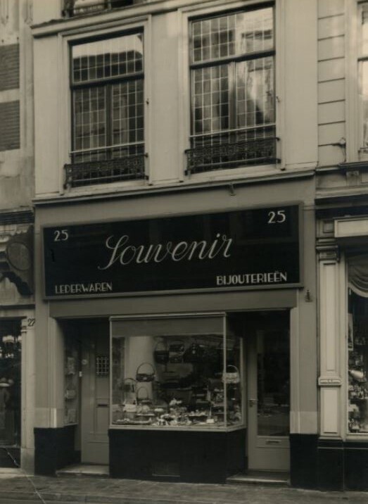 De Korte Poten is als sinds de zestiende eeuw een straat waar bedrijvigheid en handel waren geconcentreerd. Rond 1850 doet het winkelconcept zoals wij dat nu kennen haar intrede en worden veel woonhuis- en bedrijfspuien in de bestaande bebouwing vervangen door winkelpuien. De voortschrijdende cityvorming van de binnenstad en daarmee het alsmaar belangrijker worden van de winkelfunctie voor de Korte Poten zorgt ervoor dat vanaf 1875 veel van de oude panden wordt gesloopt of zodanig verbouwd dat er sprake is van een ware metamorfose. Het pand Korte Poten 25/25a is een goede representant van de nog bewaard gebleven oudere bebouwing van voor 1875 met een goed verlopen negentiende eeuws transformatieproces. De achttiende eeuwse oorsprong is herkenbaar aan de geringe gevelbreedte en de op vlucht gebouwde voorgevel. De voorgevel is een drielaags gepleisterde lijstgevel, die vermoedelijk in de negentiende eeuw is verhoogd door de derde bouwlaag even hoog te maken als de tweede bouwlaag. In ieder geval dateren de geprofileerde kozijnen op deze bouwlagen uit de negentiende eeuw. De houten geprofileerde kroonlijst die de gevel beëindigd heeft in het fries twee zoldervensters. De winkelpui is de loop der tijd meerdere malen gemoderniseerd.
