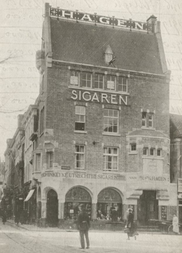 Woon-winkelhuis, gebouwd in 1920 naar ontwerp van A.J. Kropholler. Grotendeels uit baksteen opgetrokken pand, bestaande uit parterre, drie verdiepingen en een kapverdieping, dat een onregelmatig rechthoekige plattegrond beslaat. Het markant op de hoek van het Bleijenburg en Korte Poten gesitueerde pand is gebouwd voor de sigarenwinkel van de firma Hagen waarvan de naam oorspronkelijk in de ijzeren bekroning van de daknok was aangebracht. Het hoge, met leien gedekte, zadeldak wordt afgesloten door puntgevels. De parterre, waarin rondbogige omlijstingen van etalage-vensters en ingangen, is bekleed met natuursteen. Natuursteen is ook toegepast voor hoekblokken, uitkragingen en consoles. De hoektravee aan de Korte Poten is over de parterre en de eerste verdieping afgeschuind; hier bevindt zich de winkelingang. Tegen de smalle gevel aan de Korte Poten en boven de ingang naar het woonhuis aan het Bleijenburg zijn erkers op natuurstenen onderkragingen aangebracht. De laatst genoemde erker is versierd met het gebeeldhouwde koninklijk wapen en het opschrift: "Hofleverancier". Voor het rondbogige zoldervenster in de puntgevel aan de Korte Poten bevindt zich een vijfhoekig balkon op natuurstenen onderkraging. Het metselwerk bestaat uit handgevormde, rode baksteen.