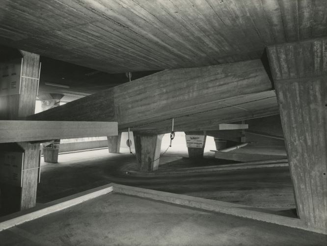 Parkeergarage in utilitaire, modernistische stijl gebouwd tussen 1961-1965 naar ontwerp van het architectenbureau van J.A. Lucas en H.E. Niemeijer.