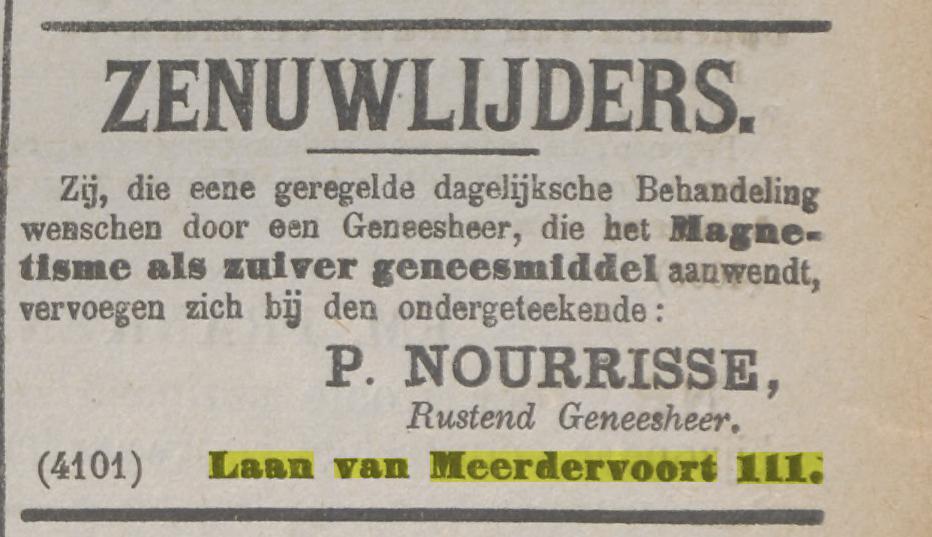 Het pand is gebouwd in opdracht van Pieter Nourrisse (overleden in 1895), geneesheer en magnetiseur. Hij verwierf de bouwgrond op 4 september 1888 van Cornelis Goekoop Davidszoon. Opvallend is dat de vergunning voor de bouw van het huis al op 28 augustus 1888 is verleend en dat de plattegronden van het ontwerp niet overeenkomen met de huidige situatie. Het is dus niet ondenkbaar dat Nourrisse bij de bouw als nieuwe eigenaar de plattegronden liet aanpassen naar zijn eigen wensen. Zijn weduwe verkoopt na het overlijden van haar man in 1895 het huis in 1896.