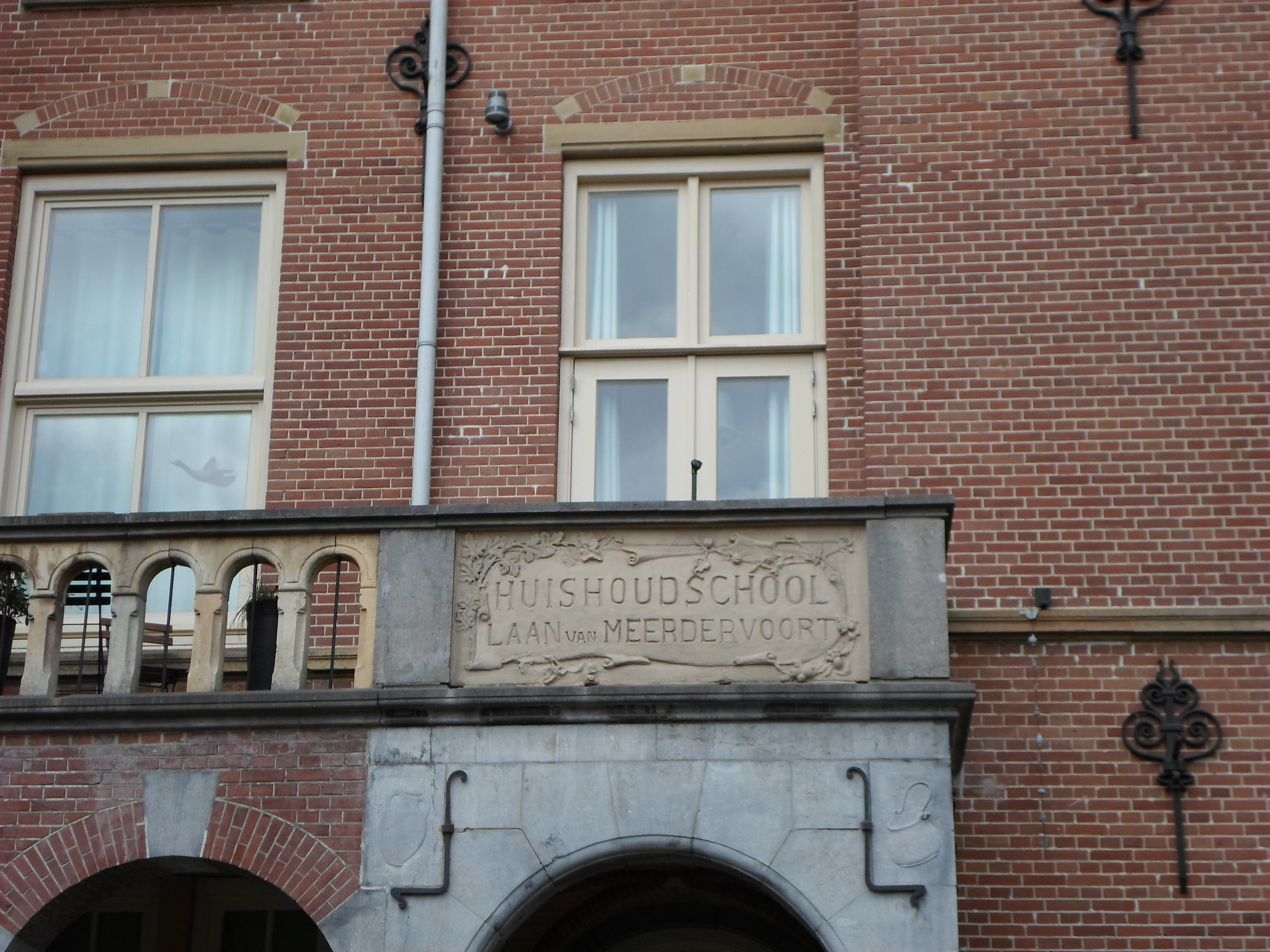De gevel is rijkelijk versierd met verwijzingen naar de huishoudschool; het opschrift Huishoudschool Laan van Meerdervoort gaat vergezeld van een kookpot en een kruik, en vooral de mooi gesneden reliëfs op de erker laten op aanschouwelijke wijze de huishoudelijke werkjes zien zoals strijken, koffiemalen, groente schoonmaken en naaien.