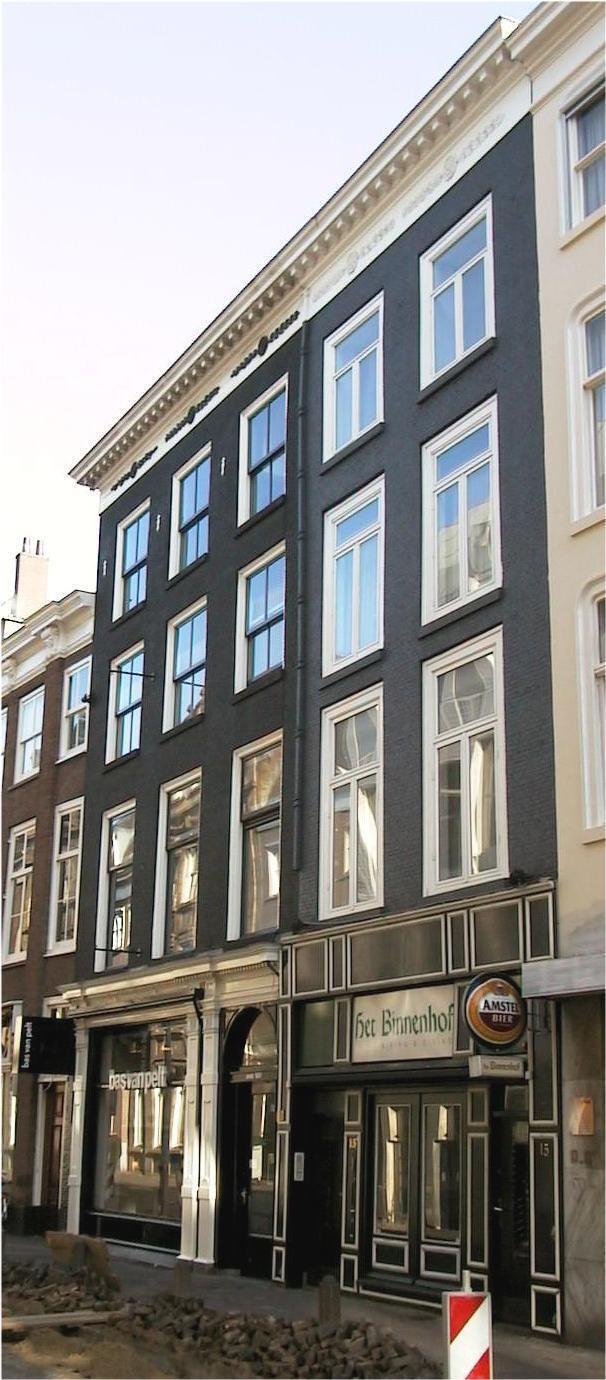 Breed 19e eeuws pand met lijstgevel - in het fries van de lijst gesneden versieringen - onderpui in tweeën gewijzigd.