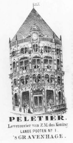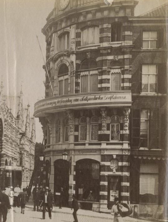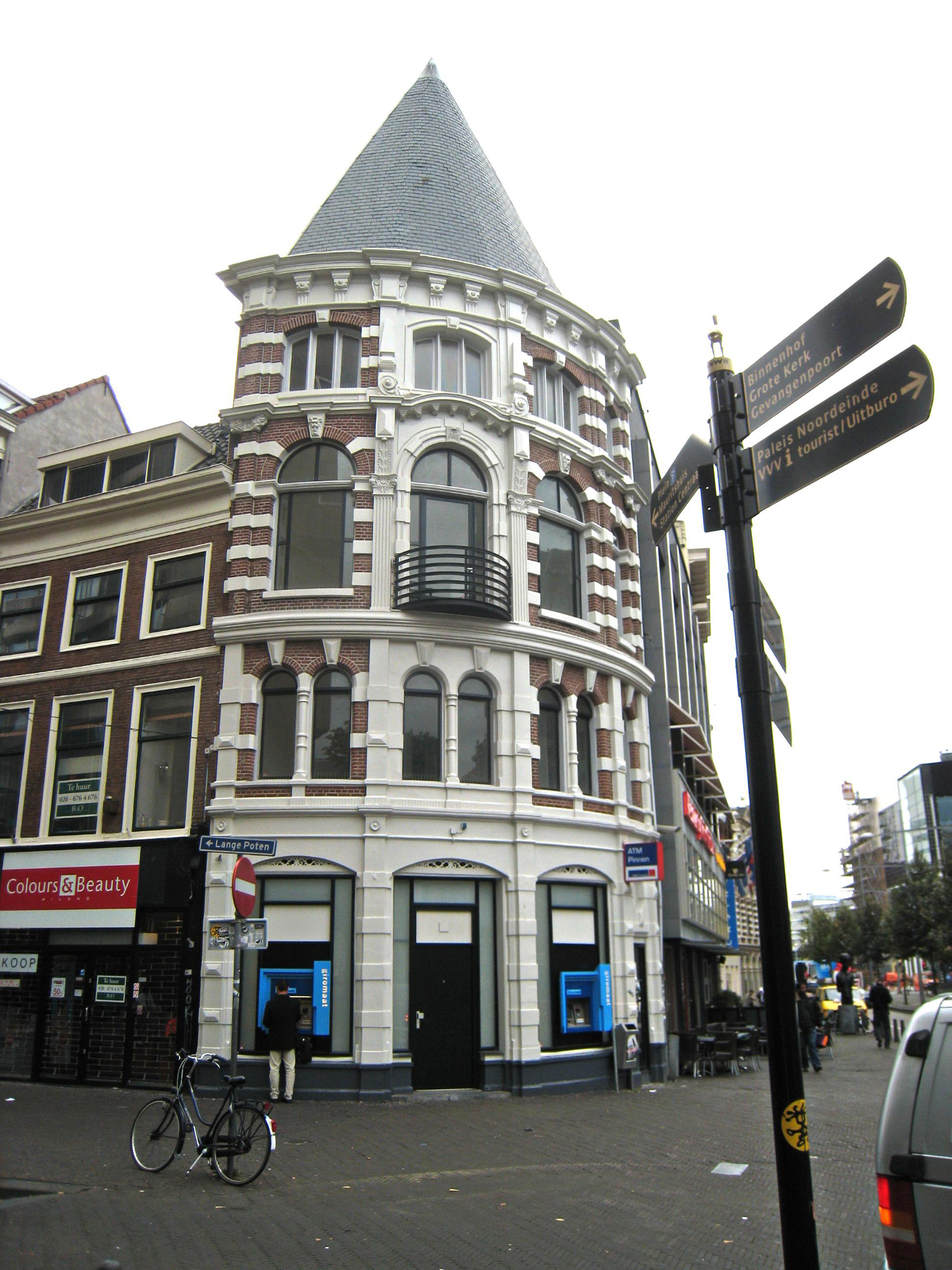 Als winkel-woonhuis ontworpen pand uit circa 1890 in een rijke neo-renaissancestijl bestaande uit vier bouwlagen onder een kapverdieping. Het pand is gelegen op de hoek van de Lange Poten en het Spui.