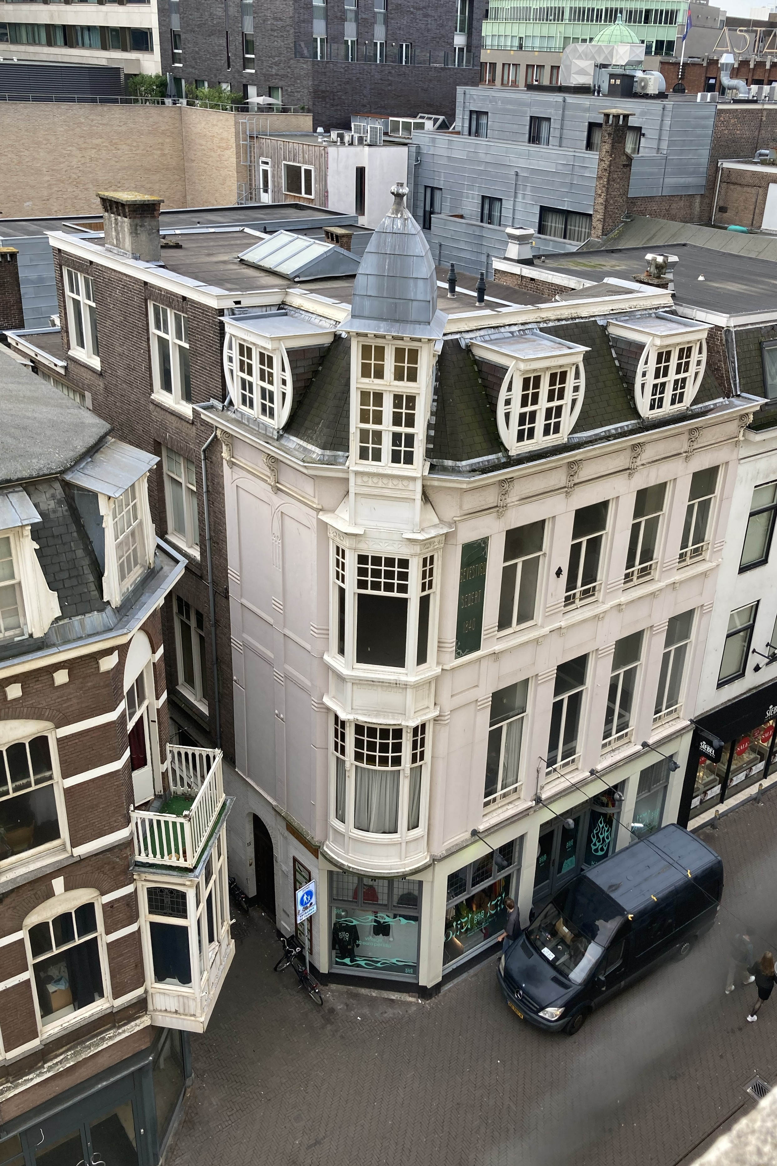 Pand op de hoek van de Lange Poten en de Bagijnestraat van drie bouwlagen onder een kap. Het huidige uiterlijk dateert uit 1905 toen het ingrijpend is verbouwd naar ontwerp van L.A.H. de Wolf ten behoeve van winkels, kantoren en bovenwoningen. Het gevelontwerp uit 1905 is uitgevoerd in Art Nouveau.