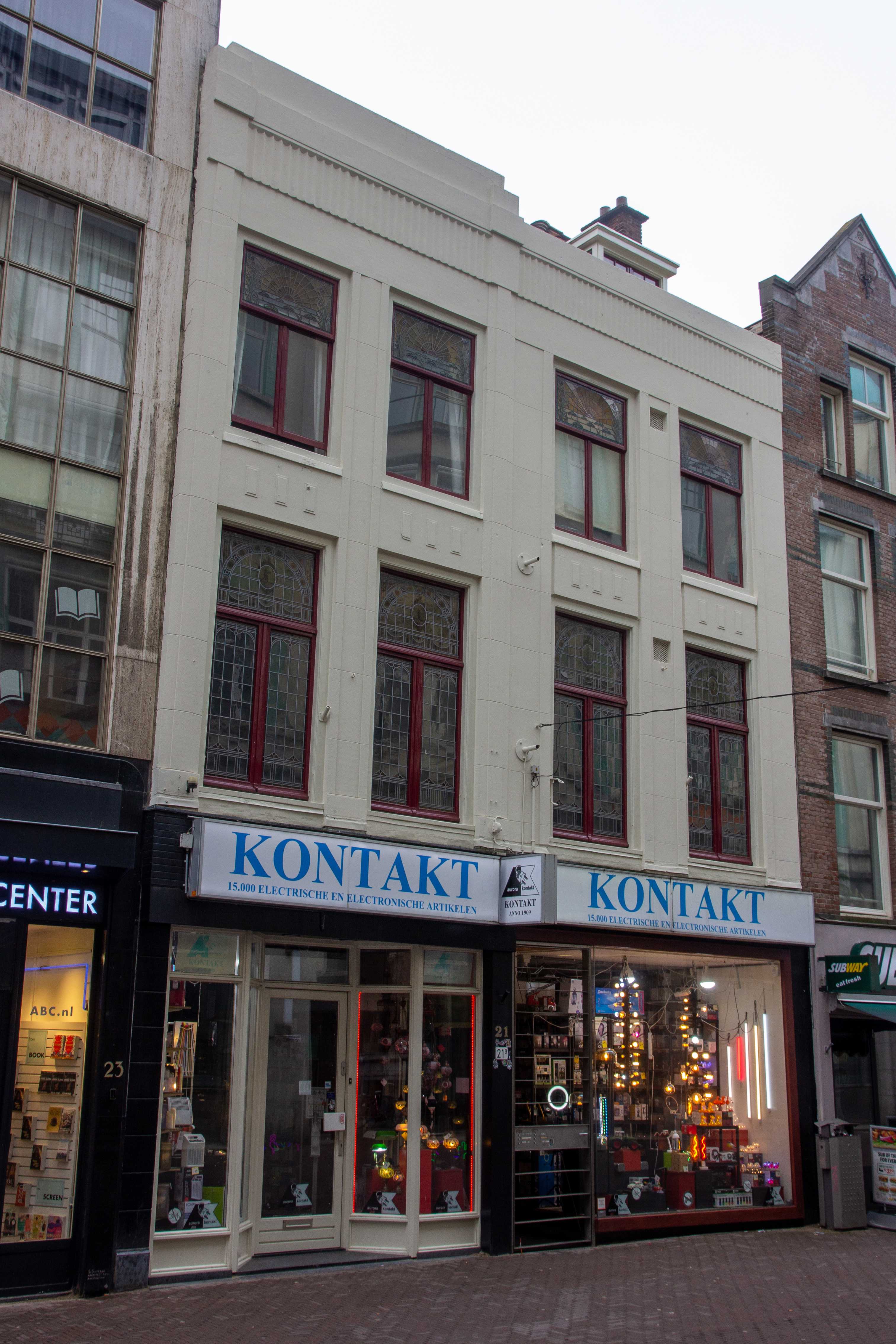De Lange Poten is al sinds de zestiende eeuw een straat waar bedrijvigheid en handel waren geconcentreerd. Rond 1850 doet het winkelconcept zoals wij dat nu kennen haar intrede en worden veel woonhuis- en bedrijfspuien in de bestaande bebouwing vervangen door winkelpuien. De voortschrijdende cityvorming van de binnenstad en daarmee het alsmaar belangrijker worden van de winkelfunctie voor de Lange Poten zorgt ervoor dat vanaf 1875 een groot aantal van de oude panden wordt vervangen. De nieuwe winkel-woonpanden panden zijn vaak breder en laten de rijke schakering zien van de snel opvolgende architectuurstijlen vanaf 1875 tot aan het Interbellum. Lange Poten 21 is een goede representant van de nog bewaard gebleven oudere bebouwing van voor 1875 die niet is afgebroken maar werd voorzien van een nieuwe voorgevel. Vanaf de late negentiende eeuw is het pand in verschillende fases verbouwd naar een winkelpand met bovenwoning, waardoor het pand een grote gelaagdheid bezit. Het voorhuis van Lange Poten 21 bestaat oorspronkelijk uit twee smalle panden die kort na 1807 zijn samengevoegd. Ondanks de samenvoeging bezitten beide bouwdelen nog een eigen schilddak. De exacte ouderdom van het pand is niet bekend maar het pand is van ten minste achttiende-eeuwse oorsprong. Dit blijkt onder meer uit de op vlucht staande voorgevels en de kapconstructie met gestapelde spanten boven het voorhuis. Inwendig is de opzet van twee zelfstandige casco’s nog goed afleesbaar, waarbij het rechterdeel iets breder is. Uit de tijd van de samenvoeging zijn ook interieurdelen bewaard gebleven, zoals de stucplafonds in de voorkamers op de eerste verdieping, meerdere schouwen en de stofschotten op een van de zolders. De huidige gevel uit 1921 is een bekleding van kunstzandsteen. Het ontwerp van architect Jos Duynstee is uitgevoerd in de in die periode populaire art-decostijl. Opvallend zijn de rijk gedetailleerde glas-in-loodramen op de eerste en tweede verdieping, waarvan die op de eerste verdieping een voor het interbellum kenmerkende decoratie hebben. De ramen op de tweede verdieping hebben een Art Nouveau-afwerking die bij een eerdere verbouwing rond 1900 zijn aangebracht. De winkelpuien zijn in loop der decennia meerdere malen vernieuwd. De naoorlogse aanpassingen in het interieur, zoals de afwerking van de badkamers en keukens, hebben de structuur intact gehouden, maar hebben geen verdere toegevoegde waarde. Ook het winkelinterieur op de begane grond is van recente datum.