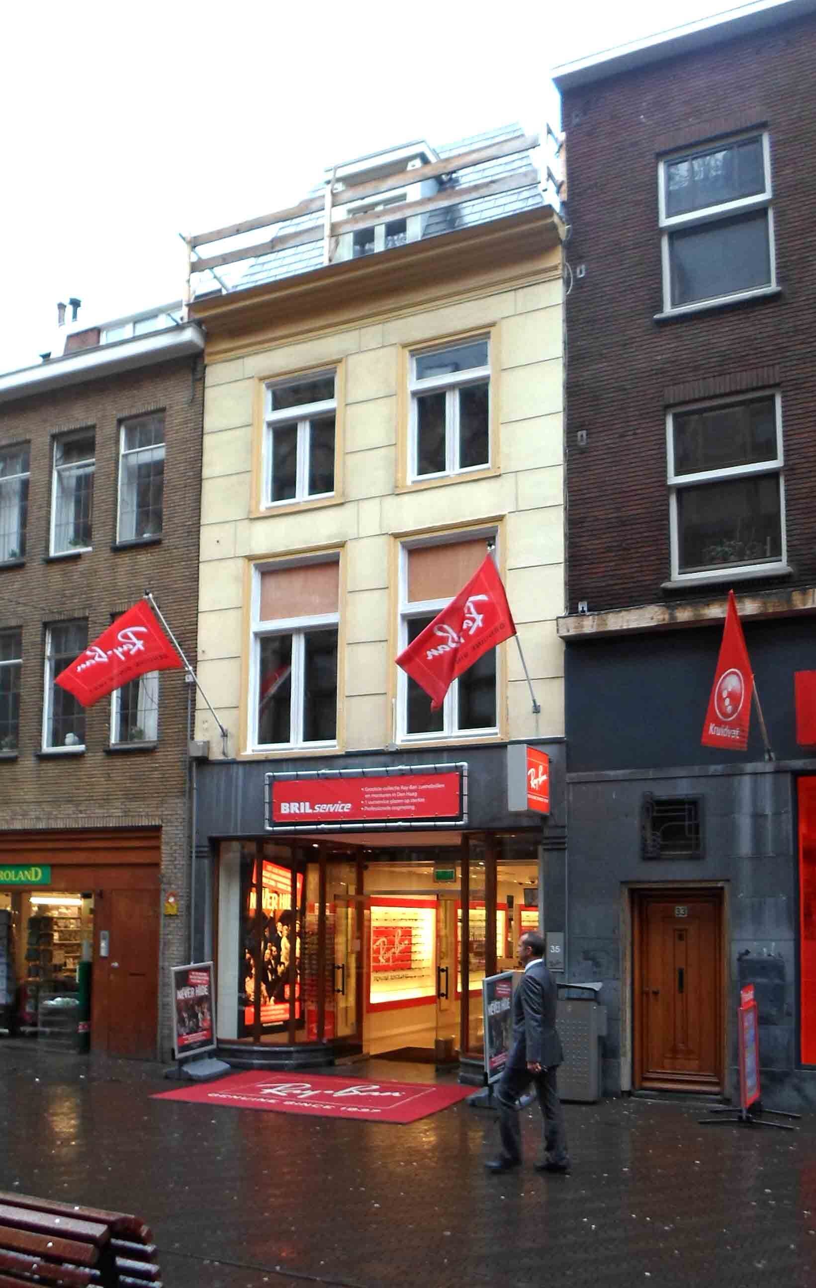 De Lange Poten is als sinds de zestiende eeuw een straat waar bedrijvigheid en handel waren geconcentreerd. Rond 1850 doet het winkelconcept zoals wij dat nu kennen haar intrede en worden veel woonhuis- en bedrijfspuien in de bestaande bebouwing vervangen door winkelpuien. De voortschrijdende cityvorming van de binnenstad en daarmee het alsmaar belangrijker worden van de winkelfunctie voor de Lange Poten zorgt ervoor dat vanaf 1875 veel van de oude panden wordt gesloopt of zodanig verbouwd dat er sprake is van een forse metamorfose. Het pand Lange Poten 35 is een goede representant van de oudere bebouwing van voor 1875. De achttiende eeuwse oorsprong is herkenbaar aan de geringe gevelbreedte. Vermoedelijk is de van oorsprong lagere tweede verdieping in de eerste helft van de negentiende eeuw verhoogd. In ieder geval zijn het pleisterwerk en de kozijnen uit de negentiende eeuw. In 1915 is een winkelpui aangebracht waarvan de hoofdvorm van gebogen etalages en middenportiek bewaard is gebleven.