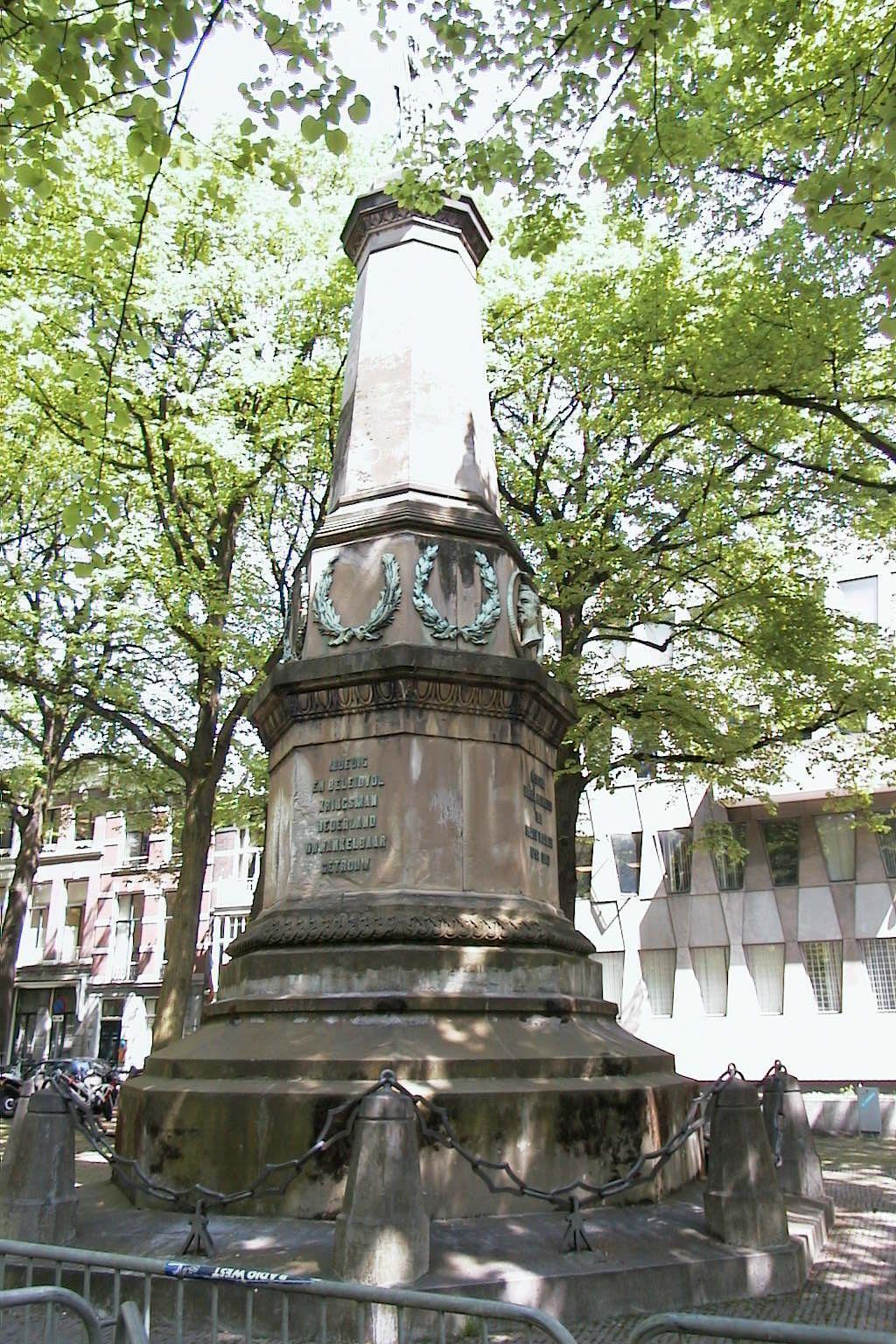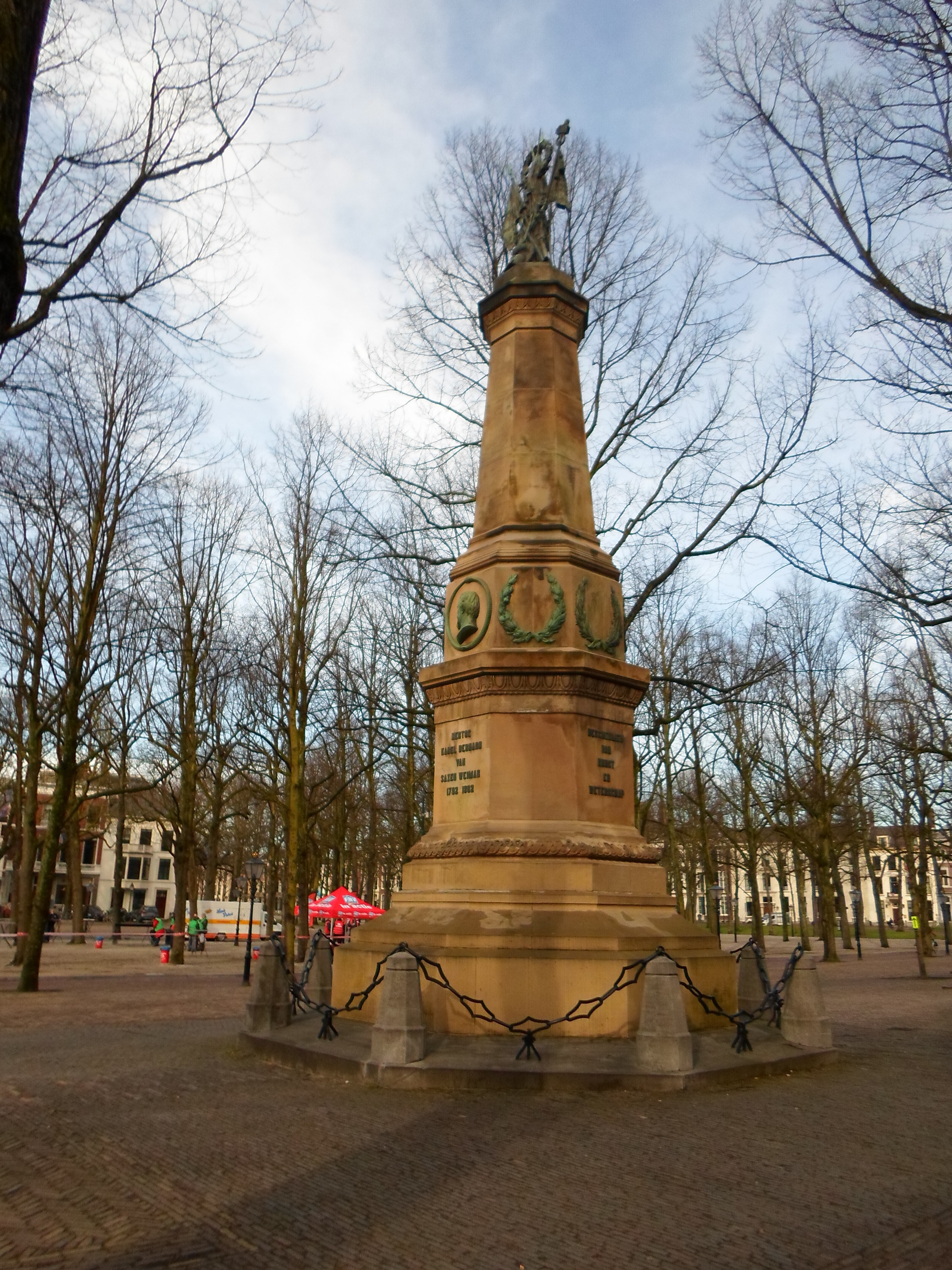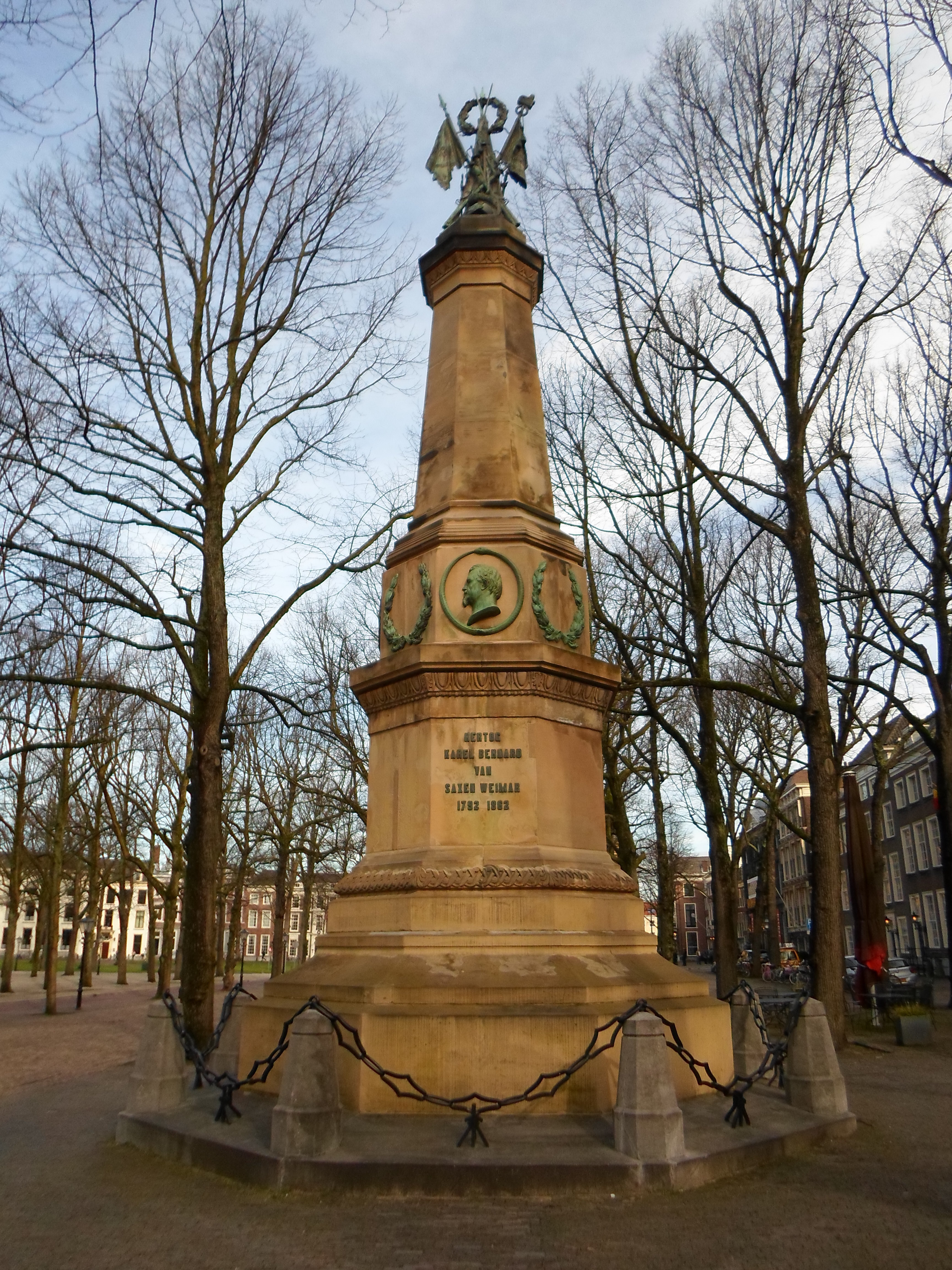 Gedenknaald van 15 meter hoog ter nagedachtenis aan Karel Bernard Hertog van Saxen-Weimar (1792-1862), schoonvader van prins Hendrik de Zeevaarder. Hij werd in 1848 commandant van het leger in Nederlands-Indie. Voor het ontwerp was H.P. Vogel verantwoordelijk voor de architectonische elementen en J.Ph. Koelman voor de ornamenten. Het monument bestaat uit een achthoekig piedestal en een achthoekige zuil, beide van grauwe Udelfanger steen. De zuil wordt bekroond door een bronzen wapentrofee. Het medaillon met beeltenis van de hertog en profil, de kransen van laurier- en eikebladeren en het wapenschild, alle boven het voetstuk gesitueerd, zijn eveneens in brons gegoten. Op het voetstuk zijn op vier van de acht zijden opschriften aangebracht. Het gedenkteken staat op een hardstenen plateau, waarlangs achtkantige paaltjes met smeedijzeren kettingen. Waardering.