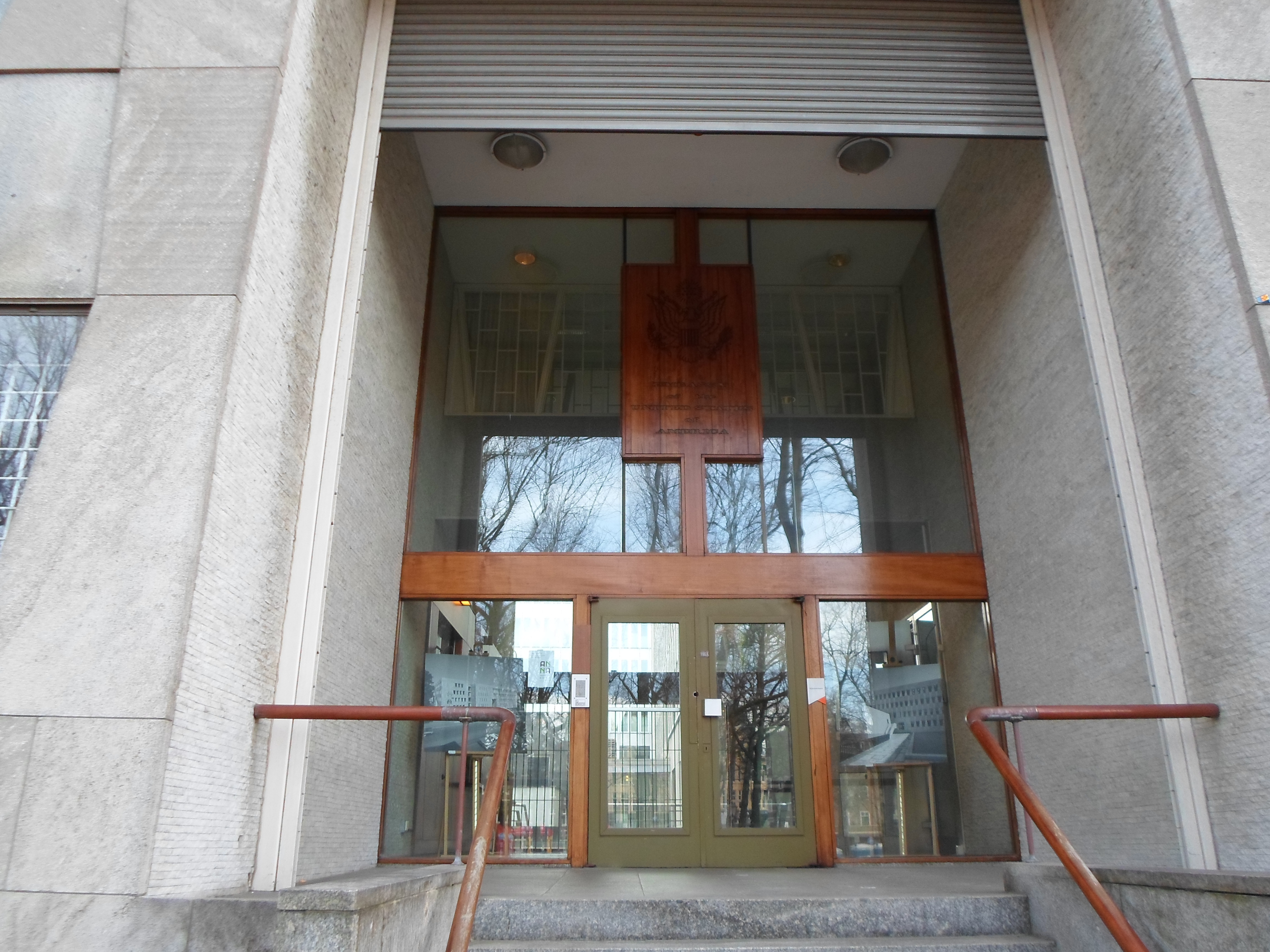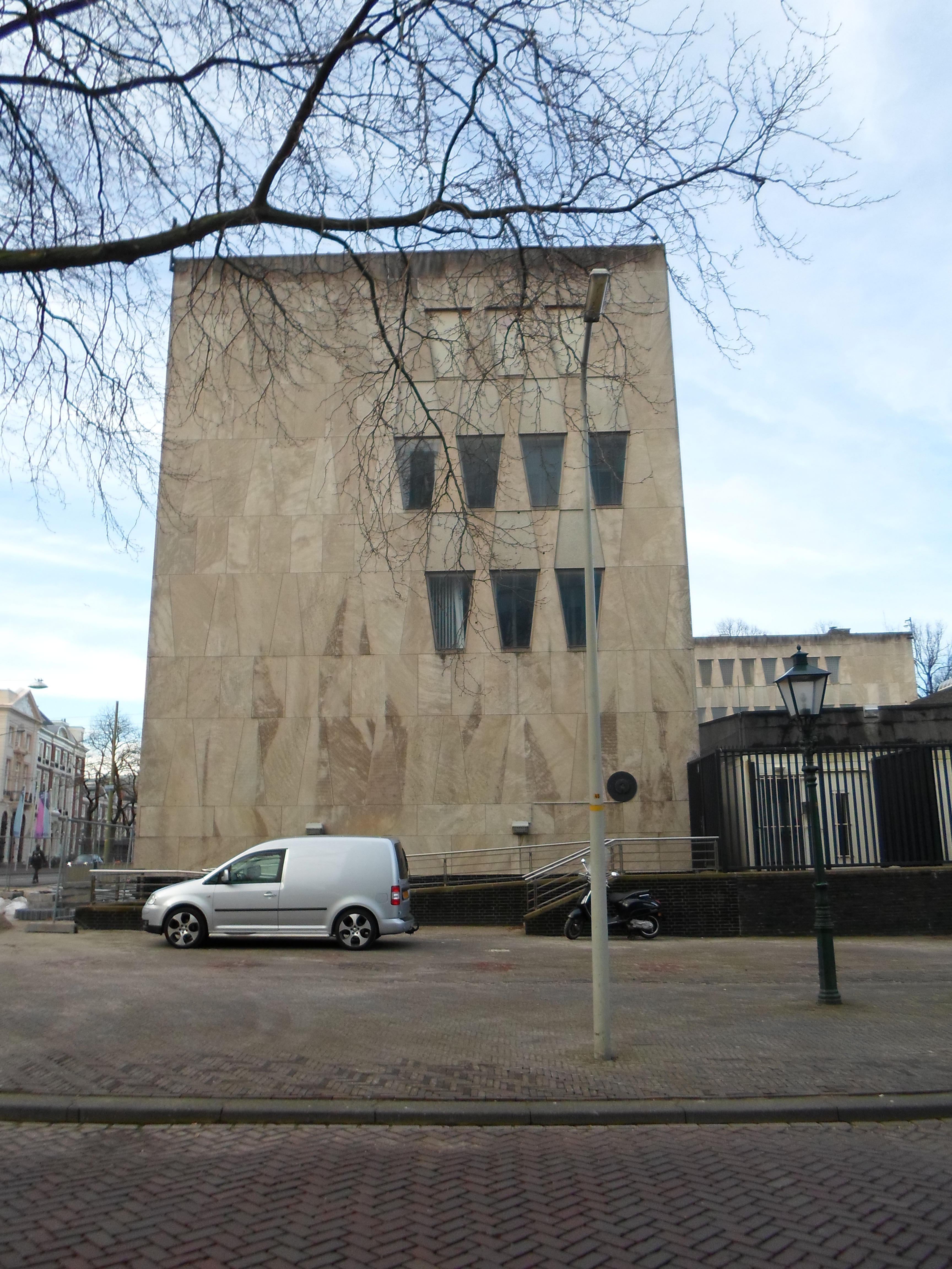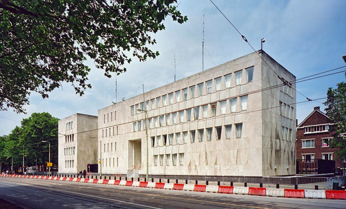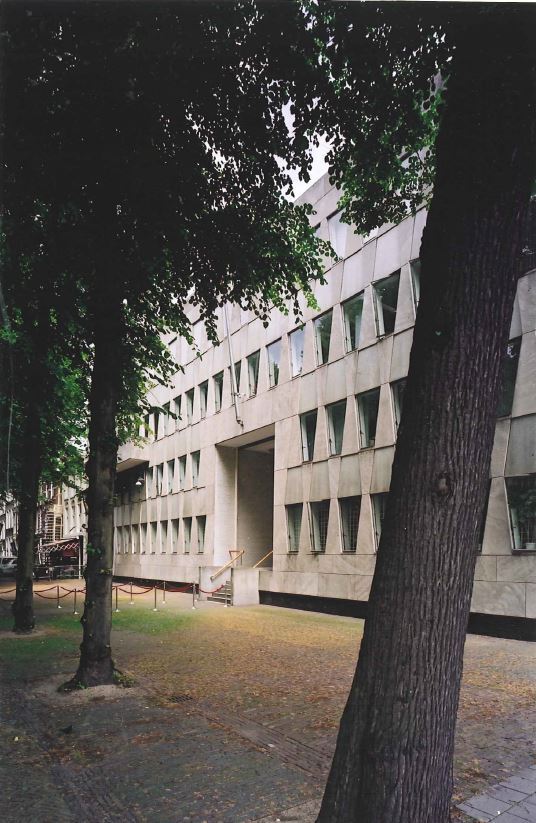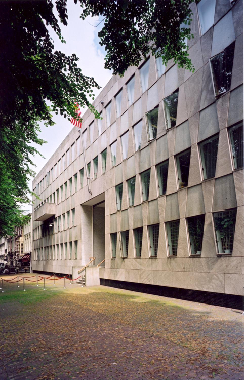Ambassadegebouw, binnenplaats met muur op de parkeerkelder, auditorium en beveiligingsunit |