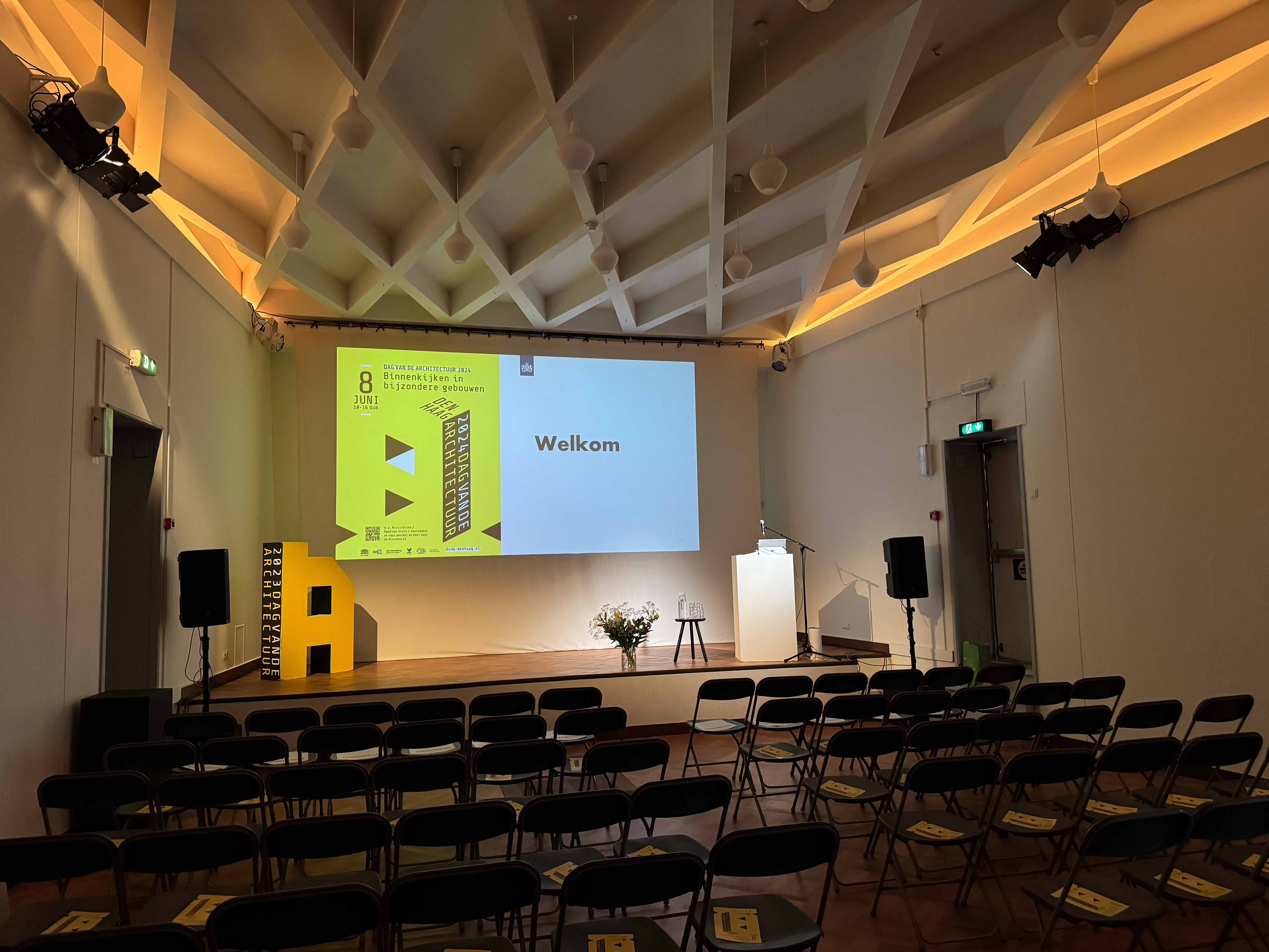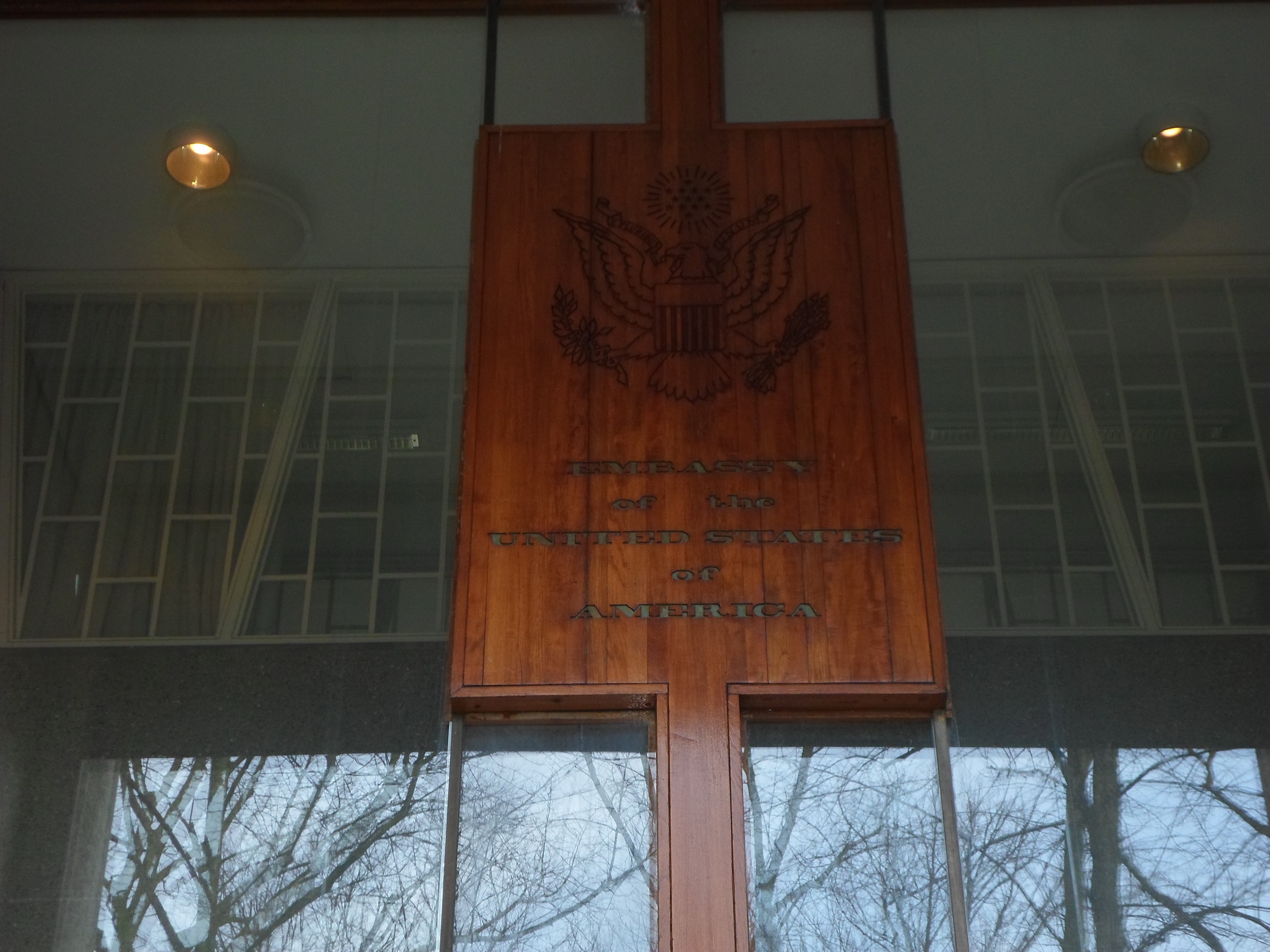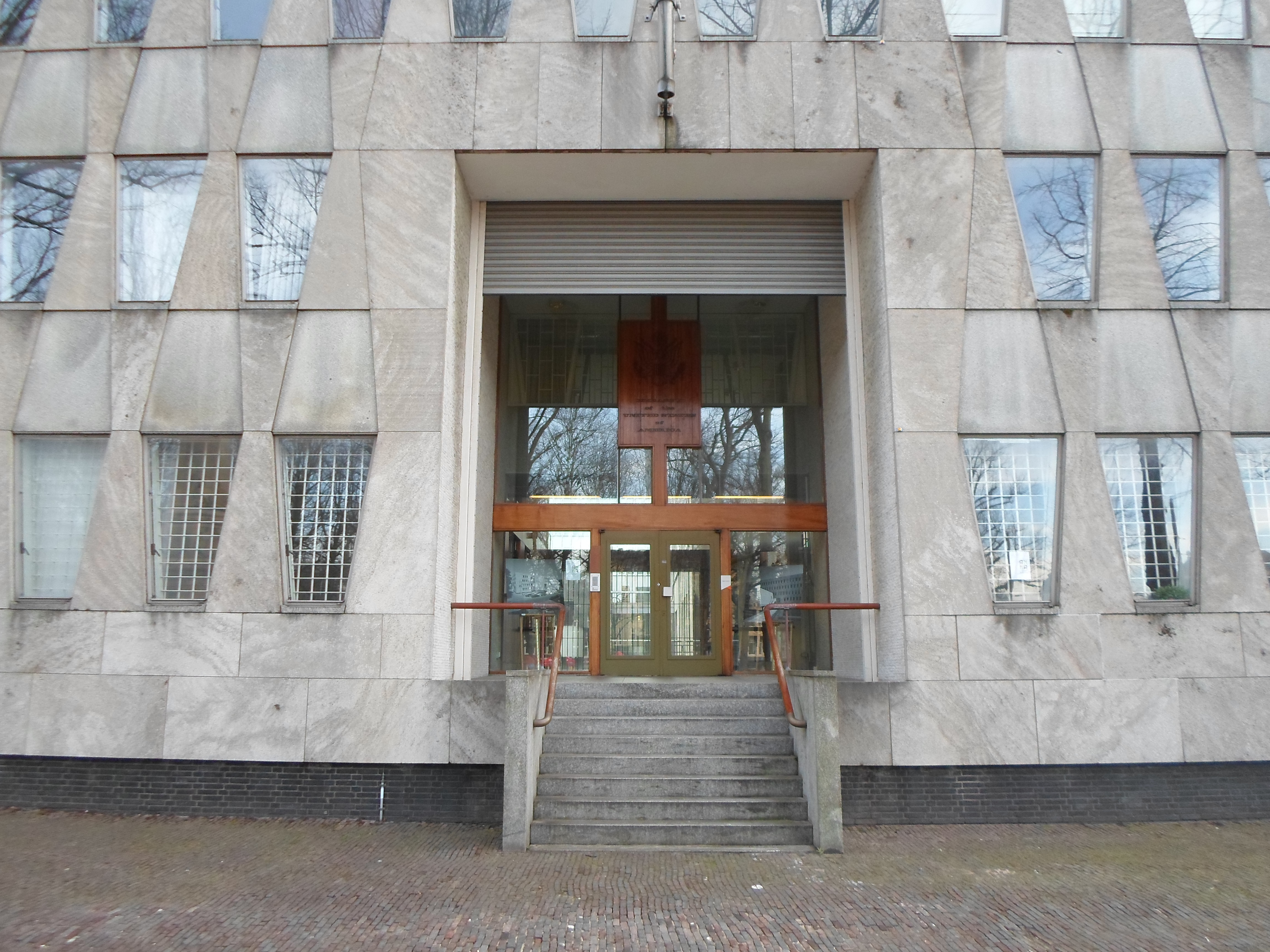 Ambassadegebouw, binnenplaats met muur op de parkeerkelder, auditorium en beveiligingsunit |