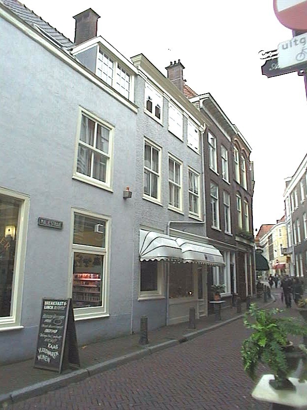 Pand met ingezwenkte halsgevel met aanzetvazen en recht afgedekte top van omstreeks 1700.