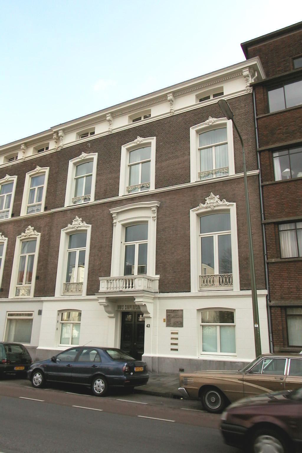 Pand op rechthoekige plattegrond, bestaande uit lage parterre, beletage, verdieping en lage kapverdieping in het met zink belegde zadeldak, drie vensterassen breed waarvan de rechter de ingang bevat. Boven de met hardsteen beklede plint is de parterre van een geblokte bepleistering voorzien. De gevel is verder als schoon-werk uitgevoerd, met uitzondering van de lage kapverdieping die gepleisterd is. De vensters bezitten flauw getoogde, geprofileerde houten omlijstingen met kuifstukken van stucwerk; alleen het middelste venster van de beletage draagt een kroonlijst met versierde voluutconsoles. Voor dit venster bevindt zich een balkon met balustrade, gedragen door consoles. De verdiepingen worden gescheiden door geprofileerde waterlijsten. De lage zolderverdieping wordt verlicht door liggende vensters, waartussen versierde voluutconsoles die de van modillons voorziene houten kroonlijst dragen. De vensters bezitten gietijzeren raamhekjes en stolpramen. De oorspronkelijke parterrevensters zijn door bredere ramen vervangen; ook de deur is vernieuwd. Rechts naast de deur bevindt zich een moderne gevelsteen waarop staat vermeld dat dit pand het geboortehuis is van de schrijver Louis Couperus. Waardering .