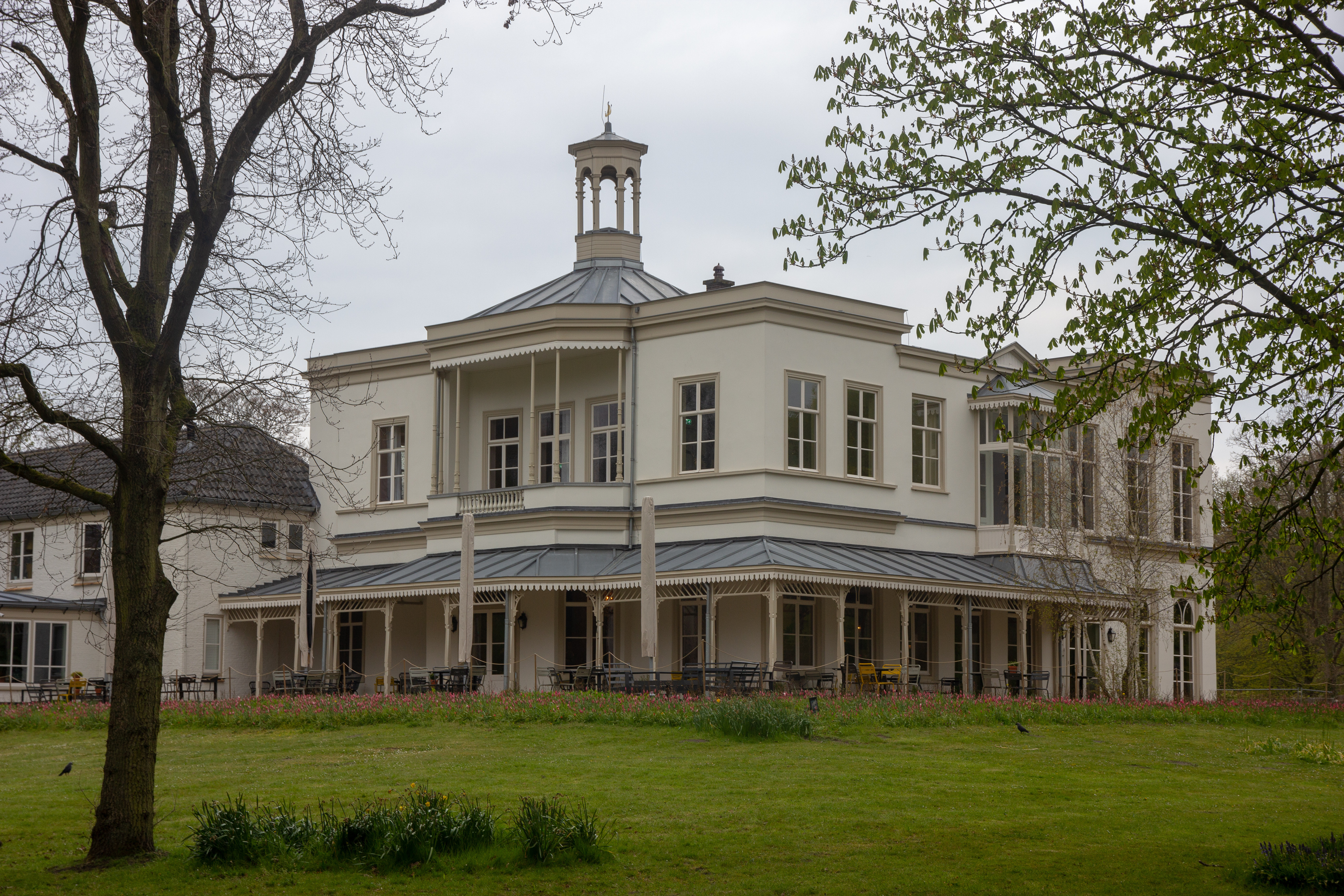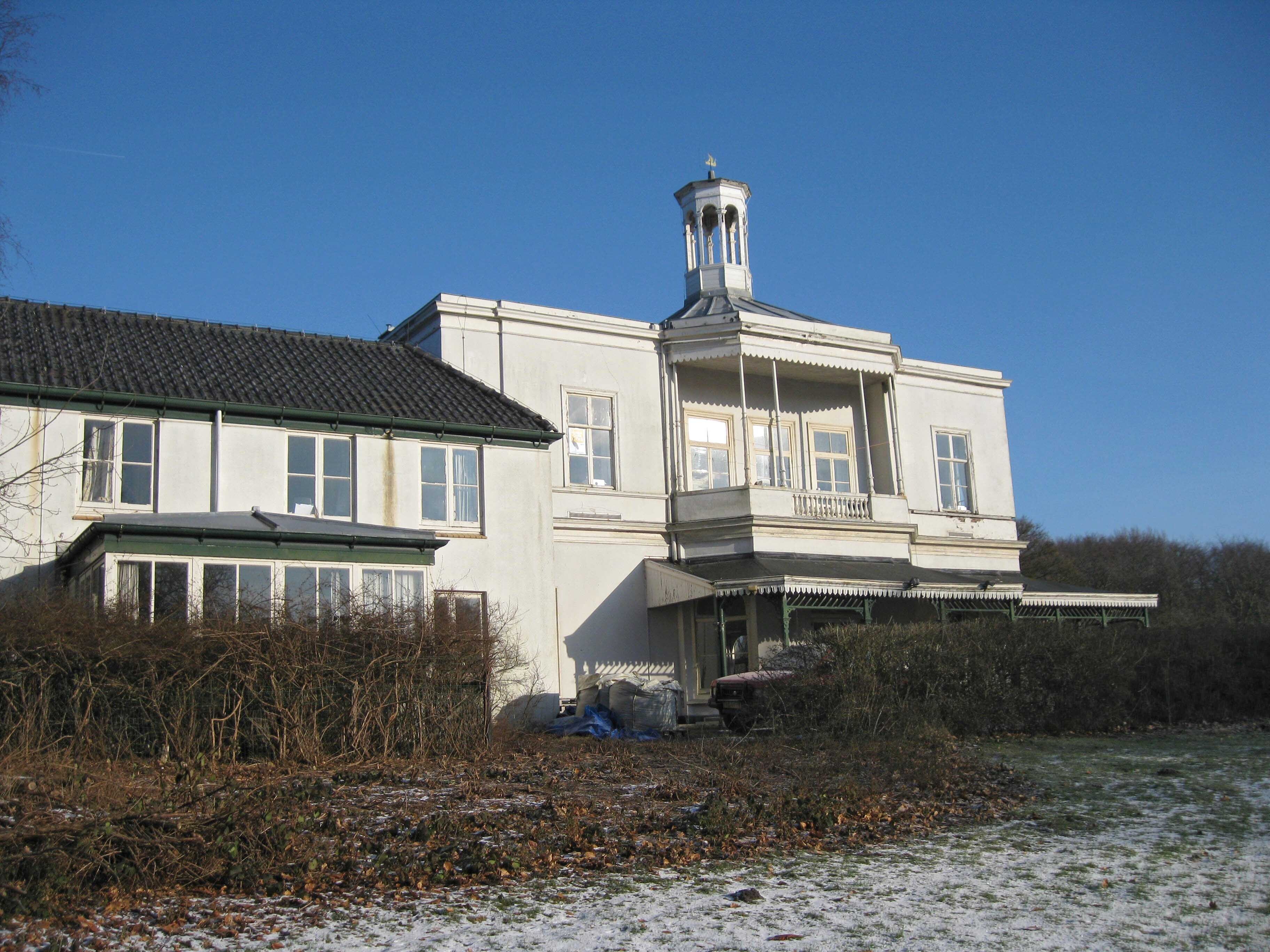Voormalig landhuis op L-vormige plattegrond, bestaande uit twee bouwlagen onder platte daken, met uitzondering van het zinken tentdak boven de middenpartij van de zuidgevel en de lagere aanbouw achter de rechteras van de oostgevel die gedekt is door een mansarde-tentdak. Het zinken tentdak wordt bekroond door een achtkantige houten lantaarn. De gevels zijn gepleisterd. De bouwlagen worden van elkaar gescheiden door een geprofileerde cordonlijst en een brede kroonlijst; de laatste wordt op de middenas van de oostgevel onderbroken. De middenpartij van de zuidgevel bestaat uit een over beide bouwlagen opgetrokken driezijdige erker en veranda. De veranda is voorzien van gietijzeren kolommen die aan de onderzijde balustervormig zijn uitgewerkt en een palmetversiering bezitten. De veranda wordt afgesloten door een gedeeltelijk open balustrade met balusters. De middenas van de oostgevel wordt bekroond door een houten fronton en bezit op de verdieping een rechthoekige houten erker. De assen aan weerszijden zijn iets hoger opgetrokken. Op de begane grond is een over de zuidgevel en tot halverwege de oostgevel doorlopende veranda gesitueerd, waarvan het schuine dak rust op bewerkte houten kolommen op hardstenen neuten. De veranda's en de erker aan de oostgevel zijn allevoorzien van een geschulpte daklijst. De Empire vensters met zes- en achtruits schuif- en stolpramen bezitten op de begane grond getoogde bovenlichten met waaiervormige roeden in Empire stijl. Links van de zuidgevel bevindt zich een langgerekt voormalig stalgebouw van twee bouwlagen onder een met pannen gedekt schilddak. De gepleisterde gevels bevatten vierruits stolpramen. Tegen de voorgevel zijn twee uitbouwen gesitueerd, gedekt door respectievelijk een zinken en een pannen dak. Ter linkerzijde bevindt zich een eenlaags aanbouw op L-vormige plattegrond, gedekt door een pannen schilddak. De muren zijn van witgeschilderde baksteen en bevatten eveneens vierruits stolpramen.