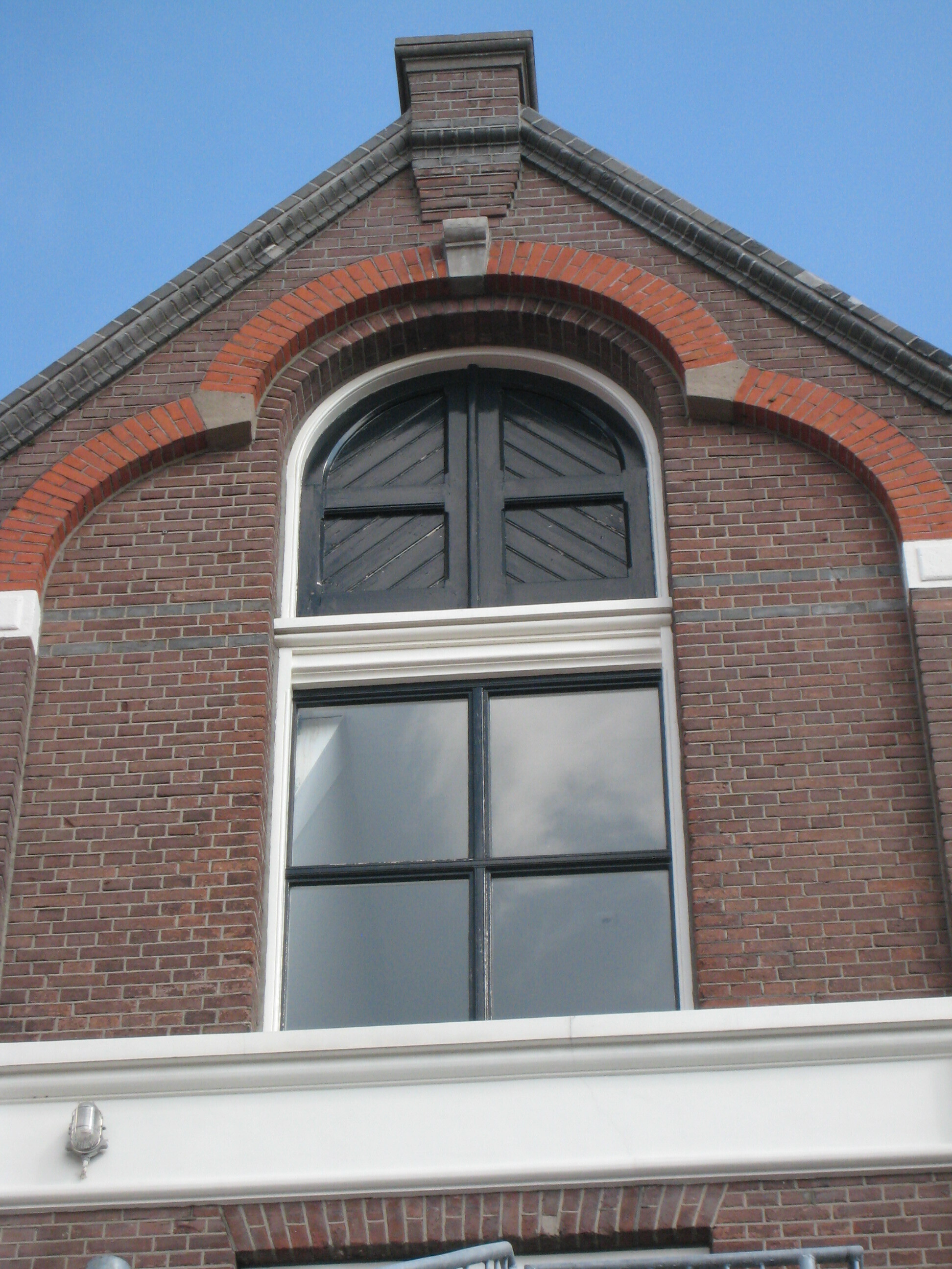 Pand op rechthoekige plattegrond bestaande uit vier bouwlagen en kapverdieping, twee vensterassen breed met dubbele puntgevel onder een deels met pannen en deels met zink gedekte, samengestelde kap. De gevels zijn opgetrokken in schoon metselwerk. De boven de belendende percelen vrij gesitueerde zijgevels zijn blind. De twee vensterassen van de dubbele puntgevel aan de voorzijde bevatten op de begane grond getoogde inrijpoorten met geblokte bogen van rode baksteen en daarboven een reeks hijsluiken, gevat in hoge nissen met driepasbogen van rode baksteen met natuurstenen blokken. De puntgevels hebben hardstenen deklijsten. In de natuurstenen friezen boven de inrijpoorten en die van de derde bouwlaag en in de gepleisterde penant tussen de puntgevels waren oorspronkelijk reclameteksten voor de firma Beekman aangebracht. De authentieke houten inrijpoorten en dubbele hijsdeuren zijn nog aanwezig. Waardering..
