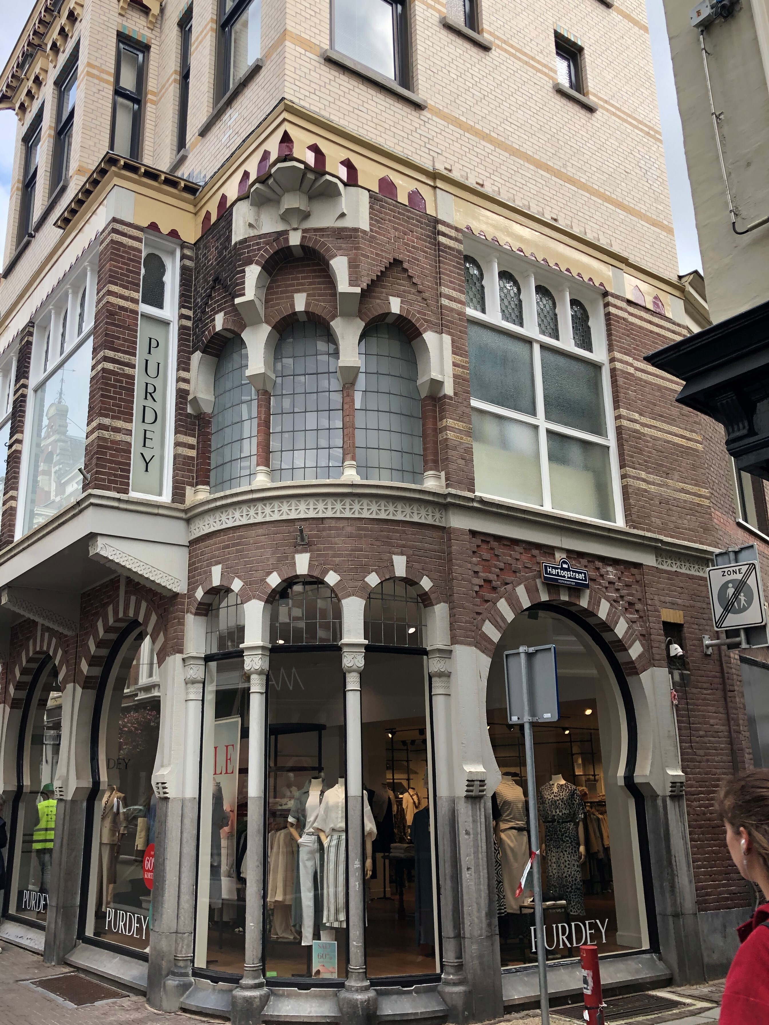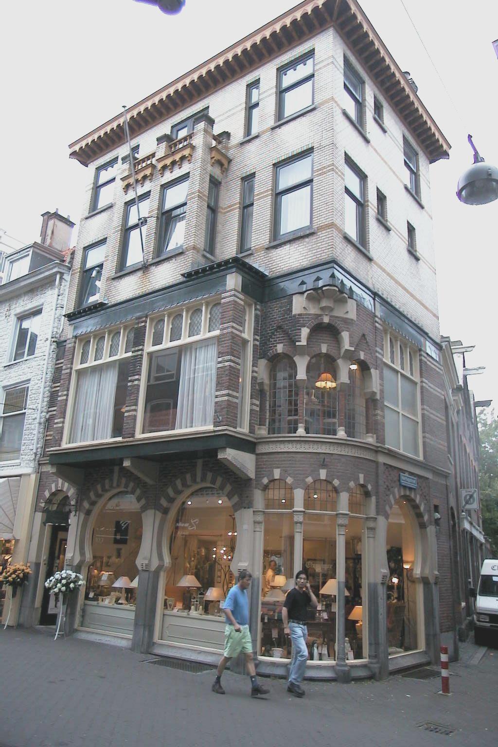 Winkel-woonhuis in overgangsarchitectuur met oriëntaalse kenmerken naar ontwerp van L.A.H. de Wolf, in huidige vorm daterend uit 1912.