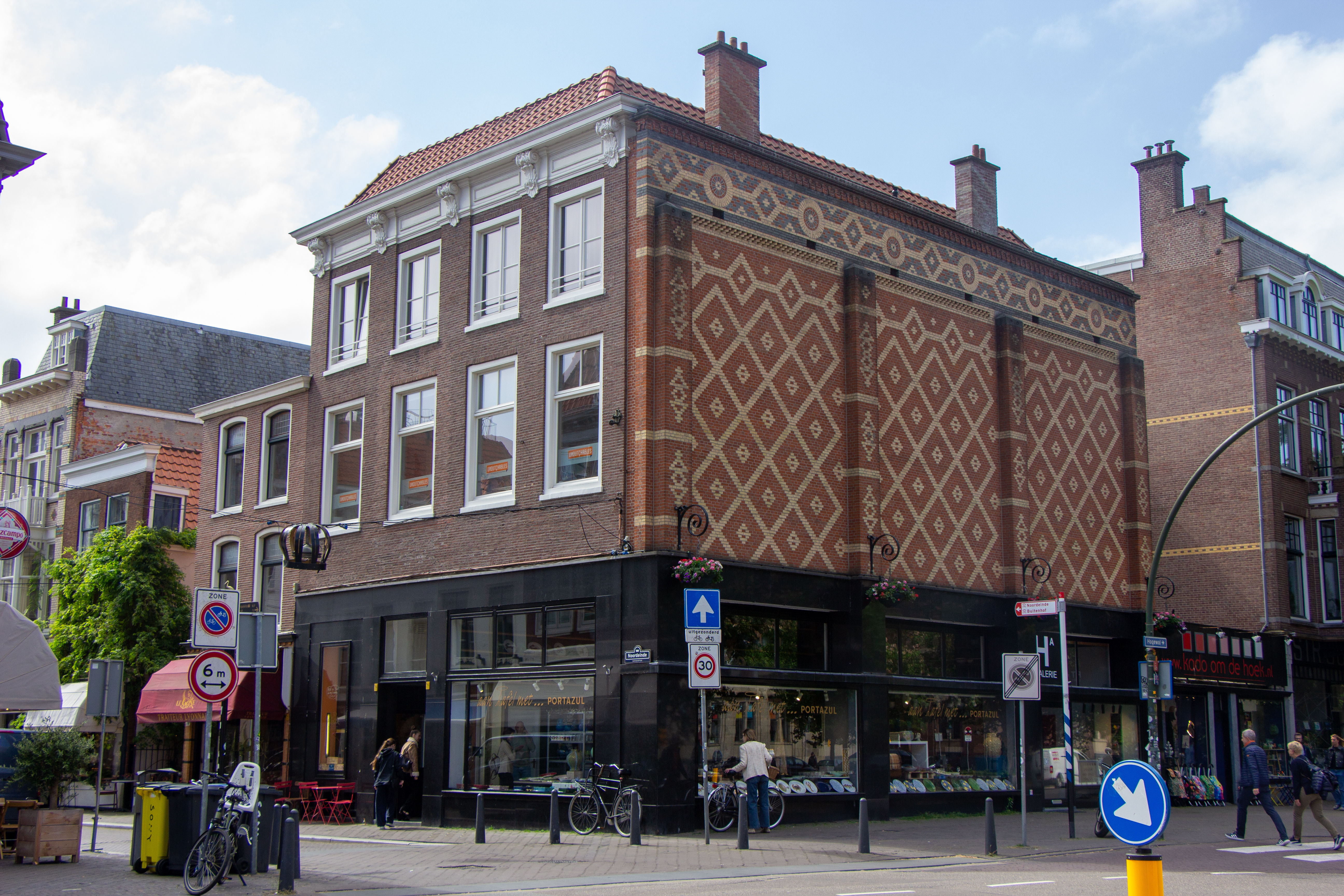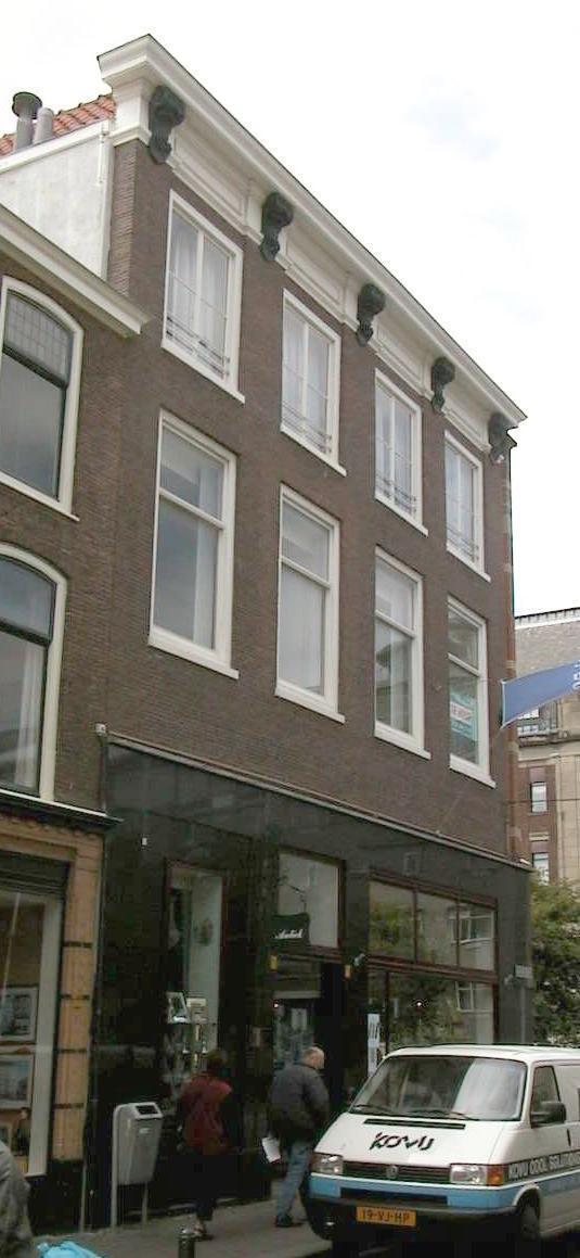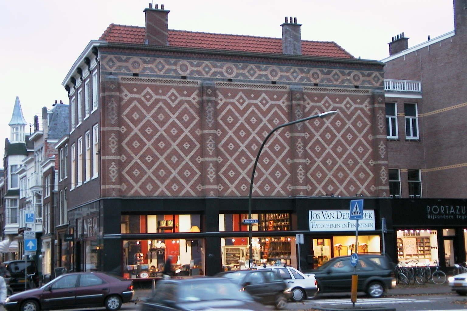 18de-eeuws pand op de hoek van de Hogewal, bestaande uit drie bouwlagen en drie schilddaken met dwars voordak. Lijstgevel uit het tweede kwart van de 18de eeuw met gekornist fries en gesneden Lodewijk XIV consoles onder de houten kroonlijst. Zwart granieten winkelpui uit het eerste kwart van de 20ste eeuw. De zijgevel aan de Hogewal is circa 1900 voorzien van een bekleding met siermetselwerk in patronen van gele, rode en blauwe baksteen. Aan de achterzijde een gepleisterde gevel met houten kroonlijst.