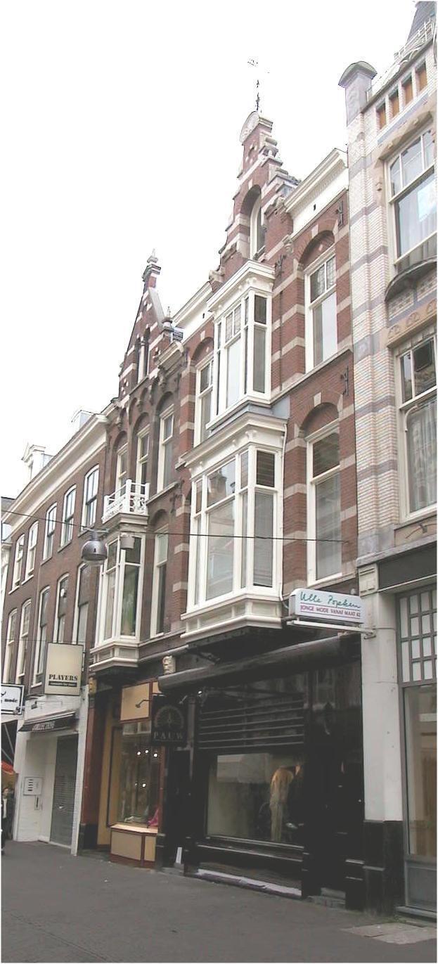 Pand van ca. 1895 met voorgevel in laat-eclectische stijl, waarin voornamelijk neo-renaissance kenmerken; door segmentfronton en smeedijzeren spits bekroonde top die door het klassiek geinspireerde hoofdgestel breekt. In de drie-assige gevel rondboogvensters met ontlastingsbogen en in de middenas erkers. Winkelpui in .Amsterdanse School stijl, ca. 1925, vrijwel authentiek van staat; fraaie toepassing van gebrandschilderd glas en smeedijzerwerk. Pui van hoog architectonisch en ambachtelijk niveau; goed voorbeeld van een stijl die in Den Haag zeldzaam genoemd mag worden.