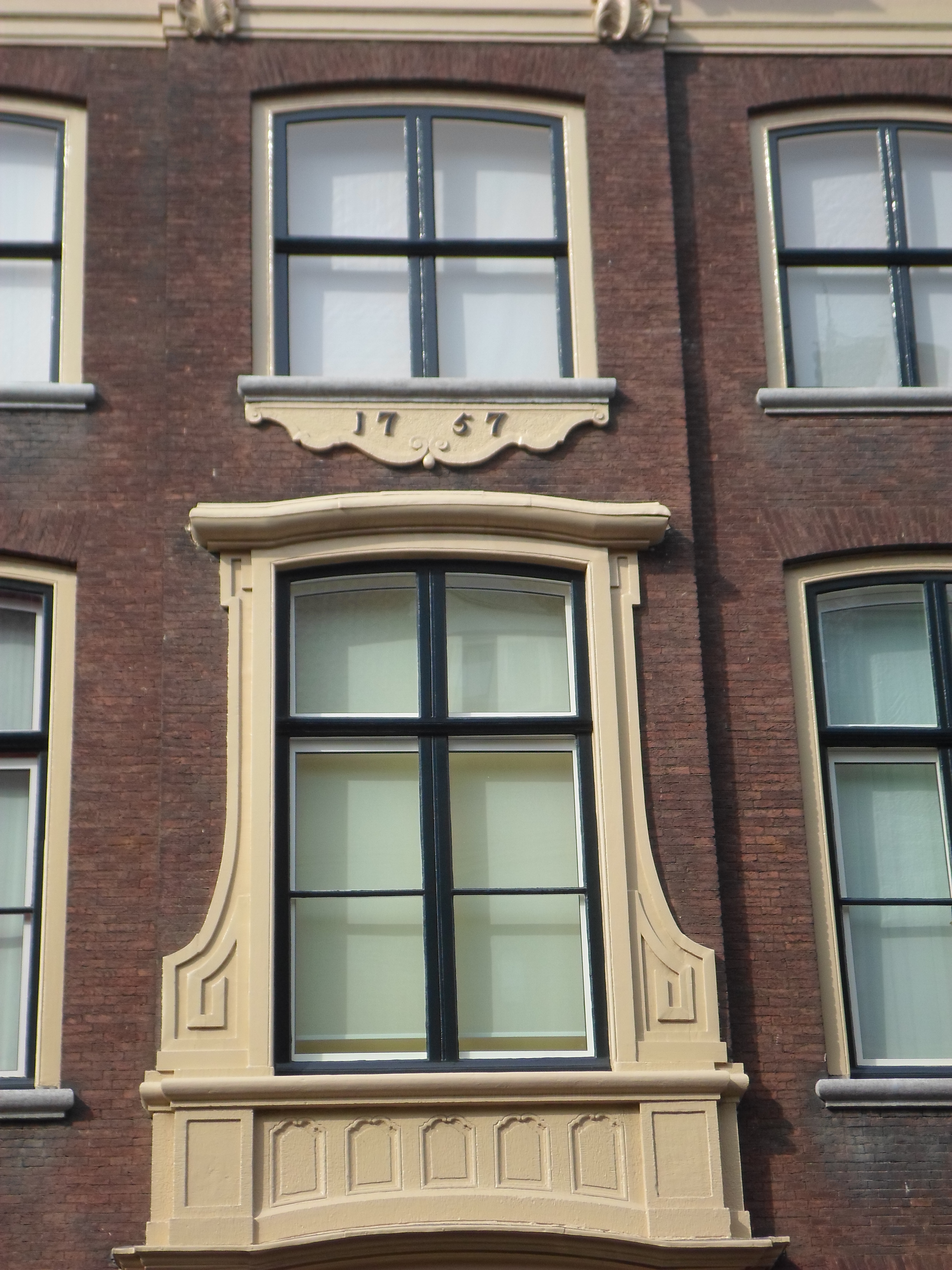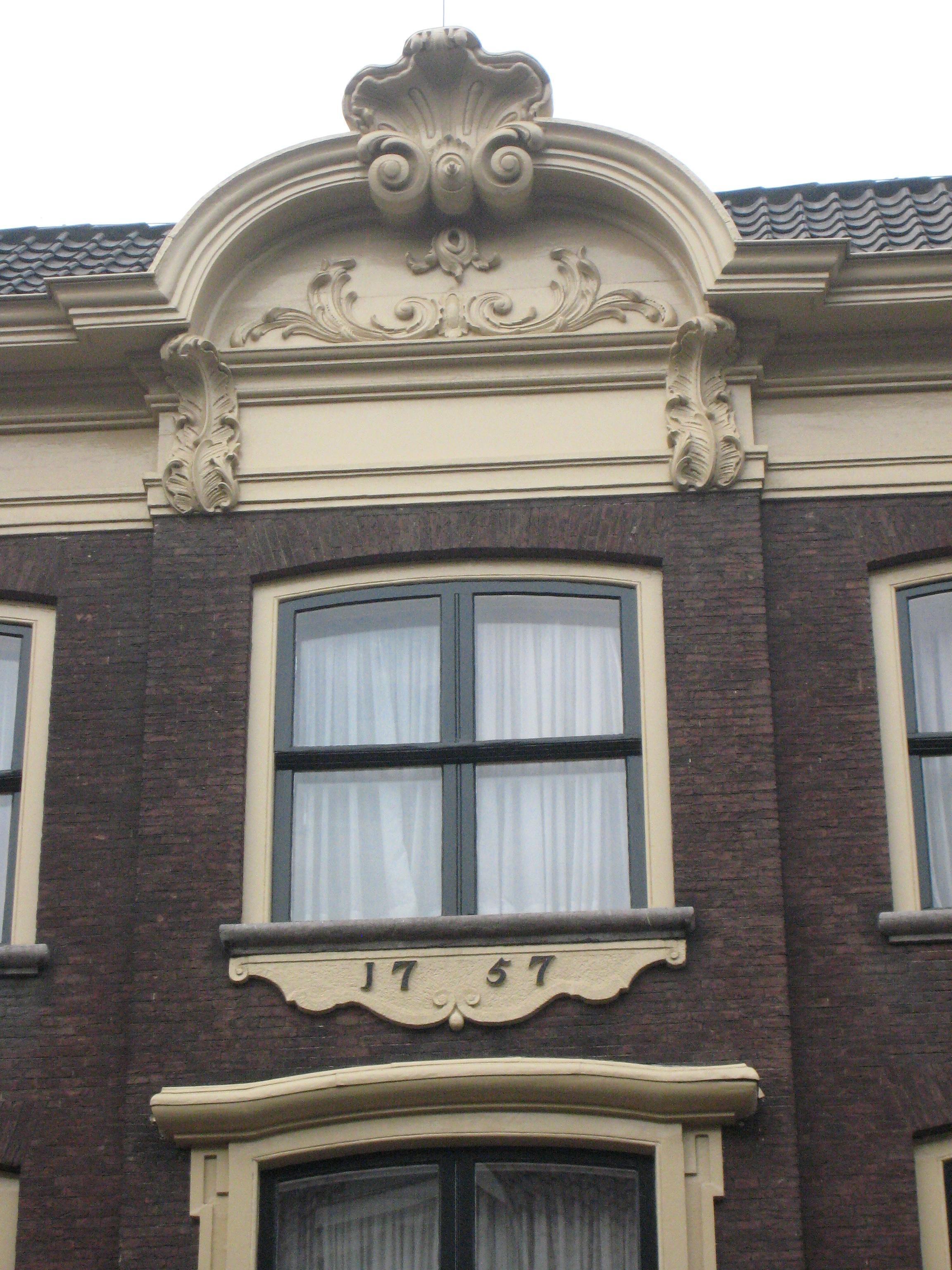Pand met brede bakstenen gevel uit 1757 met versierde ingangspartij en kuifstuk. Trap en interieurs in Lodewijk XV en Empire stijl