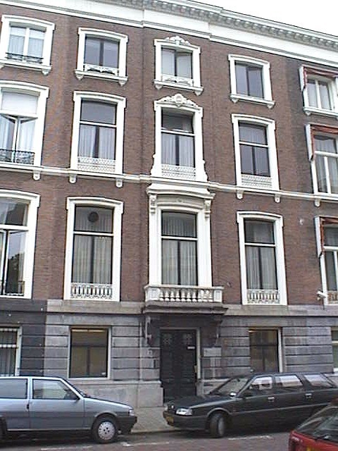 Voormalig herenhuis op rechthoekige plattegrond uit circa 1875 in eclectische stijl ontworpen door de architect J.J. Delia als onderdeel van een ensemble van drie herenhuizen. Omschrijving.