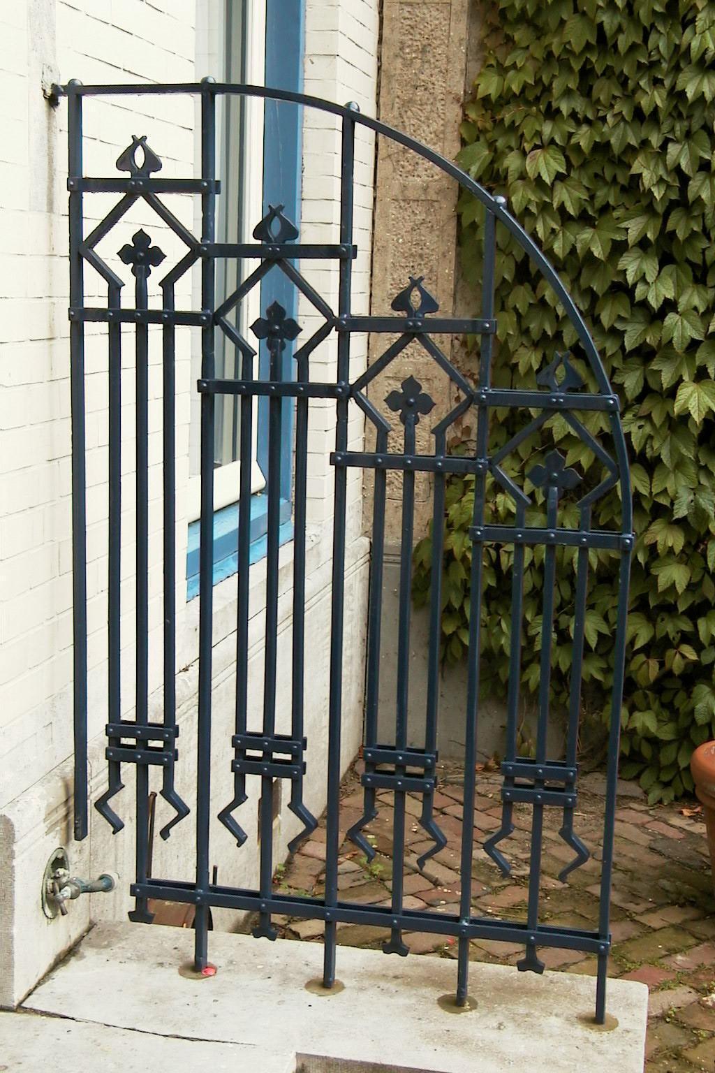 De tuin wordt van de straat gescheiden door een smeedijzeren hek op gemetselde voet.