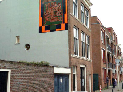 Tegen de linker zijgevel van dit op zichzelf niet beschermde monument bevindt zich een in Art Decostijl geschilderde muurreclame waarop in een rechthoekige omlijsting van afwisselend korte en lange…