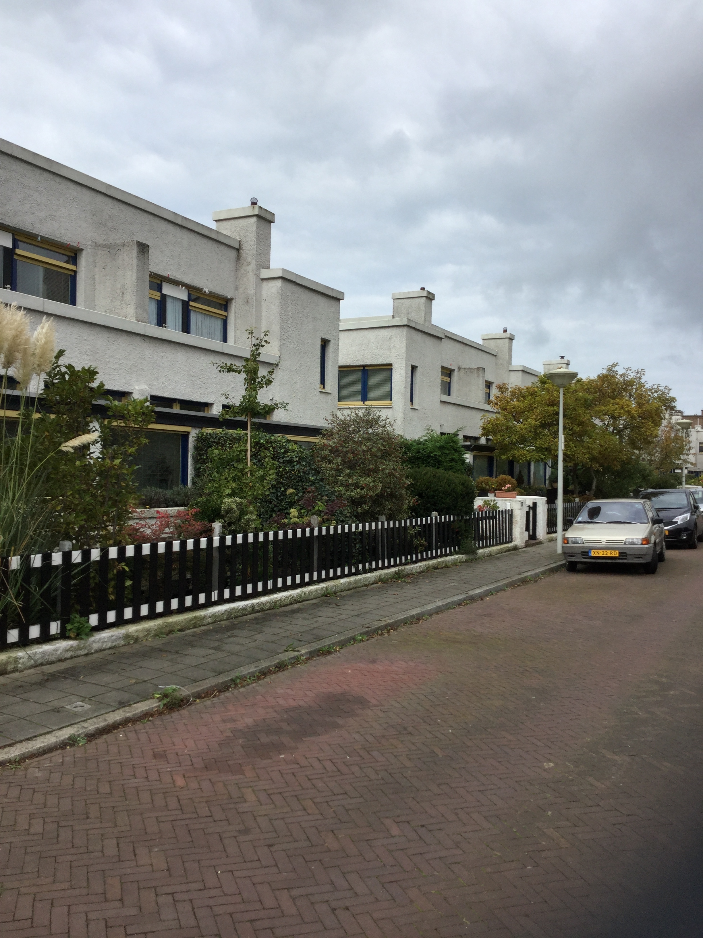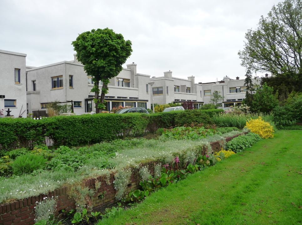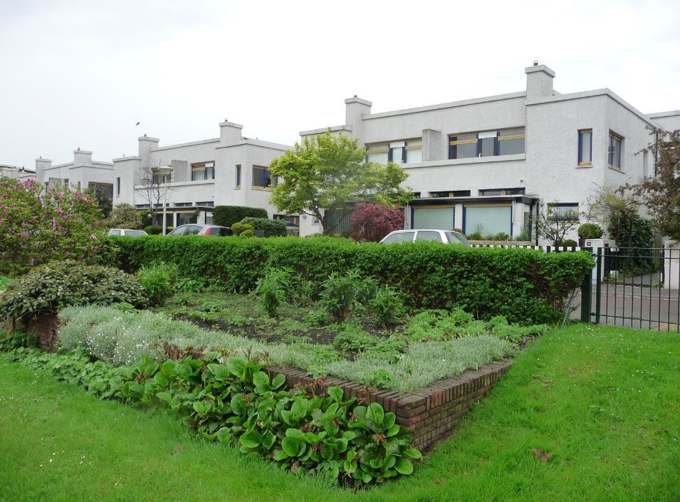 De woningen hebben elk een eigen tuin, omgeven door een houten hek op een lage sokkel tussen blokvormige pijlers van beton; aan de erkers zijn telkens gemetselde bloembakken aangebouwd.