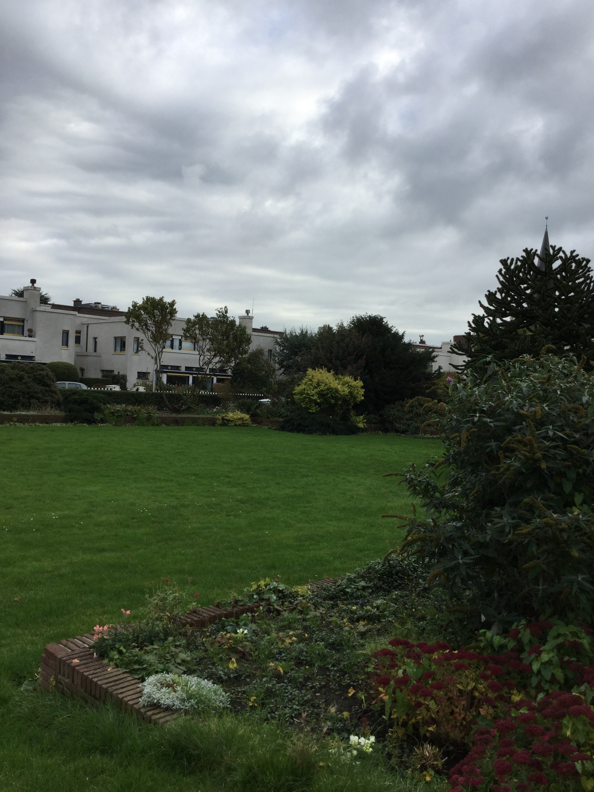 PLANTSOEN. Het gemeenschappelijk plantsoen heeft een trapeziumvormige aanleg, waarbij de gemetselde en met bouwgaten verlevendigde ommuring inspringende hoeken bezit, en aan de lange zijde wordt doorbroken door lage trappen.