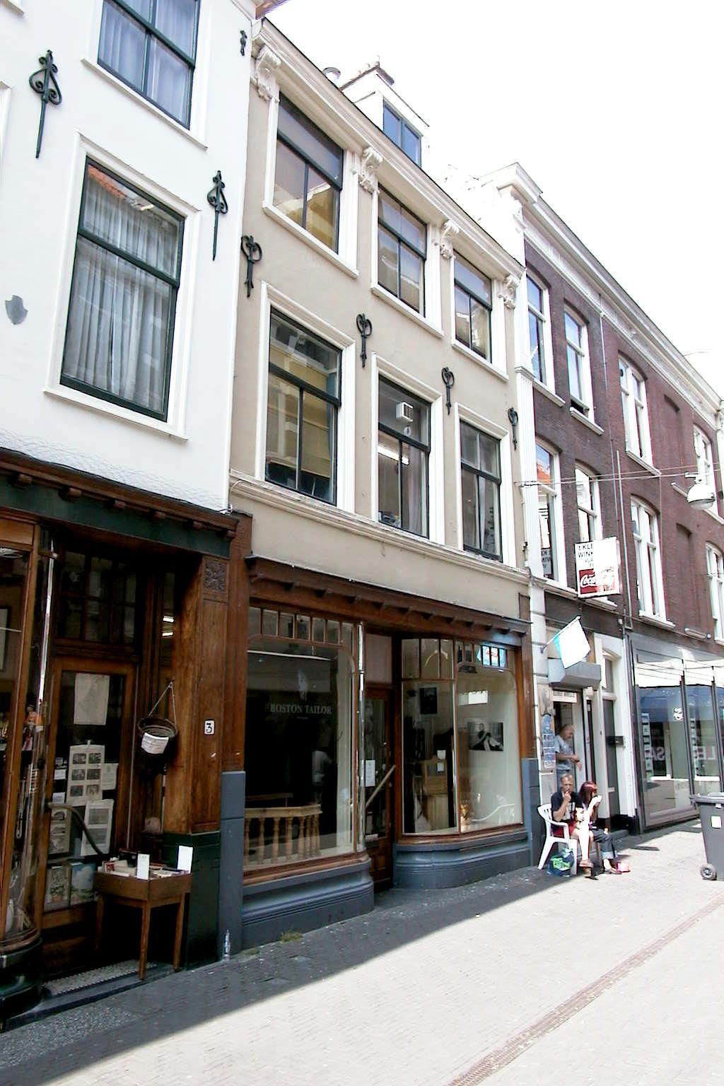 Achttiende eeuws pand met gepleisterde drie-assige lijstgevel, bestaande uit parterre en een verdieping plus zolderverdieping. Dakkapel versoberd. Winkelpui uit c.a.1900. Vensters met zwaar geprofileerde18de eeuwse vensteromlijstingen en dorpels. De vierruitsschuiframen van de zolder verdieping stoten door in het fries; vier Regence consoles.