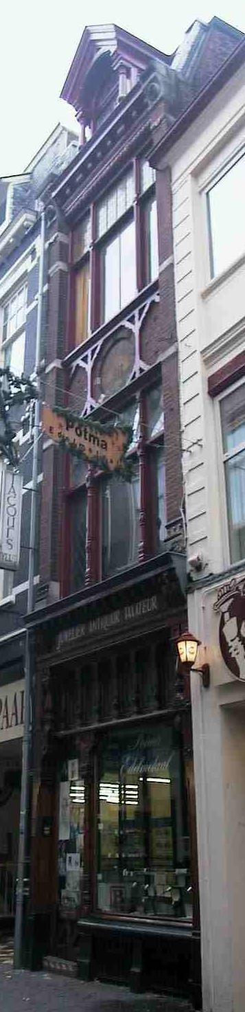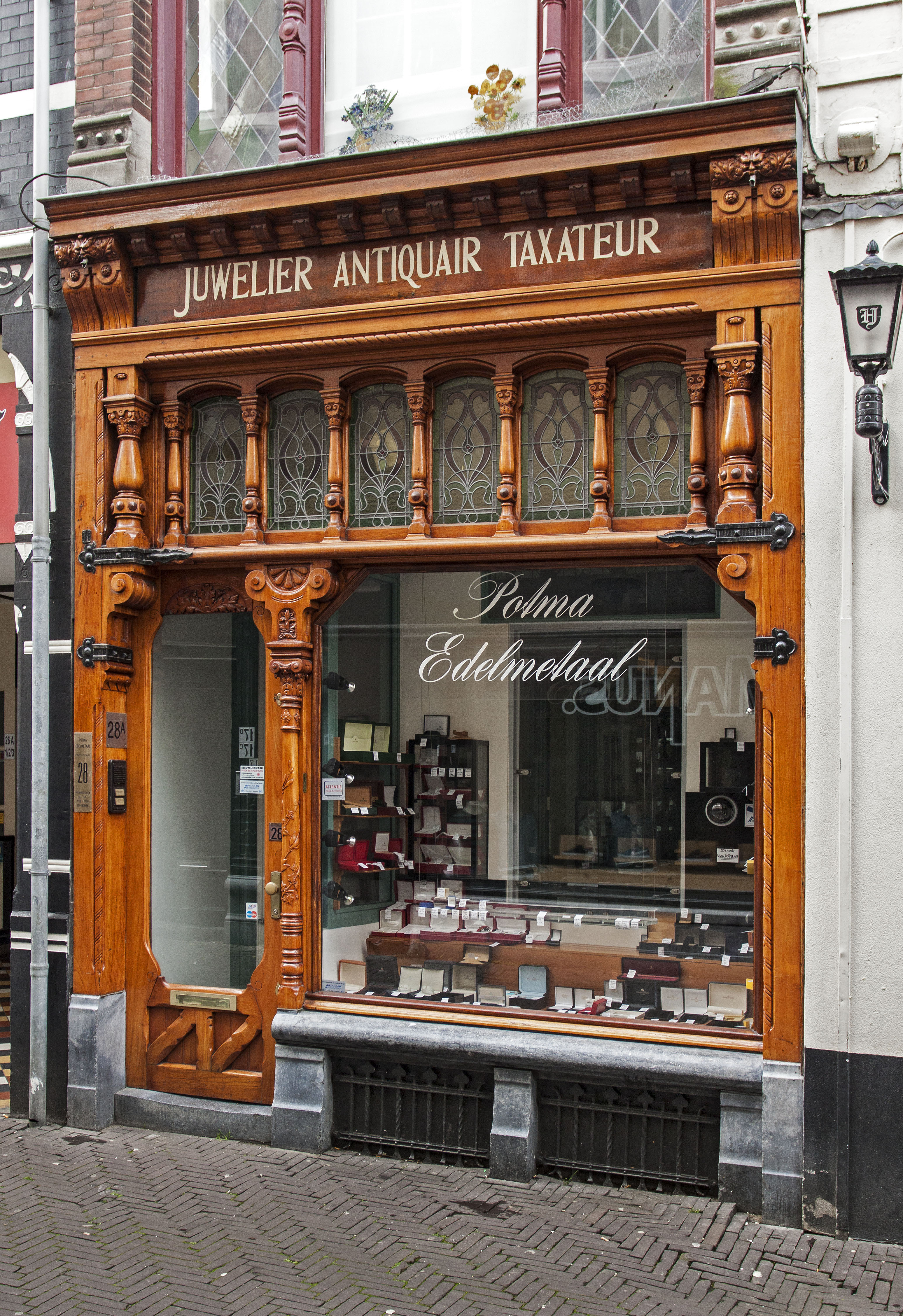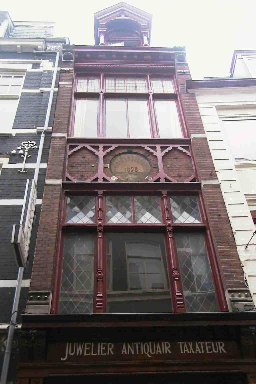 De voorgevel is in hoofdzaak opgebouwd uit hout en glas en vertoont een bijzonder karakteristieke stijl, die ook wel omschreven wordt met het begrip "meubelmakers neo-renaissance". De rijk gesneden houten winkelpui op hardstenen sokkel met kelderluiken heeft een versiering met balusterzuiltjes en consoles en in het bovenlicht glas-in-lood in Art Nouveau. Hierboven een hoofdgestel met kroonlijst op gebeeldhouwde consoles aan weerskanten. De verdiepingvensters hebben driedelige kozijnen, in de eerste verdieping met balusterzuiltjes. Tussen de verdiepingen vakwerk met bakstenen vullingen, waarin het jaartal 1898 is opgenomen. Boven de door consoles gedragen kroonlijst een chaletvormige dakkapel waarvan het overstekende dak gedragen wordt door balusterzuiltjes. Het houtwerk is in de oorspronkelijke rode kleur geschilderd. Een aantal interieurafwerkingen uit de bouwtijd, waaronder lambrizeringen zijn bewaard gebleven. Het winkelinterieur is gemoderniseerd. Waardering.
