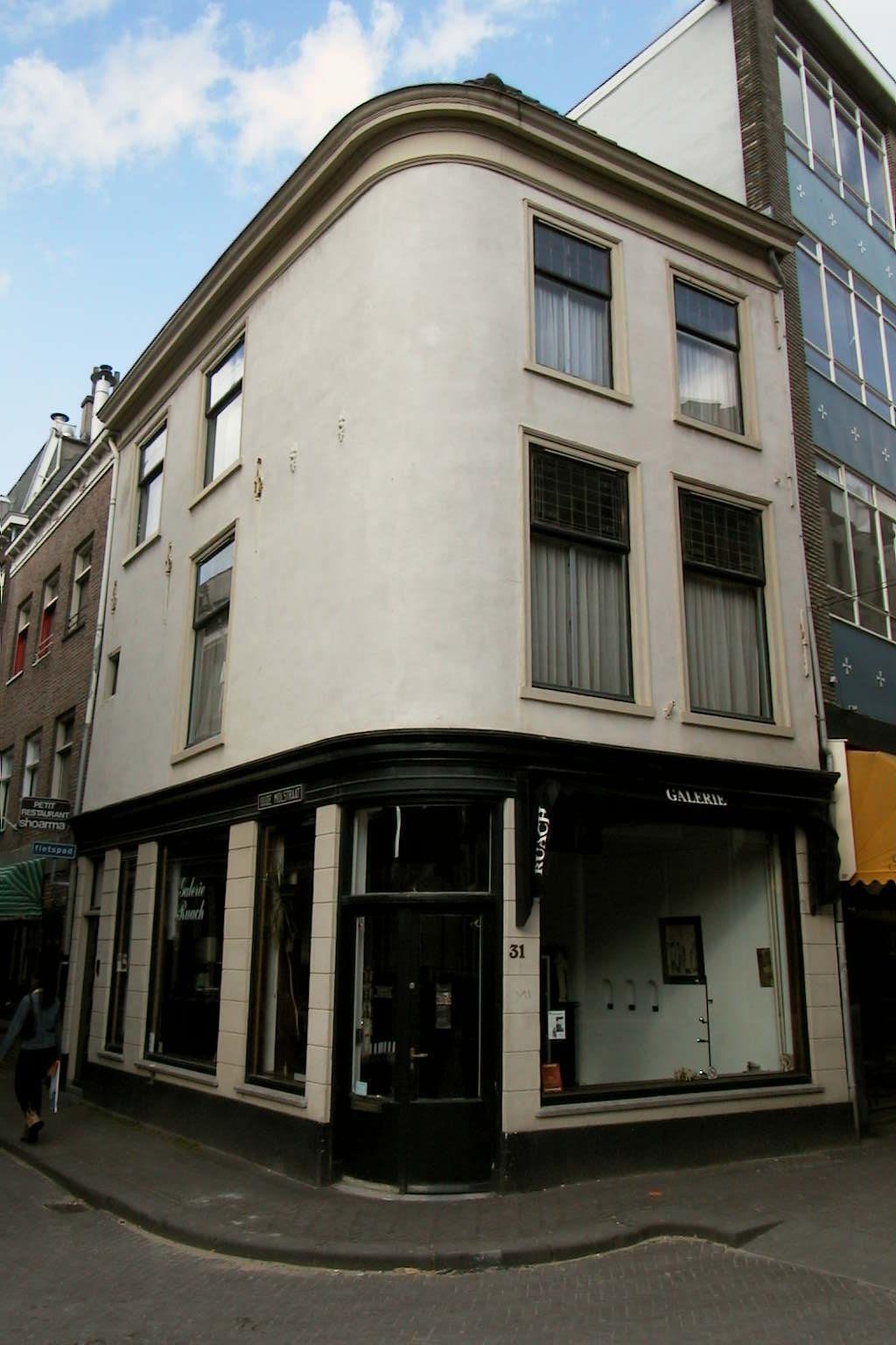 Hoekpand, van karakter 19de eeuws, met rondomgaande lijstgevel die boven de gemoderniseerde pui gepleisterd is. Forse geprofileerde puilijst. Gezien de drie lelieankers in de gevel aan de Oude Molstraat van oorsprong 17de eeuws.