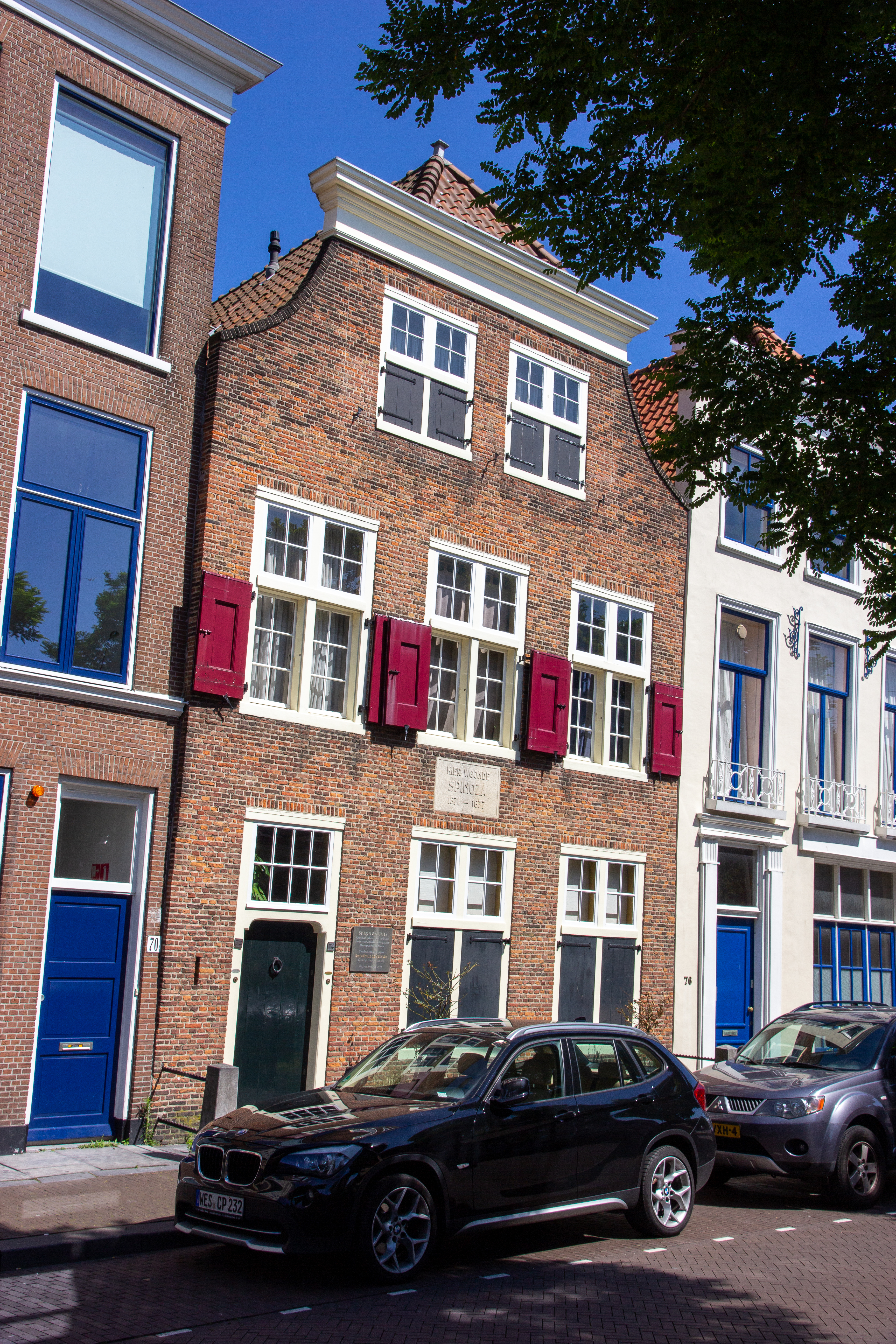 Pand met 17e eeuws ingezwenkte, recht afgedekte halsgevel. Sterfhuis van Spinoza.